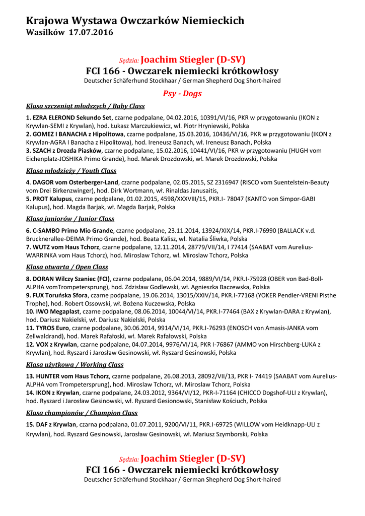 Krajowa Wystawa Owczarków Niemieckich Wasilków 17.07.2016 Sędzia: Joachim Stiegler (D-SV) FCI 166 - Owczarek niemiecki krótkowłosy Deutscher Schäferhund Stockhaar / German Shepherd Dog Short-haired Psy - Dogs Klasa szczeniąt młodszych / Baby Class 1. EZRA ELEROND Sekundo Set, czarne podpalane, 04.02.2016, 10391/VI/16, PKR w przygotowaniu (IKON z Krywlan-SEMI z Krywlan), hod. Łukasz Marczukiewicz, wł. Piotr Hryniewski, Polska 2. GOMEZ I BANACHA z Hipolitowa, czarne podpalane, 15.03.2016, 10436/VI/16, PKR w przygotowaniu (IKON z Krywlan-AGRA I Banacha z Hipolitowa), hod. Ireneusz Banach, wł. Ireneusz Banach, Polska 3. SZACH z Drozda Piasków, czarne podpalane, 15.02.2016, 10441/VI/16, PKR w przygotowaniu (HUGH vom Eichenplatz-JOSHIKA Primo Grande), hod. Marek Drozdowski, wł. Marek Drozdowski, Polska Klasa młodzieży / Youth Class 4. DAGOR vom Osterberger-Land, czarne podpalane, 02.05.2015, SZ 2316947 (RISCO vom Suentelstein-Beauty vom Drei Birkenzwinger), hod. Dirk Wortmann, wł. Rinaldas Janusaitis, 5. PROT Kalupus, czarne podpalane, 01.02.2015, 4598/XXXVIII/15, PKR.I- 78047 (KANTO von Simpor-GABI Kalupus), hod. Magda Barjak, wł. Magda Barjak, Polska Klasa juniorów / Junior Class 6. C-SAMBO Primo Mio Grande, czarne podpalane, 23.11.2014, 13924/XIX/14, PKR.I-76990 (BALLACK v.d. Brucknerallee-DEIMA Primo Grande), hod. Beata Kalisz, wł. Natalia Śliwka, Polska 7. WUTZ vom Haus Tchorz, czarne podpalane, 12.11.2014, 28779/VII/14, I 77414 (SAABAT vom AureliusWARRINKA vom Haus Tchorz), hod. Miroslaw Tchorz, wł. Miroslaw Tchorz, Polska Klasa otwarta / Open Class 8. DORAN Wilczy Szaniec (FCI), czarne podpalane, 06.04.2014, 9889/VI/14, PKR.I-75928 (OBER von Bad-BollALPHA vomTrompetersprung), hod. Zdzisław Godlewski, wł. Agnieszka Baczewska, Polska 9. FUX Toruńska Sfora, czarne podpalane, 19.06.2014, 13015/XXIV/14, PKR.I-77168 (YOKER Pendler-VRENI Pisthe Trophe), hod. Robert Ossowski, wł. Bożena Kuczewska, Polska 10. IWO Megaplast, czarne podpalane, 08.06.2014, 10044/VI/14, PKR.I-77464 (BAX z Krywlan-DARA z Krywlan), hod. Dariusz Nakielski, wł. Dariusz Nakielski, Polska 11. TYROS Euro, czarne podpalane, 30.06.2014, 9914/VI/14, PKR.I-76293 (ENOSCH von Amasis-JANKA vom Zellwaldrand), hod. Marek Rafałoski, wł. Marek Rafałowski, Polska 12. VOX z Krywlan, czarne podpalane, 04.07.2014, 9976/VI/14, PKR I-76867 (AMMO von Hirschberg-LUKA z Krywlan), hod. Ryszard i Jarosław Gesinowski, wł. Ryszard Gesinowski, Polska Klasa użytkowa / Working Class 13. HUNTER vom Haus Tchorz, czarne podpalane, 26.08.2013, 28092/VII/13, PKR I- 74419 (SAABAT vom AureliusALPHA vom Trompetersprung), hod. Miroslaw Tchorz, wł. Miroslaw Tchorz, Polska 14. IKON z Krywlan, czarne podpalane, 24.03.2012, 9364/VI/12, PKR-I-71164 (CHICCO Dogshof-ULI z Krywlan), hod. Ryszard i Jarosław Gesinowski, wł. Ryszard Gesionowski, Stanisław Kościuch, Polska Klasa championów / Champion Class 15. DAF z Krywlan, czarna podpalana, 01.07.2011, 9200/VI/11, PKR.I-69725 (WILLOW vom Heidknapp-ULI z Krywlan), hod. Ryszard Gesinowski, Jarosław Gesinowski, wł. Mariusz Szymborski, Polska Sędzia: Joachim Stiegler (D-SV) FCI 166 - Owczarek niemiecki krótkowłosy Deutscher Schäferhund Stockhaar / German Shepherd Dog Short-haired Suki – Bitches Klasa szczeniąt młodszych / Baby Class 16. ELZA Sekundo Set, czarne podpalane, 04.02.2016, 10433/VI/16, PKR w przygotowaniu (IKON z Krywlan-SEMI z Krywlan), hod. Łukasz Marczukiewicz, wł. Łukasz Marczukiewicz, Polska 17. YOSHI Kalupus, czarne podpalane, 28.01.2016, 4800/XXXVIII/16, PKR w przygotowaniu (FULZ di ZenevredoXARA Kalupus), hod. Magda Barjak, wł. Magda Barjak, , Polska 18. YOSHI Trebortim, czarne, 01.03.2016, 51230/VIII/16, PKR w przygotowaniu (VABO vom Osterberger LandSIERRA MADERA Wan-Hen), hod. Robert Filipowiak, wł. Robert Filipowiak, Polska Klasa szczeniąt / Puppy Class 19. HAGA Primo Mio Grande, czarne podpalane, 12.12.2015, 12652/V15, PKR.I-80266 LC (GARY vom HuhnegrabJAKUTA Primo Grande), hod. Beata Kalisz, wł. Radosław Rokitka, Polska 20. MESSA z Leśnego Justynowa, czarne podpalane, 08.12.2015 , 36278/XXII/15, PKR w przygotowaniu (SKY vom Altenberger Land-KSARA z Leśnego Justynowa), hod. Sylwester Lisowski, wł. Sylwester Lisowski, Polska 21. TAIA Gven Blaid, czarne podpalane, 11.12.2015, BCU 166-031225 (TSENTRAL Gven Blaid-ARMANIA Gven Blaid), hod. Nina Novik, wł. Nina Novik, Polska Klasa młodzików / Puppy Class 22. BESSI von Eichenplatz, czarne podpalane, 11.09.2015, 33915/x/15, vdh/sz 2319623 (GROOVY di Casa Massarelli-NELLI vom Zellergrund), wł. Grzegorz Skrocki, Polska 23. FIGA Hodowla pod Stawami, czarne podpalane, 10.10.2015, 10359/VI/15, PKR.I-80336 (HOREX vom Fiemereck-CARMEN Hexenland), hod. Wojciech Stachurski, wł. Wojciech Stachurski, Polska 24. YULIANA z Azovskogo Berega, czarne podpalane, 02.08.2015, 05x2675c1119215, PKR w przygotowaniu (Quattro von der Partnchklamm-Olita z Azovskogo Berega), hod. A.E. Chasovskikh, wł. A. Chasovskih, Klasa młodzieży / Youth Class 25. BASURA vom Haus Tchorz, czarne podpalane, 29.06.2015, 10460/XVIII/15, PKR.I-79952 (HUNTER vom Haus Tchorz-ESPERANZA vom Nordteich), hod. Mirosław Tchorz, wł. Zdzisław Łukasik, Polska 26. DONA z Krywlan, czarne podpalane, 28.01.2015, 10300/XVIII/15, PKR.I-77681 (CEDRO z Leśnego JustynowaZORKA Z KRYWLAN), hod. Ryszard , Jarosław Gesinowski, wł. Marcin Zaniecki, Polska 27. EZRA Armagedonas, czarne podpalane, 07.04.2015, LSVK DS 8017/15 (FRED vom Rumbachtal-KIM vom Holtkamper Hof), hod. Andrej Napolov, wł. Andrej Napolov, 28. GOLDI Wypusty, czarne podpalane, 06.06.2015, 10232/VI/15, PKR.I-79440 (MAXIMUS aus der BrunnenstraseFILLA Artrox), hod. Sławomir Skorupa, wł. Sławomir Skorupa, Polska 29. KEMERRI Gven Blaid, czarne podpalane, 20.05.2015, BCU 166-030829 (TSENTRAL Gven Blaid-DIONA Gven Blaid), hod. Nina Novik, wł. Olga Sedlyukovskaya, 30. KRAINA Gven Blaid czarne podpalane, 20.05.2015, BCU 166-030831, PKR.I-80103 (TSENTRAL Gven BLAIDDIONA Gven Blaid), hod. Nin