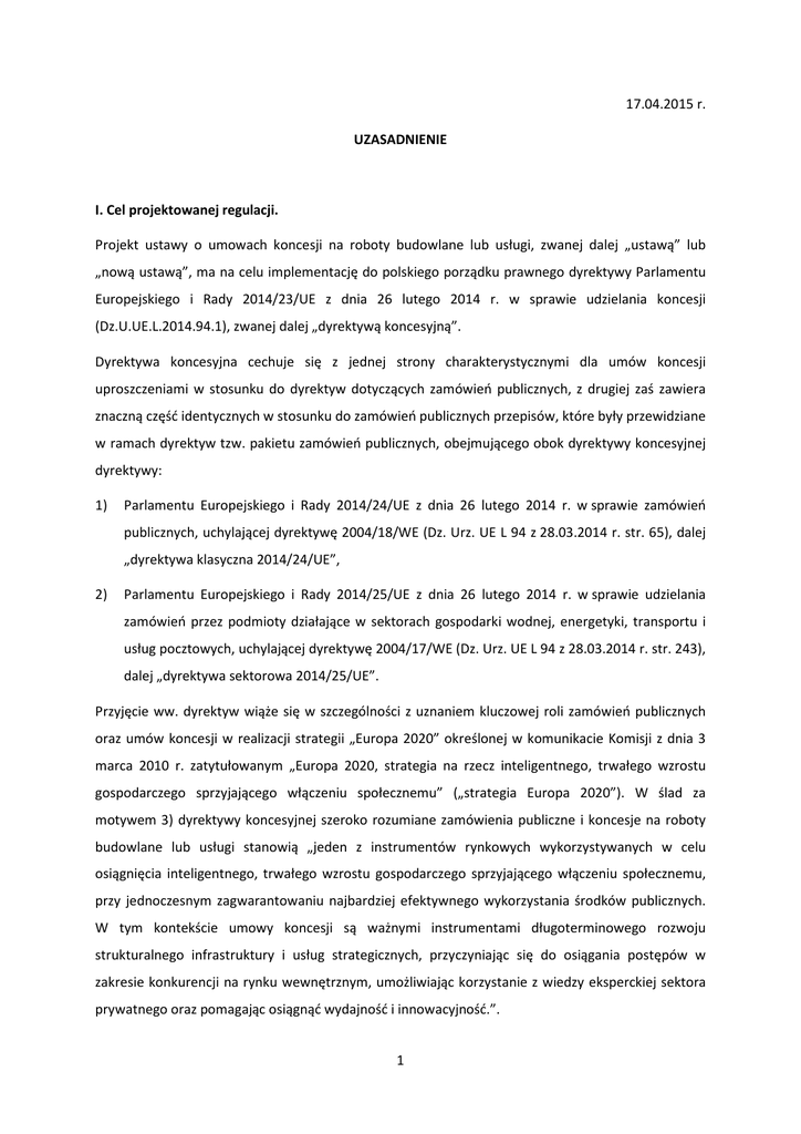 17.04.2015 r. UZASADNIENIE I. Cel projektowanej regulacji. Projekt ustawy o umowach koncesji na roboty budowlane lub usługi, zwanej dalej „ustawą” lub „nową ustawą”, ma na celu implementację do polskiego porządku prawnego dyrektywy Parlamentu Europejskiego i Rady 2014/23/UE z dnia 26 lutego 2014 r. w sprawie udzielania koncesji (Dz.U.UE.L.2014.94.1), zwanej dalej „dyrektywą koncesyjną”. Dyrektywa koncesyjna cechuje się z jednej strony charakterystycznymi dla umów koncesji uproszczeniami w stosunku do dyrektyw dotyczących zamówień publicznych, z drugiej zaś zawiera znaczną część identycznych w stosunku do zamówień publicznych przepisów, które były przewidziane w ramach dyrektyw tzw. pakietu zamówień publicznych, obejmującego obok dyrektywy koncesyjnej dyrektywy: 1) Parlamentu Europejskiego i Rady 2014/24/UE z dnia 26 lutego 2014 r. w sprawie zamówień publicznych, uchylającej dyrektywę 2004/18/WE (Dz. Urz. UE L 94 z 28.03.2014 r. str. 65), dalej „dyrektywa klasyczna 2014/24/UE”, 2) Parlamentu Europejskiego i Rady 2014/25/UE z dnia 26 lutego 2014 r. w sprawie udzielania zamówień przez podmioty działające w sektorach gospodarki wodnej, energetyki, transportu i usług pocztowych, uchylającej dyrektywę 2004/17/WE (Dz. Urz. UE L 94 z 28.03.2014 r. str. 243), dalej „dyrektywa sektorowa 2014/25/UE”. Przyjęcie ww. dyrektyw wiąże się w szczególności z uznaniem kluczowej roli zamówień publicznych oraz umów koncesji w realizacji strategii „Europa 2020” określonej w komunikacie Komisji z dnia 3 marca 2010 r. zatytułowanym „Europa 2020, strategia na rzecz inteligentnego, trwałego wzrostu gospodarczego sprzyjającego włączeniu społecznemu” („strategia Europa 2020”). W ślad za motywem 3) dyrektywy koncesyjnej szeroko rozumiane zamówienia publiczne i koncesje na roboty budowlane lub usługi stanowią „jeden z instrumentów rynkowych wykorzystywanych w celu osiągnięcia inteligentnego, trwałego wzrostu gospodarczego sprzyjającego włączeniu społecznemu, przy jednoczesnym zagwarantowaniu najbardziej efektywnego wykorzystania środków publicznych. W tym kontekście umowy koncesji są ważnymi instrumentami długoterminowego rozwoju strukturalnego infrastruktury i usług strategicznych, przyczyniając się do osiągania postępów w zakresie konkurencji na rynku wewnętrznym, umożliwiając korzystanie z wiedzy eksperckiej sektora prywatnego oraz pomagając osiągnąć wydajność i innowacyjność.”. 1 Celem uchwalenia dyrektywy koncesyjnej było ograniczenie niepewności prawnej przy udzielaniu koncesji oraz sprzyjanie publicznym i prywatnym inwestycjom w infrastrukturę i usługi strategiczne, przy zapewnieniu najlepszego stosunku jakości do ceny, w tym ułatwienie realizacji projektów w formule partnerstwa publiczno – prywatnego. Przyjęcie w 2014 r. przez Parlament Europejski i Radę nowej dyrektywy koncesyjnej otworzyło drogę do wprowadzenia zupełnie nowych rozwiązań w zakresie zawierania umów koncesji na roboty budowlane lub usługi, których celem jest wykonywanie zadań publicznych związanych z rozwojem infrastruktury oraz usług dla obywateli, z uwzględnieniem jak największej dostępności tych rozwiązań dla wykonawców, w tym małych i średnich przedsiębiorstw. Celem projektowanej regulacji jest wprowadzenie jasnych i przejrzystych zasad oraz procedur udzielania zamówień w drodze umów koncesji na roboty budowlane lub usługi, zapewniających zgodność z obowiązującym w tym zakresie prawem Unii Europejskiej. Ze względu na wynikającą z dyrektywy koncesyjnej skalę zmian w stosunku do dotychczasowych przepisów krajowych i nowy sposób regulacji unijnej, uznano za konieczne opracowanie projektu nowej ustawy o koncesjach zamiast dokonywania nowelizacji obowiązującej obecnie ustawy z dnia 9 stycznia 2009 r. o koncesji na roboty budowlane lub usługi (Dz. U. z 2015 r., poz. 113). Do prawa krajowego proponuje się wdrożyć uregulowania prawa unijnego dotyczące: 1. definicji umowy koncesji na roboty budowlane lub usługi, 2. konieczności przeniesienia na koncesjonariusza ryzyka operacyjnego związanego z eksploatacją obiektów budowlanych lub wykonywaniem usług, które obejmuje ryzyka związane z popytem lub podażą, albo oba te ryzyka, jak również zdefiniowania wymienionych ryzyk w celu precyzyjnego odróżnienia umów koncesji na roboty budowlane lub usługi od zamówień publicznych, 3. rozszerzenia zakresu podmiotowego zastosowania przepisów o umowach koncesji poprzez umożliwienie zamawiającym sektorowym zawierania umów koncesji na roboty budowlane lub usługi, 4. szacowania wartości umowy koncesji na roboty budowlane lub usługi, poprzez odniesienie jej do całkowitego obrotu koncesjonariusza uzyskanego w okresie obowiązywania umowy z tytułu wynagrodzenia za roboty budowlane lub usługi, będące przedmiotem umowy koncesji, z uwzględnieniem m.in. opcji i przedłużeń okresu obowiązywania umowy koncesji, przychodów z opłat i kar uiszczanych przez użytkowników, dotacji lub innych korzyści finansowych uzyskiwanych z tytułu realizacji umowy koncesji, 2 5. ukształtowania wyłączeń obowiązku stosowania przepisów dotyczących umów koncesji w sposób analogiczny do wyłączeń obowiązku stosowania ustawy Prawo zamówień publicznych do udzielania zamówień publicznych: klasycznych, sektorowych oraz w dziedzinach obronności i bezpieczeństwa, ze szczególnym uwzględnieniem wyłączeń dot. in-house, inhouse odwróconego i wspólnego oraz współpracy publiczno-publicznej, 6. obowiązku stosowania przepisów o umowach koncesji na roboty budowlane lub usługi do zawierania umów koncesji o szacunkowej wartości równej lub wyższej od progu unijnego przewidzianego w dyrektywie koncesyjnej dla robót budowlanych oraz aktualizacji tego progu zgodnie z wydawanym co dwa lata rozporządzeniem i komunikatem Komisji Europejskiej oraz komunikatem Prezesa Urzędu, za