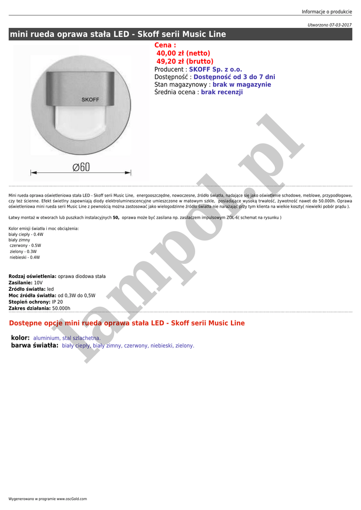 Informacje o produkcie Utworzono 07-03-2017 mini rueda oprawa stała LED - Skoff serii Music Line Cena : 40,00 zł (netto) 49,20 zł (brutto) l.p l Producent : SKOFF Sp. z o.o. Dostępność : Dostępność od 3 do 7 dni Stan magazynowy : brak w magazynie Średnia ocena : brak recenzji Mini rueda oprawa oświetleniowa stała LED - Skoff serii Music Line, energooszczędne, nowoczesne, źródło światła, nadające się jako oświetlenie schodowe, meblowe, przypodłogowe, czy też ścienne. Efekt świetlny zapewniają diody elektroluminescencyjne umieszczone w matowym szkle, posiadające wysoką trwałość, żywotność nawet do 50.000h. Oprawa oświetleniowa mini rueda serii Music Line z pewnością można zastosować jako wielogodzinne źródło światła nie narażając przy tym klienta na wielkie koszty( niewielki pobór prądu ). m po Łatwy montaż w otworach lub puszkach instalacyjnych 50, oprawa może być zasilana np. zasilaczem impulsowym ZOL-6( schemat na rysunku ) Kolor emisji światła i moc obciążenia: biały ciepły - 0.4W biały zimny czerwony - 0.5W zielony - 0.3W niebieski - 0.4W Rodzaj oświetlenia: oprawa diodowa stała Zasilanie: 10V Źródło światła: led Moc źródła światła: od 0,3W do 0,5W Stopień ochrony: IP 20 Zakres działania: 50.000h la Dostępne opcje mini rueda oprawa stała LED - Skoff serii Music Line kolor: aluminium, stal szlachetna. barwa światła: biały ciepły, biały zimny, czerwony, niebieski, zielony. Wygenerowano w programie www.oscGold.com