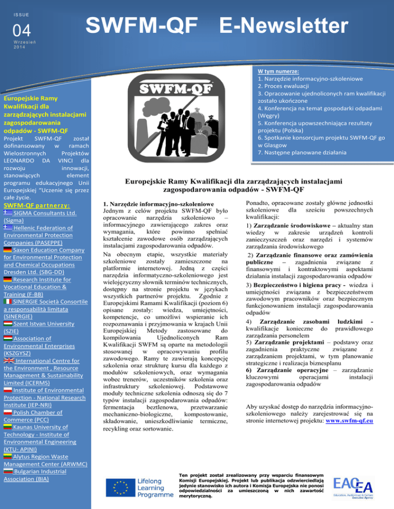 ISSUE SWFM-QF E-Newsletter 04 Wrzesień 2014 Bomba W tym numerze: 1. Narzędzie informacyjno-szkoleniowe 2. Proces ewaluacji 3. Opracowanie ujednoliconych ram kwalifikacji zostało ukończone 4. Konferencja na temat gospodarki odpadami (Węgry) 5. Konferencja upowszechniająca rezultaty projektu (Polska) 6. Spotkanie konsorcjum projektu SWFM-QF go w Glasgow 7. Następne planowane działania Europejskie Ramy Kwalifikacji dla zarządzających instalacjami zagospodarowania odpadów - SWFM-QF Projekt SWFM-QF został dofinansowany w ramach Wielostronnych Projektów LEONARDO DA VINCI dla rozwoju innowacji, stanowiących element programu edukacyjnego Unii Europejskiej “Uczenie się przez całe życie. SWFM-QF partnerzy: SIGMA Consultants Ltd. (Sigma) Hellenic Federation of Environmental Protection Companies (PASEPPE) Saxon Education Company for Environmental Protection and Chemical Occupations Dresden Ltd. (SBG-DD) Research Institute for Vocational Education & Training (F-BB) SINERGIE Società Consortile a responsabilità limitata (SINERGIE) Szent Istvan University (SZIE) Association of Environmental Enterprises (KSZGYSZ) International Centre for the Environment , Resource Management & Sustainability Limited (ICERMS) Institute of Environmental Protection - National Research Institute (IEP-NRI) Polish Chamber of Commerce (PCC) Kaunas University of Technology - Institute of Environmental Engineering (KTU- APINI) Alytus Region Waste Management Center (ARWMC) Bulgarian Industrial Association (BIA) Europejskie Ramy Kwalifikacji dla zarządzających instalacjami zagospodarowania odpadów - SWFM-QF 1. Narzędzie informacyjno-szkoleniowe Jednym z celów projektu SWFM-QF było opracowanie narzędzia szkoleniowo – informacyjnego zawierającego zakres oraz wymagania, które powinno spełniać kształcenie zawodowe osób zarządzających instalacjami zagospodarowania odpadów. Na obecnym etapie, wszystkie materiały szkoleniowe zostały zamieszczone na platformie internetowej. Jedną z części narzędzia informatyczno-szkoleniowego jest wielojęzyczny słownik terminów technicznych, dostępny na stronie projektu w językach wszystkich partnerów projektu. Zgodnie z Europejskimi Ramami Kwalifikacji (poziom 6) opisane zostały: wiedza, umiejętności, kompetencje, co umożliwi wspieranie ich rozpoznawania i przyjmowania w krajach Unii Europejskiej Metody zastosowane do kompilowania Ujednoliconych Ram Kwalifikacji SWFM są oparte na metodologii stosowanej w opracowywaniu profilu zawodowego. Ramy te zawierają koncepcję szkolenia oraz strukturę kursu dla każdego z modułów szkoleniowych, oraz wymagania wobec trenerów, uczestników szkolenia oraz infrastruktury szkoleniowej. Podstawowe moduły techniczne szkolenia odnoszą się do 7 typów instalacji zagospodarowania odpadów: fermentacja beztlenowa, przetwarzanie mechaniczno-biologiczne, kompostowanie, składowanie, unieszkodliwianie termiczne, recykling oraz sortowanie. Ponadto, opracowane zostały główne jednostki szkoleniowe dla sześciu powszechnych kwalifikacji: 1) Zarządzanie środowiskowe – aktualny stan wiedzy w zakresie urządzeń kontroli zanieczyszczeń oraz narzędzi i systemów zarządzania środowiskowego 2) Zarządzanie finansowe oraz zamówienia publiczne – zagadnienia związane z finansowymi i kontraktowymi aspektami działania instalacji zagospodarowania odpadów 3) Bezpieczeństwo i higiena pracy - wiedza i umiejętności związana z bezpieczeństwem zawodowym pracowników oraz bezpiecznym funkcjonowaniem instalacji zagospodarowania odpadów 4) Zarządzanie zasobami ludzkimi kwalifikacje konieczne do prawidłowego zarządzania personelem 5) Zarządzanie projektami – podstawy oraz zagadnienia praktyczne związane z zarządzaniem projektami, w tym planowanie strategiczne i realizacja biznesplanu 6) Zarządzanie operacyjne – zarządzanie kluczowymi operacjami instalacji zagospodarowania odpadów Aby uzyskać dostęp do narzędzia informacyjnoszkoleniowego należy zarejestrować się na stronie internetowej projektu: www.swfm-qf.eu Ten projekt został zrealizowany przy wsparciu finansowym Komisji Europejskiej. Projekt lub publikacja odzwierciedlają jedynie stanowisko ich autora i Komisja Europejska nie ponosi odpowiedzialności za umieszczoną w nich zawartość merytoryczną. Europejskie Ramy Kwalifikacji dla zarządzających instalacjami zagospodarowania odpadów - SWFM-QF Projekt SWFM-QF został dofinansowany w ramach Wielostronnych Projektów LEONARDO DA VINCI dla rozwoju innowacji, stanowiących element programu edukacyjnego Unii Europejskiej “Uczenie się przez całe życie”(umowę dotacyjną o numerze referencyjnym 20123351/001-001 podpisano 12/09/2012, numer projektu: 528022-LLP-1-2012-1-GRLEONARDO-LMP). SWFM-QF partnerzy: SIGMA Consultants Ltd. (Sigma) Hellenic Federation of Environmental Protection Companies (PASEPPE) Saxon Education Company for Environmental Protection and Chemical Occupations Dresden Ltd. (SBG-DD) Research Institute for Vocational Education & Training (F-BB) SINERGIE Società Consortile a responsabilità limitata (SINERGIE) Szent Istvan University (SZIE) Association of Environmental Enterprises (KSZGYSZ) International Centre for the Environment , Resource Management & Sustainability Limited (ICERMS) Institute of Environmental Protection National Research Institute (IEP-NRI) Polish Chamber of Commerce (PCC) Kaunas University of Technology - Institute of Environmental Engineering (KTU- APINI) Alytus Region Waste Management Center Bulgarian Industrial Association (BIA) 2. Proces ewaluacji Przez ostatnich 6 miesięcy zespół projektu opracowywał ujednolicone ramy kwalifikacji dla zarządzających instalacjami zagospodarowania odpadów innych niż niebezpieczne w Unii Europejskiej. Zestaw kwalifikacji został podzielony na „powszechne kwalifikacje” oraz „techniczne kwalifikacje”. „Techniczne kwalifikacje” są związane z 7 typami instalacji zagospodarowania odpadów: fermentacja be