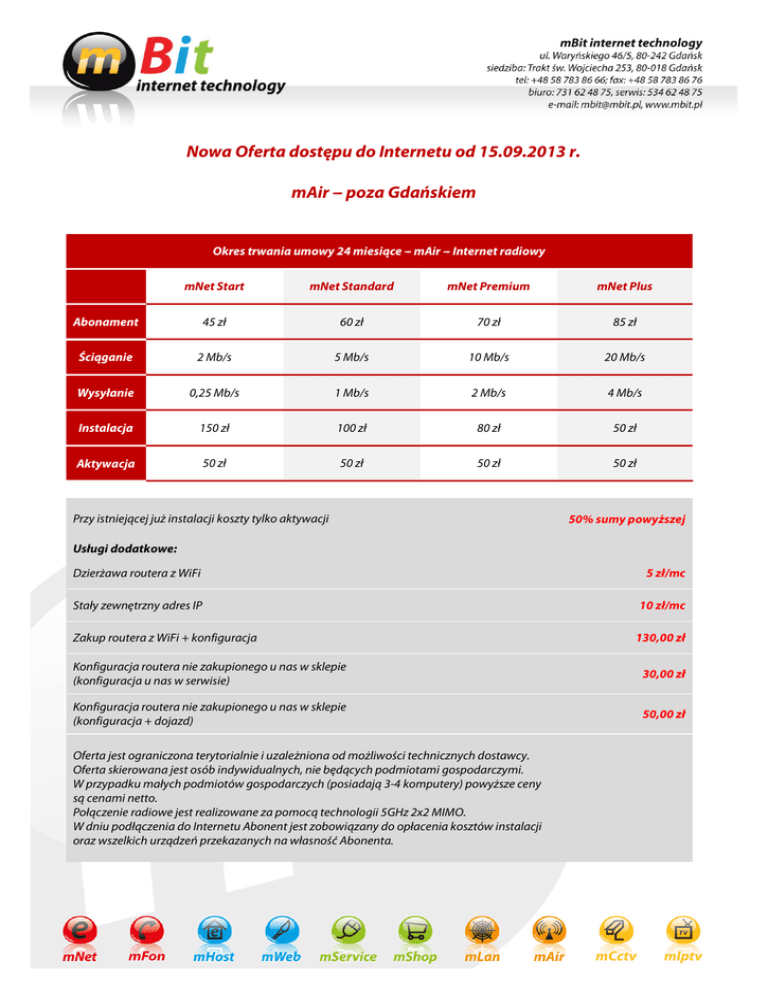 Nowa Oferta dostępu do Internetu od 15.09.2013 r. mAir --- poza Gdańskiem Okres trwania umowy 24 miesiące --- mAir --- Internet radiowy mNet Start mNet Standard mNet Premium mNet Plus Abonament 45 zł 60 zł 70 zł 85 zł Ściąganie 2 Mb/s 5 Mb/s 10 Mb/s 20 Mb/s Wysyłanie 0,25 Mb/s 1 Mb/s 2 Mb/s 4 Mb/s Instalacja 150 zł 100 zł 80 zł 50 zł Aktywacja 50 zł 50 zł 50 zł 50 zł Przy istniejącej już instalacji koszty tylko aktywacji 50% sumy powyższej Usługi dodatkowe: Dzierżawa routera z WiFi 5 zł/mc Stały zewnętrzny adres IP 10 zł/mc Zakup routera z WiFi + konfiguracja 130,00 zł Konfiguracja routera nie zakupionego u nas w sklepie (konfiguracja u nas w serwisie) 30,00 zł Konfiguracja routera nie zakupionego u nas w sklepie (konfiguracja + dojazd) 50,00 zł Oferta jest ograniczona terytorialnie i uzależniona od możliwości technicznych dostawcy. Oferta skierowana jest osób indywidualnych, nie będących podmiotami gospodarczymi. W przypadku małych podmiotów gospodarczych (posiadają 3-4 komputery) powyższe ceny są cenami netto. Połączenie radiowe jest realizowane za pomocą technologii 5GHz 2x2 MIMO. W dniu podłączenia do Internetu Abonent jest zobowiązany do opłacenia kosztów instalacji oraz wszelkich urządzeń przekazanych na własność Abonenta. Okres trwania umowy 12 miesięcy --- mAir --- Internet radiowy mNet Start mNet Standard mNet Premium mNet Plus Abonament 50 zł 65 zł 75 zł 90 zł Ściąganie 2 Mb/s 5 Mb/s 10 Mb/s 20 Mb/s Wysyłanie 0,25 Mb/s 1 Mb/s 2 Mb/s 4 Mb/s Instalacja 150 zł 100 zł 80 zł 50 zł Aktywacja 50 zł 50 zł 50 zł 50 zł Przy istniejącej już instalacji koszty tylko aktywacji 50% sumy powyższej Usługi dodatkowe: Dzierżawa routera z WiFi 10 zł/mc Stały zewnętrzny adres IP 12 zł/mc Zakup routera z WiFi + konfiguracja 130,00 zł Konfiguracja routera nie zakupionego u nas w sklepie (konfiguracja u nas w serwisie) 30,00 zł Konfiguracja routera nie zakupionego u nas w sklepie (konfiguracja + dojazd) 50,00 zł Oferta jest ograniczona terytorialnie i uzależniona od możliwości technicznych dostawcy. Oferta skierowana jest osób indywidualnych, nie będących podmiotami gospodarczymi. W przypadku małych podmiotów gospodarczych (posiadają 3-4 komputery) powyższe ceny są cenami netto. Połączenie radiowe jest realizowane za pomocą technologii 5GHz 2x2 MIMO. W dniu podłączenia do Internetu Abonent jest zobowiązany do opłacenia kosztów instalacji oraz wszelkich urządzeń przekazanych na własność Abonenta. Okres trwania umowy czas nieokreślony --- mAir --- Internet radiowy mNet Start mNet Standard mNet Premium mNet Plus Abonament 55 zł 90 zł 100 zł 125 zł Ściąganie 2 Mb/s 5 Mb/s 10 Mb/s 20 Mb/s Wysyłanie 0,25 Mb/s 1 Mb/s 2 Mb/s 4 Mb/s Instalacja 200 zł 200 zł 200 zł 200 zł Aktywacja 50 zł 50 zł 50 zł 50 zł Przy istniejącej już instalacji koszty tylko aktywacji 50% sumy powyższej Usługi dodatkowe: Dzierżawa routera z WiFi 15 zł/mc Stały zewnętrzny adres IP 15 zł/mc Zakup routera z WiFi + konfiguracja 130,00 zł Konfiguracja routera nie zakupionego u nas w sklepie (konfiguracja u nas w serwisie) 30,00 zł Konfiguracja routera nie zakupionego u nas w sklepie (konfiguracja + dojazd) 50,00 zł Oferta jest ograniczona terytorialnie i uzależniona od możliwości technicznych dostawcy. Oferta skierowana jest osób indywidualnych, nie będących podmiotami gospodarczymi. W przypadku małych podmiotów gospodarczych (posiadają 3-4 komputery) powyższe ceny są cenami netto. Połączenie radiowe jest realizowane za pomocą technologii 5GHz 2x2 MIMO. W dniu podłączenia do Internetu Abonent jest zobowiązany do opłacenia kosztów instalacji oraz wszelkich urządzeń przekazanych na własność Abonenta.