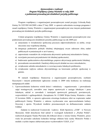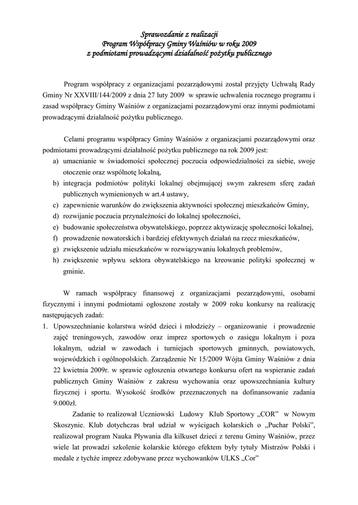 Sprawozdanie z realizacji Program Współpracy Gminy Waśniów w roku 2009 z podmiotami prowadzącymi działalność pożytku publicznego Program współpracy z organizacjami pozarządowymi został przyjęty Uchwałą Rady Gminy Nr XXVIII/144/2009 z dnia 27 luty 2009 w sprawie uchwalenia rocznego programu i zasad współpracy Gminy Waśniów z organizacjami pozarządowymi oraz innymi podmiotami prowadzącymi działalność pożytku publicznego. Celami programu współpracy Gminy Waśniów z organizacjami pozarządowymi oraz podmiotami prowadzącymi działalność pożytku publicznego na rok 2009 jest: a) umacnianie w świadomości społecznej poczucia odpowiedzialności za siebie, swoje otoczenie oraz wspólnotę lokalną, b) integracja podmiotów polityki lokalnej obejmującej swym zakresem sferę zadań publicznych wymienionych w art.4 ustawy, c) zapewnienie warunków do zwiększenia aktywności społecznej mieszkańców Gminy, d) rozwijanie poczucia przynależności do lokalnej społeczności, e) budowanie społeczeństwa obywatelskiego, poprzez aktywizację społeczności lokalnej, f) prowadzenie nowatorskich i bardziej efektywnych działań na rzecz mieszkańców, g) zwiększenie udziału mieszkańców w rozwiązywaniu lokalnych problemów, h) zwiększenie wpływu sektora obywatelskiego na kreowanie polityki społecznej w gminie. W ramach współpracy finansowej z organizacjami pozarządowymi, osobami fizycznymi i innymi podmiotami ogłoszone zostały w 2009 roku konkursy na realizację następujących zadań: 1. Upowszechnianie kolarstwa wśród dzieci i młodzieży – organizowanie i prowadzenie zajęć treningowych, zawodów oraz imprez sportowych o zasięgu lokalnym i poza lokalnym, udział w zawodach i turniejach sportowych gminnych, powiatowych, wojewódzkich i ogólnopolskich. Zarządzenie Nr 15/2009 Wójta Gminy Waśniów z dnia 22 kwietnia 2009r. w sprawie ogłoszenia otwartego konkursu ofert na wspieranie zadań publicznych Gminy Waśniów z zakresu wychowania oraz upowszechniania kultury fizycznej i sportu. Wysokość środków przeznaczonych na dofinansowanie zadania 9.000zł. Zadanie to realizował Uczniowski Ludowy Klub Sportowy „COR” w Nowym Skoszynie. Klub dotychczas brał udział w wyścigach kolarskich o „Puchar Polski”, realizował program Nauka Pływania dla kilkuset dzieci z terenu Gminy Waśniów, przez wiele lat prowadzi szkolenie kolarskie którego efektem były tytuły Mistrzów Polski i medale z tychże imprez zdobywane przez wychowanków ULKS „Cor” 2. Organizacja wypoczynku wyjazdowego dla dzieci i młodzieży z rodzin patologicznych z terenu Gminy Waśniów w okresie ferii letnich. Zarządzenie Nr 23/2009 Wójta Gminy Waśniów z dnia 21 maj 2009r. w sprawie ogłoszenia otwartego konkursu ofert na wspieranie zadań publicznych Gminy Waśniów z zakresu oświaty i wychowania. Wysokość środków przeznaczonych na dofinansowanie zadania 15.000zł. Zadanie pod nazwą „Bezpieczne Wakacje” zrealizowało Stowarzyszenie Nauczycieli i Wychowawców w Kielcach objętych zostało 22 uczestników, którzy przebywali w ośrodku wypoczynkowym w Ustce w okresie od 10.08 do 21.08.2009r. w ramach pobytu dzieci na wypoczynku przewidziano liczne atrakcje (wycieczka autokarowa do Słupska, wycieczka do Słowiańskiego Parku Narodowego, rejs statkiem po Bałtyku, ogniska oraz inne). 3. Organizacja wypoczynku wyjazdowego dla dzieci i młodzieży z terenu Gminy Waśniów w okresie ferii letnich. Zarządzenie Nr 21/2009 Wójta Gminy Waśniów z dnia 21 maj 2009r. w sprawie ogłoszenia otwartego konkursu ofert na wspieranie zadań publicznych Gminy Waśniów z zakresu oświaty i wychowania. Wysokość środków przeznaczonych na dofinansowanie zadania 8.000zł. Uczniowski Ludowy Klub Sportowy „COR” w Nowym Skoszynie realizował zadanie, które objęło swoim zakresem 80 uczestników w ośrodku wypoczynkowym w Gdyni w okresie od 09.07 do 22.07.2009r. 4. Udzielanie schronienia na terenie Gminy Waśniów, zapewnienia posiłku oraz niezbędnego ubrania osobom tego pozbawionym w formie udziału w finansowaniu kosztów budowy i wyposażenia schroniska. Zarządzenie Wójta Gminy Waśniów Nr 41/2009 z dnia 18 sierpnia 2009r. w sprawie ogłoszenia otwartego konkursu ofert na realizację zadania pomocy społecznej polegającego na udzielaniu schronienia na terenie Gminy Waśniów, zapewnienia posiłku oraz niezbędnego ubrania osobom tego pozbawionym w formie udziału w finansowaniu kosztów budowy i wyposażenia schroniska. Wysokość środków przeznaczonych na dofinansowanie zadania 300.000zł. W ramach zadania Towarzystwo Pomocy im. Św. Brata Alberta Koło w Skoszynie stworzyło dodatkowe miejsca dla osób bezdomnych ,samotnych, starych, niepełnosprawnym. Wykonanie zadania pozwoliło na przygotowanie nowego budynku do odbioru oraz poprawę warunków bytowych przebywających podopiecznych. Rozwój Schroniska pozwala na przeciwdziałanie tak poważnym problemom jakimi są: samotność bezradność, szczególnie ludzie starzy. Działania te łagodzą skutki niedożywienia, poprawiają warunki bytowe podopiecznych oraz niosą pomoc ludziom niezaradnym życiowo. 5. Pozyskiwanie artykułów żywnościowych dla najuboższych mieszkańców Gminy Waśniów. Zarządzenie Nr 56/2009 Wójta Gminy Waśniów z dnia 13 listopada 2009r. w sprawie ogłoszenia otwartego konkursu ofert na realizację zadania pomocy społecznej polegającego na Pozyskiwaniu artykułów żywnościowych dla najuboższych mieszkańców Gminy Waśniów. Wysokość środków przeznaczonych na dofinansowanie zadania 3.000zł. Stowarzyszenie Świętokrzyski Bank Żywności przedstawiło kalkulację dotyczącą realizacji zadania. Pozyskiwanie artykułów żywnościowych dla najuboższych mieszkańców Gminy Waśniów, realizowane było poprzez nawiązanie współpracy z darczyńcami z całego województwa świętokrzyskiego, podpisano umowy o współpracy z organizacjami działającymi w obszarze pomocy 