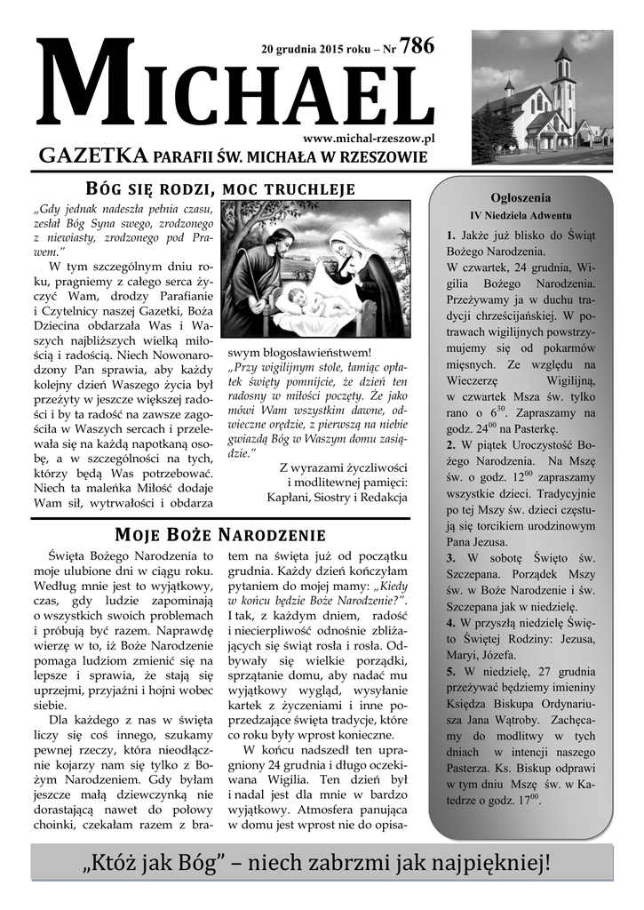 MICHAEL 20 grudnia 2015 roku – Nr 786 www.michal-rzeszow.pl GAZETKA PARAFII ŚW. MICHAŁA W RZESZOWIE B ÓG SIĘ RODZI , MOC TRUCHLEJE „Gdy jednak nadeszła pełnia czasu, zesłał Bóg Syna swego, zrodzonego z niewiasty, zrodzonego pod Prawem.” W tym szczególnym dniu roku, pragniemy z całego serca życzyć Wam, drodzy Parafianie i Czytelnicy naszej Gazetki, Boża Dziecina obdarzała Was i Waszych najbliższych wielką miłością i radością. Niech Nowonarodzony Pan sprawia, aby każdy kolejny dzień Waszego życia był przeżyty w jeszcze większej radości i by ta radość na zawsze zagościła w Waszych sercach i przelewała się na każdą napotkaną osobę, a w szczególności na tych, którzy będą Was potrzebować. Niech ta maleńka Miłość dodaje Wam sił, wytrwałości i obdarza IV Niedziela Adwentu swym błogosławieństwem! „Przy wigilijnym stole, łamiąc opłatek święty pomnijcie, że dzień ten radosny w miłości poczęty. Że jako mówi Wam wszystkim dawne, odwieczne orędzie, z pierwszą na niebie gwiazdą Bóg w Waszym domu zasiądzie.” Z wyrazami życzliwości i modlitewnej pamięci: Kapłani, Siostry i Redakcja M OJE B OŻE N ARODZENIE Święta Bożego Narodzenia to moje ulubione dni w ciągu roku. Według mnie jest to wyjątkowy, czas, gdy ludzie zapominają o wszystkich swoich problemach i próbują być razem. Naprawdę wierzę w to, iż Boże Narodzenie pomaga ludziom zmienić się na lepsze i sprawia, że stają się uprzejmi, przyjaźni i hojni wobec siebie. Dla każdego z nas w święta liczy się coś innego, szukamy pewnej rzeczy, która nieodłącznie kojarzy nam się tylko z Bożym Narodzeniem. Gdy byłam jeszcze małą dziewczynką nie dorastającą nawet do połowy choinki, czekałam razem z bra- Ogłoszenia tem na święta już od początku grudnia. Każdy dzień kończyłam pytaniem do mojej mamy: „Kiedy w końcu będzie Boże Narodzenie?”. I tak, z każdym dniem, radość i niecierpliwość odnośnie zbliżających się świąt rosła i rosła. Odbywały się wielkie porządki, sprzątanie domu, aby nadać mu wyjątkowy wygląd, wysyłanie kartek z życzeniami i inne poprzedzające święta tradycje, które co roku były wprost konieczne. W końcu nadszedł ten upragniony 24 grudnia i długo oczekiwana Wigilia. Ten dzień był i nadal jest dla mnie w bardzo wyjątkowy. Atmosfera panująca w domu jest wprost nie do opisa- 1. Jakże już blisko do Świąt Bożego Narodzenia. W czwartek, 24 grudnia, Wigilia Bożego Narodzenia. Przeżywamy ja w duchu tradycji chrześcijańskiej. W potrawach wigilijnych powstrzymujemy się od pokarmów mięsnych. Ze względu na Wieczerzę Wigilijną, w czwartek Msza św. tylko rano o 630. Zapraszamy na godz. 2400 na Pasterkę. 2. W piątek Uroczystość Bożego Narodzenia. Na Mszę św. o godz. 1200 zapraszamy wszystkie dzieci. Tradycyjnie po tej Mszy św. dzieci częstują się torcikiem urodzinowym Pana Jezusa. 3. W sobotę Święto św. Szczepana. Porządek Mszy św. w Boże Narodzenie i św. Szczepana jak w niedzielę. 4. W przyszłą niedzielę Święto Świętej Rodziny: Jezusa, Maryi, Józefa. 5. W niedzielę, 27 grudnia przeżywać będziemy imieniny Księdza Biskupa Ordynariusza Jana Wątroby. Zachęcamy do modlitwy w tych dniach w intencji naszego Pasterza. Ks. Biskup odprawi w tym dniu Mszę św. w Katedrze o godz. 1700. „Któż jak Bóg” – niech zabrzmi jak najpiękniej! Ogłoszenia Niedziela Świętej Rodziny 1. W czwartek zakończenie starego roku. W naszej parafii tradycyjnie całodzienna adoracja Najświętszego Sakramentu. O godz. 900 będzie dodatkowa Msza św., a po niej wystawienie Najświętszego Sakramentu i do nabożeństwa wieczornego możliwość prywatnej adoracji. Nabożeństwo na zakończenie starego roku rozpocznie się o godz. 1630. Najpierw nieszpory, a po nich o godz. 1700 Msza św. Nie będzie Mszy św. o godz. 1800. 2. W piątek Nowy Rok – Uroczystość Świętej Bożej Rodzicielki Maryi. Msze św. jak w niedziele. 3. W tym tygodniu wypada pierwszy piątek i sobota miesiąca. Okazja do spowiedzi w czwartek i w piątek w czasie Mszy św. Ze względu na Nowy Rok, chorych odwiedzimy w tym tygodniu w czwartek. 4. W sobotę przed Mszą św. wieczorną nabożeństwo Duchowej Adopcji Dziecka Poczętego. Prowadzi Domowy Kościół. 5. Duszpasterstwo Rodzin i Ruchy Obrony Życia zapraszają na XII Marsz za Życiem w Rzeszowie, w Święto Młodzianków, 28 grudnia. Rozpoczęcie o godz. 1715 przy pomniku dzieci nienarodzonych na Starym Cmentarzu, następnie u OO. Bernardynów o godz. 1800 zostanie przedstawiony program muzyczny w wykonaniu młodzieży, a o godz. 1830 będzie odprawiona uroczysta Msza Święta. nia. To mieszanina nerwów, podekscytowania ale i miłości. Jedna wielka krzątanina, każdy robi wszystko co się da, żeby wieczorem spokojnie zasiąść do wspólnej kolacji, zaśpiewać kolędy, podzielić się opłatkiem. Pamiętam, jak siadaliśmy z bratem przy choince, przy zgaszonym świetle. W pokoju migotały tylko kolorowe lampki choinkowe, a z radia roznosił się nastrojowy dźwięk kolęd i pastorałek. Mimo ciemności czuliśmy pewnego rodzaju bezpieczeństwo, powietrze było wypełnione szczęściem i miłością. Trwały ostanie przygotowania do kolacji, w domu roznosił się zapach różnych potraw, które w święta smakują zdecydowanie lepiej niż zawsze. Gdy już wreszcie zapadł wieczór i zaświeciła pierwsza gwiazdka na niebie, wówczas wszyscy zasiadaliśmy do nakrytego białym obrusem stołu. Pod obrusem obowiązkowo było sianko, by upamiętnić żłóbek - miejsce narodzin Chrystusa oraz wolne nakrycie symbolizujące pamięć o tych, którzy kiedyś przy nim zasiadali, jest to także nakrycie dla nieznajomego wędrowca. Zawsze chętnie zgłaszałam się do odczytania fragmentu z Pisma Świętego, czego nigdy nie mogło u nas zabraknąć. Potem przechodziliśmy do dzielenia się opłatkiem. Najbardziej w tym wszystkim podobało mi się