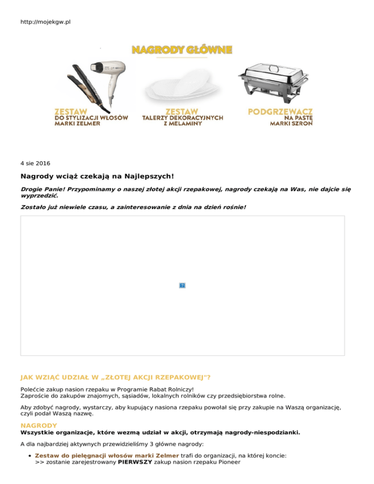 http://mojekgw.pl 4 sie 2016 Nagrody wciąż czekają na Najlepszych! Drogie Panie! Przypominamy o naszej złotej akcji rzepakowej, nagrody czekają na Was, nie dajcie się wyprzedzić. Zostało już niewiele czasu, a zainteresowanie z dnia na dzień rośnie! JAK WZIĄĆ UDZIAŁ W „ZŁOTEJ AKCJI RZEPAKOWEJ"? Polećcie zakup nasion rzepaku w Programie Rabat Rolniczy! Zaproście do zakupów znajomych, sąsiadów, lokalnych rolników czy przedsiębiorstwa rolne. Aby zdobyć nagrody, wystarczy, aby kupujący nasiona rzepaku powołał się przy zakupie na Waszą organizację, czyli podał Waszą nazwę. NAGRODY Wszystkie organizacje, które wezmą udział w akcji, otrzymają nagrody-niespodzianki. A dla najbardziej aktywnych przewidzieliśmy 3 główne nagrody: Zestaw do pielęgnacji włosów marki Zelmer trafi do organizacji, na której koncie: >> zostanie zarejestrowany PIERWSZY zakup nasion rzepaku Pioneer Zestaw talerzy dekoracyjnych z melaminy trafi do organizacji, która: >> przekona NAJWIĘCEJ OSÓB do zakupu nasion rzepaku firmy Pioneer Podgrzewacz marki Szron trafi do organizacji, która: >> na swoim koncie odnotuje NAJWIĘKSZĄ ILOŚĆ zakupionych nasion rzepaku Pioneer W tym wyścigu możecie wygrać nie tylko cenne nagrody! Pamiętajcie, że każdy zakup to również Cashback dla Waszej organizacji JAK ZAMIENIĆ RZEPAK W ZŁOTO, CZYLI JAK DOKONYWAC ZAKUPÓW? Zamówienia można składać telefonicznie od poniedziałku do piątku w godz. 8.30-16.30 dzwoniąc pod bezpłatny numer telefonu: 800 007 444. DLACZEGO WARTO POLECIĆ NASIONA MARKI PIONEER? Pioneer to największy w Polsce dostawca nasion kukurydzy i jeden z największych jeżeli chodzi o nasiona rzepaku. Produkty firmy Pioneer znane są z bardzo wysokiej jakości, bardzo wysokiego potencjału plonowania, są odporne na choroby i wyleganie. Program Rabat Rolniczy specjalnie dla polskich rolników wynegocjował najniższe ceny na te wysokiej klasy nasiona: Standardowo cena nasion rzepaku wynosi ok. 1200 zł za 10 kg - w Programie Rabat Rolniczy cena wynosi jedyne 939 zł. To ponad 20% TANIEJ. 10 kg nasion wystarczy na zasianie 4ha. Szczegóły dotyczące nasion znajdują się w ulotce informacyjnej w galerii na dole artykułu. Akcja trwa do 31.08.2016. W akcji biorą udział 2 gatunki nasion: PT211 oraz PT225. Zapraszamy!! Ewa Ł.