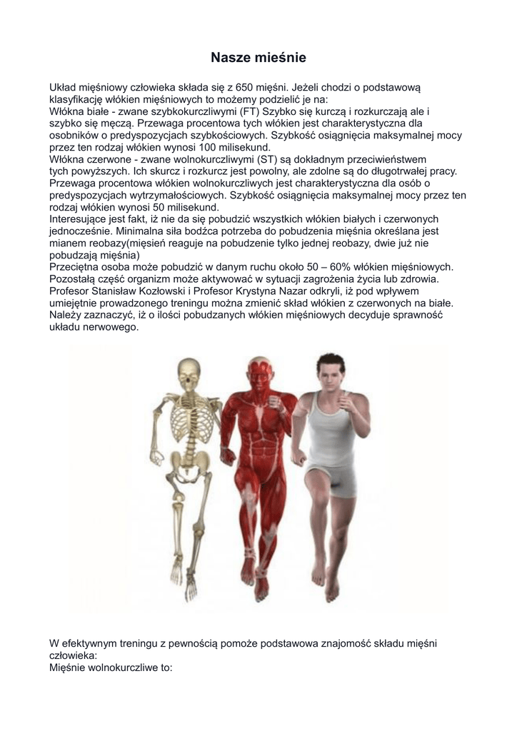 Nasze mieśnie Układ mięśniowy człowieka składa się z 650 mięśni. Jeżeli chodzi o podstawową klasyfikację włókien mięśniowych to możemy podzielić je na: Włókna białe - zwane szybkokurczliwymi (FT) Szybko się kurczą i rozkurczają ale i szybko się męczą. Przewaga procentowa tych włókien jest charakterystyczna dla osobników o predyspozycjach szybkościowych. Szybkość osiągnięcia maksymalnej mocy przez ten rodzaj włókien wynosi 100 milisekund. Włókna czerwone - zwane wolnokurczliwymi (ST) są dokładnym przeciwieństwem tych powyższych. Ich skurcz i rozkurcz jest powolny, ale zdolne są do długotrwałej pracy. Przewaga procentowa włókien wolnokurczliwych jest charakterystyczna dla osób o predyspozycjach wytrzymałościowych. Szybkość osiągnięcia maksymalnej mocy przez ten rodzaj włókien wynosi 50 milisekund. Interesujące jest fakt, iż nie da się pobudzić wszystkich włókien białych i czerwonych jednocześnie. Minimalna siła bodźca potrzeba do pobudzenia mięśnia określana jest mianem reobazy(mięsień reaguje na pobudzenie tylko jednej reobazy, dwie już nie pobudzają mięśnia) Przeciętna osoba może pobudzić w danym ruchu około 50 – 60% włókien mięśniowych. Pozostałą część organizm może aktywować w sytuacji zagrożenia życia lub zdrowia. Profesor Stanisław Kozłowski i Profesor Krystyna Nazar odkryli, iż pod wpływem umiejętnie prowadzonego treningu można zmienić skład włókien z czerwonych na białe. Należy zaznaczyć, iż o ilości pobudzanych włókien mięśniowych decyduje sprawność układu nerwowego. W efektywnym treningu z pewnością pomoże podstawowa znajomość składu mięśni człowieka: Mięśnie wolnokurczliwe to: m. płaszczkowaty (80-95% włókien czerwonych), m. piszczelowy przedni (65-85% włókien czerwonych) , m. dwugłowy uda (65-85% włókien czerwonych), naramienny (68-88% włókien czerwonych), krawiecki (70-90% włókien czerwonych), m. najszerszy grzbietu (55-75% włókien czerwonych), m. dwugłowy ramienia (45-65% włókien czerwonych), m. brzuchaty łydki (50-70% włókien czerwonych), Mięśnie szybkokurczliwe to: m.obszerny boczny (60-75% włókien białych), m. trójgłowy ramienia (50-70% włókien białych), m. prosty uda (55-70% włókien białych), m. ramienno-promieniowy (45-70% włókien białych), m. piersiowy większy (45-70% włókien białych), Literatura: M. Kruszewski „Metody treningu i podstawy żywienia w sportach siłowych” Warszawa 2007 Kozłowski S., Nazar K „Wprowadzenie do fizjologii klinicznej” Warszawa 1999 Trener personalny Jerzy Romanowski