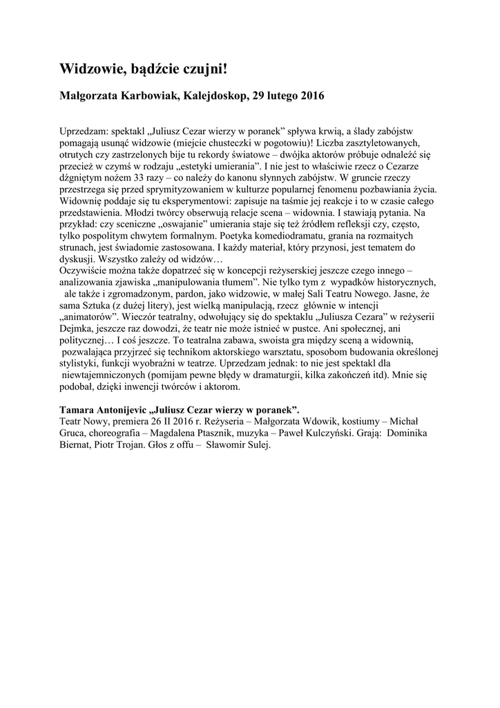 Widzowie, bądźcie czujni! Małgorzata Karbowiak, Kalejdoskop, 29 lutego 2016 Uprzedzam: spektakl „Juliusz Cezar wierzy w poranek” spływa krwią, a ślady zabójstw pomagają usunąć widzowie (miejcie chusteczki w pogotowiu)! Liczba zasztyletowanych, otrutych czy zastrzelonych bije tu rekordy światowe – dwójka aktorów próbuje odnaleźć się przecież w czymś w rodzaju „estetyki umierania”. I nie jest to właściwie rzecz o Cezarze dźgniętym nożem 33 razy – co należy do kanonu słynnych zabójstw. W gruncie rzeczy przestrzega się przed sprymityzowaniem w kulturze popularnej fenomenu pozbawiania życia. Widownię poddaje się tu eksperymentowi: zapisuje na taśmie jej reakcje i to w czasie całego przedstawienia. Młodzi twórcy obserwują relacje scena – widownia. I stawiają pytania. Na przykład: czy sceniczne „oswajanie” umierania staje się też źródłem refleksji czy, często, tylko pospolitym chwytem formalnym. Poetyka komediodramatu, grania na rozmaitych strunach, jest świadomie zastosowana. I każdy materiał, który przynosi, jest tematem do dyskusji. Wszystko zależy od widzów… Oczywiście można także dopatrzeć się w koncepcji reżyserskiej jeszcze czego innego – analizowania zjawiska „manipulowania tłumem”. Nie tylko tym z wypadków historycznych, ale także i zgromadzonym, pardon, jako widzowie, w małej Sali Teatru Nowego. Jasne, że sama Sztuka (z dużej litery), jest wielką manipulacją, rzecz głównie w intencji „animatorów”. Wieczór teatralny, odwołujący się do spektaklu „Juliusza Cezara” w reżyserii Dejmka, jeszcze raz dowodzi, że teatr nie może istnieć w pustce. Ani społecznej, ani politycznej… I coś jeszcze. To teatralna zabawa, swoista gra między sceną a widownią, pozwalająca przyjrzeć się technikom aktorskiego warsztatu, sposobom budowania określonej stylistyki, funkcji wyobraźni w teatrze. Uprzedzam jednak: to nie jest spektakl dla niewtajemniczonych (pomijam pewne błędy w dramaturgii, kilka zakończeń itd). Mnie się podobał, dzięki inwencji twórców i aktorom. Tamara Antonijevic „Juliusz Cezar wierzy w poranek”. Teatr Nowy, premiera 26 II 2016 r. Reżyseria – Małgorzata Wdowik, kostiumy – Michał Gruca, choreografia – Magdalena Ptasznik, muzyka – Paweł Kulczyński. Grają: Dominika Biernat, Piotr Trojan. Głos z offu – Sławomir Sulej.