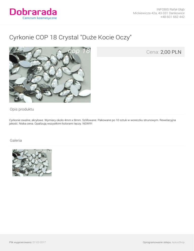 INFOBIS Rafał Głąb Mickiewicza 42a, 43-331 Dankowice +48 601 662 442 Cyrkonie COP 18 Crystal "Duże Kocie Oczy" Cena: 2,00 PLN Opis produktu Cyrkonie owalne, akrylowe. Wymiary około 4mm x 8mm. Szlifowane. Pakowane po 10 sztuk w woreczku strunowym. Rewelacyjna jakość. Niska cena. Opalizują wszystkimi kolorami tęczy. NEW!!!!! Galeria Plik wygenerowano: 07-03-2017 Powered by TCPDF (www.tcpdf.org) Oprogramowanie sklepu: AptusShop