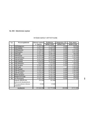 Dz. 803 - Szkolnictwo wyższe WYŻSZE SZKOŁY ARTYSTYCZNE Lp. 1. 2. 3. 4. 5. 6. 7. 8. 9. 10. 11. 12. 13. 14. 15. 16. 17. 18. Wyszczególnienie AM Bydgoszcz AM Gdańsk AM Katowice AM Kraków AM Łódź AM Poznań AM Warszawa AM Wrocław ASP Gdańsk ASP Katowice ASP Kraków ASP Łódź ASP Poznań ASP Warszawa ASP Wrocław PWST Kraków PWSFTviT Łódź AT Warszawa nagrody MKiDN dla nauczycieli akademickich "Przysposobienie obronne studentów" OGÓŁEM Dotacja ogółem w złotych 12 443 500 15 651 100 16 340 000 21 484 700 17 411 700 20 439 000 36 381 000 16 657 000 15 296 000 7 834 000 23 060 200 19 512 200 19 319 700 27 826 200 16 256 600 15 018 700 19 132 700 15 421 700 181 000 Dydaktyka Integracja z UE 80306 § 2520 80306 § 2527 11 774 500 10 000 14 869 100 12 000 15 108 000 10 000 20 437 700 15 000 16 495 700 10 000 19 324 000 10 000 34 913 000 15 000 15 858 000 12 000 14 133 000 11 000 7 373 000 11 000 21 506 200 15 000 17 923 200 0 17 454 700 12 000 26 122 200 15 000 14 793 600 10 000 14 425 700 12 000 18 128 700 10 000 14 934 700 10 000 181 000 19 000 19 000 335 686 000 315 775 000 200 000 Pom. mater. 80309 § 2520 659 000 770 000 1 222 000 1 032 000 906 000 1 105 000 1 453 000 787 000 1 152 000 450 000 1 539 000 1 589 000 1 853 000 1 689 000 1 453 000 581 000 994 000 477 000 19 711 000