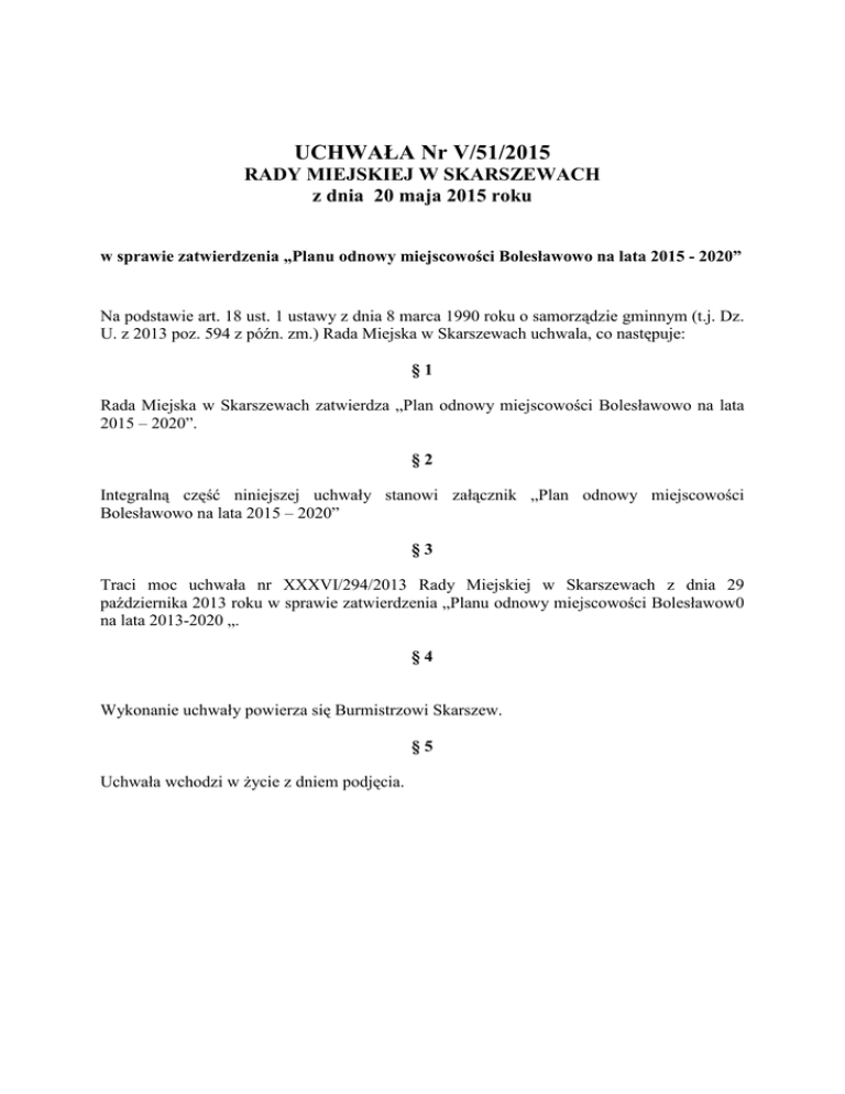 UCHWAŁA Nr V/51/2015 RADY MIEJSKIEJ W SKARSZEWACH z dnia 20 maja 2015 roku w sprawie zatwierdzenia „Planu odnowy miejscowości Bolesławowo na lata 2015 - 2020” Na podstawie art. 18 ust. 1 ustawy z dnia 8 marca 1990 roku o samorządzie gminnym (t.j. Dz. U. z 2013 poz. 594 z późn. zm.) Rada Miejska w Skarszewach uchwala, co następuje: §1 Rada Miejska w Skarszewach zatwierdza „Plan odnowy miejscowości Bolesławowo na lata 2015 – 2020”. §2 Integralną część niniejszej uchwały stanowi załącznik „Plan odnowy miejscowości Bolesławowo na lata 2015 – 2020” §3 Traci moc uchwała nr XXXVI/294/2013 Rady Miejskiej w Skarszewach z dnia 29 października 2013 roku w sprawie zatwierdzenia „Planu odnowy miejscowości Bolesławow0 na lata 2013-2020 „. §4 Wykonanie uchwały powierza się Burmistrzowi Skarszew. §5 Uchwała wchodzi w Ŝycie z dniem podjęcia. UZASADNIENIE Plan odnowy miejscowości Bolesławowo na lata 2015 - 2020 jest dokumentem, który określa kierunki rozwoju miejscowości oraz jej wizję. W dokumencie zawarto informacje na temat charakterystyki miejscowości, dokonano inwentaryzacji zasobów wsi oraz oceny mocnych i słabych stron miejscowości z uwzględnieniem szans i zagroŜeń. Plan zawiera opis planowanych zadań inwestycyjnych i przedsięwzięć aktywizujących społeczność lokalną, które przyczynić się mają do realizacji wizji wsi. Dokument moŜe ułatwić ubieganie się o środki zewnętrzne dla społeczności lokalnej. Plan odnowy miejscowości Bolesławowo na lata 2015 - 2020 został przyjęty na Zebraniu Wiejskim w dniu 2 marca 2015 roku. W związku z powyŜszym zasadne jest podjęcie uchwały. Załącznik do Uchwały Nr V/51/2015 Rady Miejskiej w Skarszewach z dnia 20 maja 2015 PLAN ODNOWY MIEJSCOWOŚCI BOLESŁAWOWO NA LATA 2015 - 2020 SKARSZEWY 2015 Analiza wsi Bolesławowo, gmina Skarszewy. 1. Środowisko przyrodnicze: Teren malowniczo połoŜony wśród lasów, jezior i stawów, co przyczynia się do Ŝycia w zdrowym środowisku. Znajdujące się tutaj lasy mieszane z bogatą szatą roślinną stwarzają doskonałe warunki dla licznej dzikiej zwierzyny. W lasach tych moŜna zobaczyć w okolicach Bolesławowa głazy narzutowe, zaliczane do pomników przyrody. Nad jeziorem Trzciniec, połoŜonym na granicy wsi, w 2/3 zarośniętym trzciną, znajdują się liczne siedliska dzikiego ptactwa. 2. Środowisko kulturowe, czyli walory architektury wiejskiej Na terenie wsi Bolesławowo znajdują się zabytkowe budynki i zabudowania, m.in.: • kompleks pałacowo -parkowy z zabudowaniami gospodarczymi z początku XX wieku, • lepianka z XIX w., • cmentarz poniemiecki, • nowe osiedla domków jednorodzinnych. • budynek dawnego dworca PKP (obecnie świetlica wiejska) 3. Dziedzictwa religijne i historyczne Bolesławowo to dawny majątek starościński noszący nazwę Neuguth. Obecnie na terenie wsi warto zobaczyć: kompleks pałacowo - parkowy i zapoznać się z legendą, cmentarz poewangelicki, figurkę Matki Boskiej oraz Lipią Górkę. 4. Obiekty i tereny Wieś posiada miejsca i tereny odpowiednie na czynny wypoczynek młodzieŜy, dorosłych i seniorów. Istnieją tu działki pod zabudowę mieszkaniową oraz istnieje moŜliwość przeznaczenia działek na budowę domków letniskowych i małą działalność gospodarczą. 5. Gospodarka i rolnictwo Znajdują się gospodarstwa rolne mało i wielohektarowe zajmujące się produkcją tradycyjną: - 1 gospodarstwo ponad 100ha - 1 gospodarstwo do 100 ha - 6 gospodarstw do 10 ha. 6. Komunikacja Bolesławowo połoŜone jest w bezpośrednim sąsiedztwie z siedzibą gminy, jakim jest miasto Skarszewy, przy drodze wojewódzkiej do Gdańska i Tczewa. We wsi istnieje dobra komunikacja PKS do miasta wojewódzkiego i powiatowego Starogardu Gdańskiego. Bolesławowo łączy ze Skarszewami deptak spacerowy (chodnik), który stanowi bezpieczne dojście uczniów do Zespołu Szkół Rolniczych Centrum Kształcenia Praktycznego w Bolesławowie, młodzieŜy wiejskiej do Gimnazjum w Skarszewach, a mieszkańcom słuŜy do celów spacerowych i rekreacyjnych. Wieś, wyposaŜona jest w przystanki autobusowe z zatoczkami, które zwiększają bezpieczeństwo na drodze. W miejscowości Bolesławowo występują liczne drogi nie asfaltowe. Przez teren wsi przebiega ścieŜka rowerowa (na trasie Skarszew – Borówno – Bolesławowi - Bolesławowie przebiega ok. 800 mb ścieŜki). 7. Mieszkania i mieszkańcy Wioska posiada zabudowę jednorodzinną i wielorodzinną. Wieś Bolesławowo jest częściowo skanalizowana. Zabudowa stara z XIX i XX w. Nowe budynki to domy o strukturze dachu dwuspadowego. Istnieje teŜ zabudowa stanowiąca spuściznę popegeerowską. Większość budynków ogrzewana jest węglem, drewnem. Mieszkańców wsi Bolesławowo w większości ludzi napływowych, moŜna podzielić na następujące grupy wiekowe: - dzieci w wieku od 0 do 12 lat - 80 osób - dzieci i młodzieŜ w wieku od 13 do 18 - 46 osób - młodzi ludzie w wieku 19 – 35 lat - 151 osób - dorośli w wieku 36 –65 lat - 186 osób - dorośli powyŜej 65 lat - 70 osób Obecnie wieś Bolesławowo liczy 533 mieszkańców (stan na dzień 31 grudnia 2014 r.) z tego 30 osoby zameldowane są jako mieszkańcy miejscowości Nygut, (dawna, historyczna nazwa, miejscowości Bolesławowo, do 1950 roku). 8. Stan otoczenia i środowiska Wokół wsi znajduje się bardzo duŜo lasów i jezior, bogatych w runo leśne, ptactwo i zwierzęta. W centrum wsi znajduje się kompleks pałacowo – parkowy, w którym wokół szkoły znajdują się drzewa, które naleŜą do pomników przyrody. Środowisko jest czyste pozbawione zanieczyszczeń przemysłowych. Obejścia wokół prywatnych posesji i innych budynków są w większości zadbane i estetyczne. 9. Obyczaje i tradycje Wszystkie obyczaje odbywają się cyklicznie: - tradycje wielkanocne – śmigus dyngus - kolędnicy w okresie adwentowym - majowe naboŜeństwa przy figurce NMP - letni festyn rodzinny