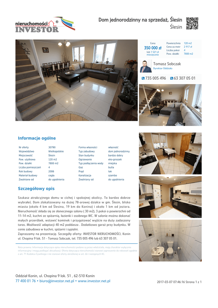 Dom jednorodzinny na sprzedaż, Ślesin Ślesin Cena 350 000 zł lub 1 521 zł miesięcznie Powierzchnia Cena za metr Liczba pokoi Pow. działki 120 m2 2 917 zł 4 7800 m2 Tomasz Sobczak Dyrektor Oddziału 735 005 496 63 307 05 01 Informacje ogólne Nr oferty 30790 Forma własności własność Województwo Wielkopolskie Typ zabudowy dom jednorodzinny Miejscowość Ślesin Stan budynku bardzo dobry Pow. użytkowa 120 m2 Ogrzewanie eko-groszek Pow. działki 7800 m2 Typ podłączenia wody miejska Liczba pomieszczeń 4 Gaz butla Rok budowy 2006 Prąd tak Materiał budowy cegła Kanalizacja szambo Zwalniane od do ugodnienia Zwalniany od do ugodnienia Szczegółowy opis Szukasz atrakcyjnego domu w cichej i spokojnej okolicy. To bardzo dobrze wybrałeś. Dom zlokalizowany na dużej 78-arowej działce w gm. Ślesin, blisko miasta (około 4 km od Ślesina, 19 km do Konina) i około 1 km od jeziora. Nieruchomość składa się ze słonecznego salonu ( 30 m2), 3 pokoi o powierzchni od 11-14 m2, kuchni ze spiżarnią, łazienki i osobnego WC. W salonie można dokonać małych przeróbek, wstawić kominek i przygotować wyjście na duży zadaszony taras. Możliwość adaptacji 40 m2 poddasza . Dodatkowo garaż przy budynku. W cenie zabudowa w kuchni, spiżarni i sypialni. Zapraszamy na prezentację. Szczegóły oferty: INVESTOR NIERUCHOMOŚCI, Konin ul. Chopina 9 lok. 51 - Tomasz Sobczak, tel. 735 005 496 lub 63 307 05 01. Nota prawna: Informacje dotyczące opisu nieruchomości podane są przez właściciela, mają charakter wyłącznie informacyjny i mogą podlegać aktualizacji. Oferta dotycząca nieruchomości stanowi zaproszenie do rokowań zgodnie z art. 71 Kodeksu Cywilnego i nie stanowi oferty określonej w art. 66 i następnych KC. Oddział Konin, ul. Chopina 9 lok. 51 , 62-510 Konin 77 400 01 76 • [email protected] • www.investor.net.pl 2017-03-07 07:46:16 Strona 1 z 1