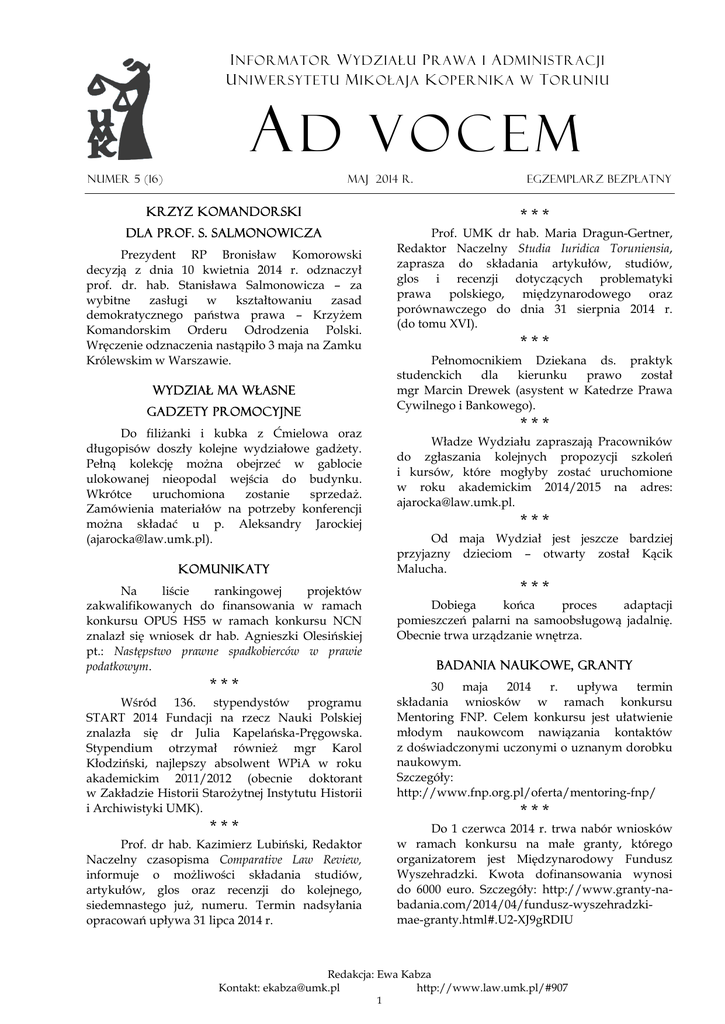 I nformator W ydziału P rawa i A dministracji U niwersytetu M ikołaja K opernika w T oruniu AD Numer 5 (16) VOCEM maj 2014 r. egzemplarz bezpłatny Krzyz komandorski *** Dla prof. S. Salmonowicza Prof. UMK dr hab. Maria Dragun-Gertner, Redaktor Naczelny Studia Iuridica Toruniensia, zaprasza do składania artykułów, studiów, glos i recenzji dotyczących problematyki prawa polskiego, międzynarodowego oraz porównawczego do dnia 31 sierpnia 2014 r. (do tomu XVI). Prezydent RP Bronisław Komorowski decyzją z dnia 10 kwietnia 2014 r. odznaczył prof. dr. hab. Stanisława Salmonowicza – za wybitne zasługi w kształtowaniu zasad demokratycznego państwa prawa – Krzyżem Komandorskim Orderu Odrodzenia Polski. Wręczenie odznaczenia nastąpiło 3 maja na Zamku Królewskim w Warszawie. *** Pełnomocnikiem Dziekana ds. praktyk studenckich dla kierunku prawo został mgr Marcin Drewek (asystent w Katedrze Prawa Cywilnego i Bankowego). Wydział ma własne Gadzety promocyjne *** Do filiżanki i kubka z Ćmielowa oraz długopisów doszły kolejne wydziałowe gadżety. Pełną kolekcję można obejrzeć w gablocie ulokowanej nieopodal wejścia do budynku. Wkrótce uruchomiona zostanie sprzedaż. Zamówienia materiałów na potrzeby konferencji można składać u p. Aleksandry Jarockiej ([email protected]). Władze Wydziału zapraszają Pracowników do zgłaszania kolejnych propozycji szkoleń i kursów, które mogłyby zostać uruchomione w roku akademickim 2014/2015 na adres: [email protected]. *** Od maja Wydział jest jeszcze bardziej przyjazny dzieciom – otwarty został Kącik Malucha. komunikaty *** Na liście rankingowej projektów zakwalifikowanych do finansowania w ramach konkursu OPUS HS5 w ramach konkursu NCN znalazł się wniosek dr hab. Agnieszki Olesińskiej pt.: Następstwo prawne spadkobierców w prawie podatkowym. Dobiega końca proces adaptacji pomieszczeń palarni na samoobsługową jadalnię. Obecnie trwa urządzanie wnętrza. Badania naukowe, granty *** 30 maja 2014 r. upływa termin składania wniosków w ramach konkursu Mentoring FNP. Celem konkursu jest ułatwienie młodym naukowcom nawiązania kontaktów z doświadczonymi uczonymi o uznanym dorobku naukowym. Szczegóły: http://www.fnp.org.pl/oferta/mentoring-fnp/ Wśród 136. stypendystów programu START 2014 Fundacji na rzecz Nauki Polskiej znalazła się dr Julia Kapelańska-Pręgowska. Stypendium otrzymał również mgr Karol Kłodziński, najlepszy absolwent WPiA w roku akademickim 2011/2012 (obecnie doktorant w Zakładzie Historii Starożytnej Instytutu Historii i Archiwistyki UMK). *** *** Do 1 czerwca 2014 r. trwa nabór wniosków w ramach konkursu na małe granty, którego organizatorem jest Międzynarodowy Fundusz Wyszehradzki. Kwota dofinansowania wynosi do 6000 euro. Szczegóły: http://www.granty-nabadania.com/2014/04/fundusz-wyszehradzkimae-granty.html#.U2-XJ9gRDIU Prof. dr hab. Kazimierz Lubiński, Redaktor Naczelny czasopisma Comparative Law Review, informuje o możliwości składania studiów, artykułów, glos oraz recenzji do kolejnego, siedemnastego już, numeru. Termin nadsyłania opracowań upływa 31 lipca 2014 r. Redakcja: Ewa Kabza Kontakt: [email protected] http://www.law.umk.pl/#907 1 pojęcia wymiaru sprawiedliwości w świetle Konstytucji RP i standardów międzynarodowych. *** Do 5 czerwca 2014 r. trwa nabór wniosków w ramach: EURIAS Senior Fellowships Programme oraz EURIAS Junior Fellowships Programme. W ramach konkursu można uzyskać środki na trwające do dziesięciu miesięcy staże naukowe w jednym z 16 instytutów, które należą do programu. Szczegóły: http://www.20152016.eurias-fp.eu/ *** Dnia 10 kwietnia 2014 r. prof. dr hab. Kazimierz Lubiński na zaproszenie studentów z ELSA wygłosił wykład nt. odpowiedzialności odszkodowawczej komornika sądowego. *** Do 13 czerwca 2014 r. można zgłaszać prace do kolejnej edycji konkursu Monografie, którego organizatorem jest FNP. Szczegóły: http://www.fnp.org.pl/oferta/monografie/ W dniach 15–18 kwietnia w Filadelfii odbyła się międzynarodowa konferencja The Future of the State, zorganizowana przez Wharton School i Lauder Institute, Univeristy of Pennsylvania. Uczestnikiem konferencji był dr Karol Dobrzeniecki. *** *** Zgłoszenia do 14. edycji Nagród Naukowych tygodnika Polityka można przesyłać do 23 czerwca 2014 r. Zgłoszenia mogą przesyłać osoby, które w ubiegłym roku „minęły ważny kamień milowy w życiu zawodowym”. Szczegóły: http://www.polityka.pl/tygodnikpolityka/nauka /nagrodynaukowe/ W dniu 24 kwietnia na zaproszenie Ambasadora Wielkiej Brytanii w Polsce, Robina Barnetta, dr Agnieszka Knade Plaskacz uczestniczyła w spotkaniu zorganizowanym z okazji 10. rocznicy przystąpienia Polski do UE oraz CEEMC 20th Anniversary, w którym uczestniczyli m.in. rzecznicy generalni w Trybunale Sprawiedliwości UE Eleanor V. E. Sharpston oraz prof. Maciej Szpunar, jak również polscy i brytyjscy przedstawiciele nauki prawa europejskiego. *** *** Do 2 września 2014 r. można składać wnioski w ramach tzw. zielonych grantów, które przyznawane są przez niemiecką Fundację im. Heinricha Bölla. Szczegóły: http://www.boell.de/en/2013/10/30/application -process-autumn *** 25 kwietnia 2014 r. Koło Naukowe Publicznego Prawa Gospodarczego zorganizowało ogólnopolską konferencję naukową pod hasłem Publicznoprawne aspekty ochrony konkurencji i konsumenta. *** Nabór wniosków w ramach staży podoktorskich Max Weber Programme potrwa do 25 października 2014 r. Osoby zakwalifikowane do udziału w programie, będą mogły odbyć trwający od 12 do 24 miesięcy staż w European University Institute we Florencji. Szczegóły: http://www.eui.eu/ProgrammesAndFellowships /MaxWeberProgramme/Index.aspx *** O tym jak Arnold chce zostać Marleną – czyli o transseksualizmie z punktu widzenia prawa słów kilka to tytuł imprezy (prelekcji wraz z symulacją rozprawy sądowej) zorganizowanej w dniu 28 kwietnia 201