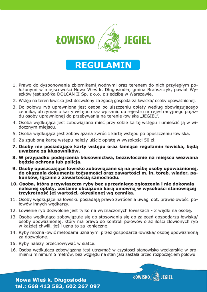 REGULAMIN 1. Prawo do dysponowania zbiornikami wodnymi oraz terenem do nich przyległym położonymi w miejscowości Nowa Wieś k. Długosiodła, gmina Brańszczyk, powiat Wyszków jest spółka DOLCAN II Sp. z o.o. z siedzibą w Warszawie. 2. Wstęp na teren łowiska jest dozwolony za zgodą gospodarza łowiska/ osoby upoważnionej. 3. Do połowu ryb uprawniona jest osoba po uiszczeniu opłaty według obowiązującego cennika, otrzymaniu karty wstępu oraz wpisaniu do rejestru nr rejestracyjnego pojazdu osoby uprawnionej do przebywania na terenie łowiska „JEGIEL”. 4. Osoba wędkująca jest zobowiązana mieć przy sobie kartę wstępu i umieścić ją w widocznym miejscu. 5. Osoba wędkująca jest zobowiązana zwrócić kartę wstępu po opuszczeniu łowiska. 6. Za zgubioną kartę wstępu należy uiścić opłatę w wysokości 50 zł. 7. Osoby nie posiadające karty wstępu oraz łamiące regulamin łowiska, będą uważane za kłusowników. 8. W przypadku podejrzenia kłusownictwa, bezzwłocznie na miejscu wezwana będzie ochrona lub policja. 9. Osoby opuszczające łowisko zobowiązane są na prośbę osoby upoważnionej, do okazania dokumentu tożsamości oraz zawartości m. in. toreb, wiader, pakunków, łącznie z zawartością samochodu. 10. Osoba, która przywłaszcza ryby bez uprzedniego zgłoszenia i nie dokonała należnej opłaty, zostanie obciążona karą umowną w wysokości stanowiącej trzykrotność jej wartości, określonej wg cennika. 11. Osoby wędkujące na łowisku posiadają prawo zwrócenia uwagi dot. prawidłowości połowów innych wędkarzy. 12. Łowienie ryb dozwolone jest tylko na wyznaczonych łowiskach - 2 wędki na osobę. 13. Osoba wędkująca zobowiązuje się do stosowania się do zaleceń gospodarza łowiska/ osoby upoważnionej, który ma prawo do kontroli połowów oraz ilości złowionych ryb w każdej chwili, jeśli uzna to za konieczne. 14. Ryby można łowić metodami uznanymi przez gospodarza łowiska/ osobę upoważnioną za dozwolone. 15. Ryby należy przechowywać w siatce. 16. Osoba wędkująca zobowiązana jest utrzymać w czystości stanowisko wędkarskie w promieniu minimum 5 metrów, bez względu na stan jaki zastała przed rozpoczęciem połowu Nowa Wieś k. Długosiodła tel.: 668 413 583, 602 267 097 REGULAMIN cd. 17. Gospodarz łowiska/ osoba upoważniona zastrzega sobie prawo do okresowego wyłączenia łowiska z połowów. 18. Każda osoba będąca na terenie łowiska zobowiązana jest do zachowania ciszy. 19. Osoby przebywające na łowisku zobowiązane są do bezwzględnego przestrzegania niniejszego Regulaminu oraz stosowania się do zaleceń gospodarza łowiska/ osoby upoważnionej. UWAGA !! 20. Gospodarz łowiska/ osoba upoważniona zastrzega sobie prawo sprzedaży ryb powyżej 5 kg. 21. Zabronione jest łowienie ryb, używając jako przynęty ryby z innego łowiska. 22. Zabronione jest patroszenie ryb przed zważeniem. 23. Zabronione jest skrobanie i patroszenie złowionych ryb na łowisku. 24. Za złowienie i wynoszone ryby należy uiścić opłatę wg aktualnego cennika. 25. Zabronione jest wprowadzanie na teren łowiska zwierząt. 26. Zabroniona jest kąpiel w stawach. 27. Zabrania się palenia ognisk na terenie łowiska, a grille można rozpalać tylko za zgodą osoby upoważnionej i w wyznaczonych miejscach. 28. Zabrania się używania radio-odbiorników, sprzętu do pływania oraz używania broni na terenie łowiska. 29. Zabronione jest zaśmiecanie łowiska (stawów, grobli i przyległych borów). 30. Zabroniony jest wjazd pojazdami mechanicznymi na teren łowiska. 31. Pojazd mechaniczny należy pozostawić na wyznaczonym parkingu. 32. Osoba wykupująca kartę połowu lub rekreacji oświadcza, że akceptuje regulamin łowiska. Nowa Wieś k. Długosiodła tel.: 668 413 583, 602 267 097
