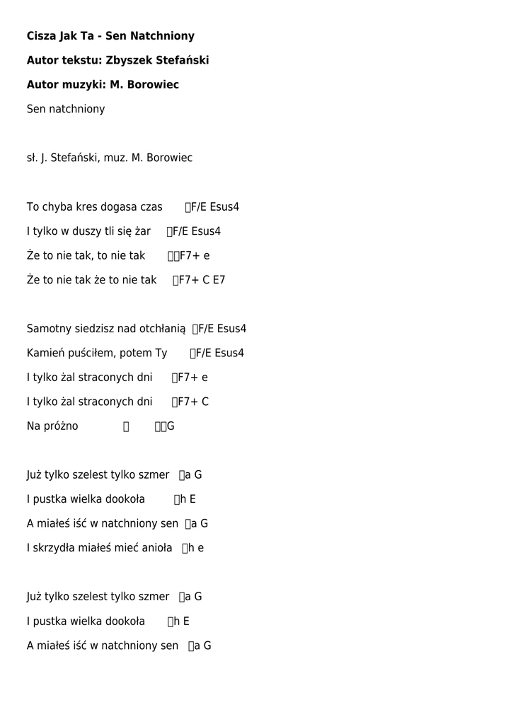 Cisza Jak Ta - Sen Natchniony Autor tekstu: Zbyszek Stefański Autor muzyki: M. Borowiec Sen natchniony sł. J. Stefański, muz. M. Borowiec To chyba kres dogasa czas F/E Esus4 I tylko w duszy tli się żar F/E Esus4 Że to nie tak, to nie tak F7+ e Że to nie tak że to nie tak F7+ C E7 Samotny siedzisz nad otchłanią F/E Esus4 Kamień puściłem, potem Ty F/E Esus4 I tylko żal straconych dni F7+ e I tylko żal straconych dni F7+ C Na próżno G Już tylko szelest tylko szmer a G I pustka wielka dookoła h E A miałeś iść w natchniony sen a G I skrzydła miałeś mieć anioła h e Już tylko szelest tylko szmer a G I pustka wielka dookoła h E A miałeś iść w natchniony sen a G I skrzydła miałeś mieć anioła h e Już tylko szelest tylko szmer F/E Esus4 I pustka wielka dookoła F/E Esus4 A miałeś iść w natchniony sen F7+ e I skrzydła miałeś mieć anioła F7+ C G