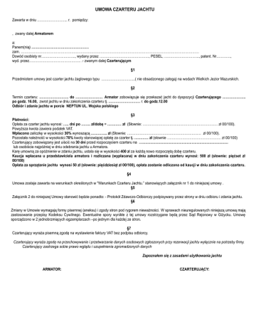 UMOWA CZARTERU JACHTU Zawarta w dniu …………………….. r. pomiędzy: , zwany dalej Armatorem a: Panem(nią) …………………………………………. zam. …………………………………………………………………………………………………………………………………….. Dowód osobisty nr……………………….., wydany przez ……………………………………, PESEL, ………………………..., patent. Nr…………, wyd. przez…………………………………….. .- zwanym dalej Czarterującym §1 Przedmiotem umowy jest czarter jachtu żaglowego typu ………………………..( nie obsadzonego załogą) na wodach Wielkich Jezior Mazurskich. §2 Termin czarteru: ……………………. do …………………... Armator zobowiązuje się przekazać jacht do dyspozycji Czarterującego ……………….. po godz. 16.00, zwrot jachtu w dniu zakończenia czarteru tj. ……………………… r. do godz.12.00 Odbiór i zdanie jachtu w porcie NEPTUN UL. Wojska polskiego §3 Płatności: Opłata za czarter jachtu wynosi: ….. dni po …….. zł/dobę = ………… zł (Słownie: ……………………………………….……………… zł 00/100). Powyższa kwota zawiera podatek VAT. Wpłacono zaliczkę w wysokości 30% wynoszącą ………….. zł (Słownie: ……………………………………………………… zł 00/100). Pozostała należność w wysokości 70% kwoty stanowiącej opłatę za czarter tj. ………… zł (słownie ………………………………………. zł 00/100) Czarterujący zobowiązany jest uiścić na 30 dni przed rozpoczęciem czarteru na …....................................................................................... lub osobiście najpóźniej w dniu odebrania jachtu u Armatora. Karę umowną za opóźnienie w zdaniu jachtu, ustala się w wysokości 400 zł za każdą nowo rozpoczętą dobę czarteru. Kaucja wpłacana u przedstawiciela armatora i rozliczana (wypłacana) w dniu zakończenia czarteru wynosi: 500 zł (słownie: pięćset zł 00/100) Opłata za sprzątanie jachtu wynosi 50 zł (słownie: pięćdziesiąt zł 00/100), opłata zostanie odliczona od kaucji w dniu zakończenia czarteru. §4 Umowa zostaje zawarta na warunkach określonych w "Warunkach Czarteru Jachtu.” stanowiących załącznik nr 1 do niniejszej umowy . §5 Załącznik 2 do niniejszej Umowy stanowić będzie ponadto: - Protokół Zdawczo-Odbiorczy podpisywany przez strony w dniu odbioru i zdania jachtu. §6 Zmiany w Umowie wymagają formy pisemnej (aneksu) i zgody stron pod rygorem nieważności. W sprawach nieuregulowanych niniejszą umową mają zastosowanie przepisy Kodeksu Cywilnego. Ewentualne spory wynikłe z tej umowy rozstrzygane będą przez Sąd Rejonowy w Giżycku. Umowę sporządzono w 2 jednobrzmiących egzemplarzach –po jednym dla każdej ze stron. §7 Czarterujący wyraża pisemną zgodę na wystawienie faktury VAT bez podpisu odbiorcy. Czarterujący wyraża zgodę na przechowywanie i przetwarzanie danych osobowych zgłoszonych przy rezerwacji jachtu wyłącznie na potrzeby firmy. Czarterujący zastrzega sobie prawo wglądu i uzupełnienia zgromadzonych danych Zapoznałem się z zasadami użytkowania jachtu ARMATOR: CZARTERUJĄCY: