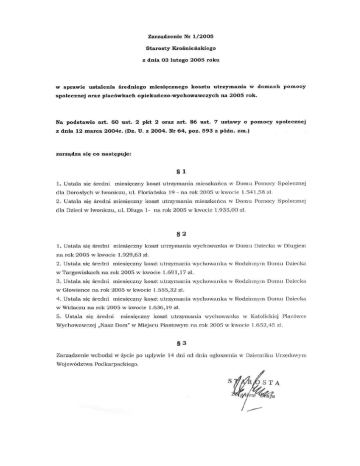 Zarządzenie Starosty Nr 1/2005 Krośnieńskiego z dnia 03 lutego 2005 roku w sprawie ustalenia społecznej średniego miesięcznego oraz placówkach kosztu utrzymania w domach pomocy opiekuńczo-wychowawczych na 2005 rok. Na podstawie art. 60 ust. 2 pkt 2 oraz art. 86 ust. 7 ustawy o pomocy z dnia 12 marca 2004r. (Dz. U. z 2004. Nr 64, poz. 593 z zarządza się co późn. społecznej zm.) następuje: § 1 l. Ustala dla Dorosłych 2. Ustala miesięczny się średni koszt utrzymania mieszka!lca w Domu Pomocy Społecznej w Iwoniczu, ul. Floriańska 19 - na rok 2005 w kwocie 1.541,58 zl. się średni miesięczny dla Dzieci w Iwoniczu, u l. Długa koszt u trzymania mieszkańca w Domu Pomocy Spo łecznej 1- na rok 2005 w kwocie l.935,00 zl. §2 l. Ustala się średni mie sięczny koszt Lttrzym ania wychowanka w Domu Dziecka w DlLLgie.m n.a rok 2005 w kwocie 1.929,63 zł. 2. Ustala się średni miesięczny koszt utrzymania wychowanka w Rodzinnym Domu Dziecka w Targowiskach na rok 2005 w kwocie 1.69 1, 17 zl. 3. Ustala się średni miesięczny koszt uu·zymania wychowanka w Rodzinnym Domu Dziecka w Glowience na rok 2005 w kwocie 1.555,32 zl. 4. Ustala się średni miesięczny koszt utrzymania wychowanka w Rodzinnym Domu Dziecka w Widaczu na rok 2005 w kwocie 1.636, 19 zl. 5. Ustala się średni miesięczny koszt utrzymania wychowanka w Katolickiej Placówce Wychowawczej "Nasz Dom" w Miej scu Piastowym na rok 2005 w kwocie 1.652,45 zl. §3 Zarz~dze nie wchodzi w życie po Województwa Podkar packiego. upływie 14 dn i od dnia ogłoszeni.a w Dzienniku Urz<;!dowym