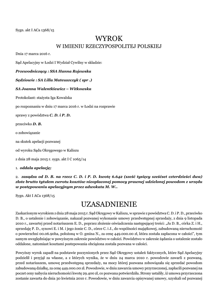 Sygn. akt I ACa 1368/15 WYROK W IMIENIU RZECZYPOSPOLITEJ POLSKIEJ Dnia 17 marca 2016 r. Sąd Apelacyjny w Łodzi I Wydział Cywilny w składzie: Przewodniczący : SSA Hanna Rojewska Sędziowie : SA Lilla Mateuszczyk ( spr .) SA Joanna Walentkiewicz – Witkowska Protokolant: stażysta Iga Kowalska po rozpoznaniu w dniu 17 marca 2016 r. w Łodzi na rozprawie sprawy z powództwa C. D. i P. D. przeciwko D. B. o zobowiązanie na skutek apelacji pozwanej od wyroku Sądu Okręgowego w Kaliszu z dnia 28 maja 2015 r. sygn. akt I C 1065/14 1. oddala apelację; 2. zasądza od D. B. na rzecz C. D. i P. D. kwotę 6.642 (sześć tysięcy sześćset czterdzieści dwa) złote brutto tytułem zwrotu kosztów nieopłaconej pomocy prawnej udzielonej powodom z urzędu w postępowaniu apelacyjnym przez adwokata M. W.. Sygn. Akt I ACa 1368/15 UZASADNIENIE Zaskarżonym wyrokiem z dnia 28 maja 2015 r. Sąd Okręgowy w Kaliszu, w sprawie z powództwa C. D. i P. D., przeciwko D. B., o ustalenie i zobowiązanie, nakazał pozwanej wykonanie umowy przedwstępnej sprzedaży, z dnia 9 listopada 2010 r., zawartej przed notariuszem E. D., poprzez złożenie oświadczenia następującej treści: „Ja D. B., córka Z. i H., sprzedaję P. D., synowi E. i M. i jego żonie C. D., córce C. i J., do wspólności majątkowej, zabudowaną nieruchomość o powierzchni 00.06.90ha, położoną w O. gmina N., za cenę 449.000.00 zł, która została zapłacona w całości”, tym samym uwzględniając w powyższym zakresie powództwo w całości. Powództwo w zakresie żądania o ustalenie zostało oddalone, natomiast kosztami postepowania obciążona została pozwana w całości. Powyższy wyrok zapadł na podstawie poczynionych przez Sąd Okręgowy ustaleń faktycznych, które Sąd Apelacyjny podzielił i przyjął za własne, a z których wynika, że w dniu 24 marca 2010 r. powodowie zawarli z pozwaną, przed notariuszem, umowę przedwstępną sprzedaży, na mocy której pozwana zobowiązała się sprzedać powodom zabudowaną działkę, za cenę 449.000.00 zł. Powodowie, w dniu zawarcia umowy przyrzeczonej, zapłacili pozwanej na poczet ceny nabycia nieruchomości kwotę 29.400 zł, co pozwana potwierdziła. Strony ustaliły, iż umowa przyrzeczona zostanie zawarta do dnia 30 kwietnia 2010 r. Powodowie, w dniu zawarcia opisywanej umowy, uzyskali od pozwanej posiadanie nieruchomości i od tego czasu faktycznie tam zamieszkują. W umówionym terminie umowa przyrzeczona nie została zawarta, w związku z czym, strony ponownie zawarły umowę przedwstępną sprzedaży, wskazując nowy termin zawarcia umowy przyrzeczonej, do dnia 28 lutego 2011 r. W dniu zawarcia umowy przedwstępnej powodowie zapłacili pozwanej kwotę 249.000 zł na poczet ceny zakupu nieruchomości, zaś pozostałą kwotę zobowiązali się uiścić do dnia 10 listopada 2010 r., co zostało spełnione. W określonym terminie umowa przyrzeczona nie została zawarta. Sąd Okręgowy, w oparciu o tak ustalony stan faktyczny, uznał powództwo za usprawiedliwione i uwzględnił je w części dotyczącej wykonania umowy przyrzeczonej. W ocenie Sądu powództwo było zasadne, bowiem strony zawarły umowę przedwstępną w formie aktu notarialnego, która spełniała wymogi formalne określone w art. 158 k.c., zatem powodom, którzy wykonali swoje obowiązki w postaci zapłaty ceny nieruchomości, przysługiwało roszczenie o zawarcie umowy przyrzeczonej, na podstawie art. 390 § 2 k.c. Zgłoszone przez pozwaną zarzuty nie kwestionowały istnienia po stronie powodowej roszczenia z przytoczonego przepisu lecz sprowadzały się do dwóch kwestii, tj. braku należytego sprecyzowania żądania pozwu, w postaci szczegółowego wskazania treści oświadczenia woli, jakie pozwana powinna złożyć, a także przedawnienia roszczenia powodów, o zawarcie umowy przyrzeczonej. Odnośnie pierwszego zarzutu, Sąd Okręgowy ustalił, iż intencją powodów było uzyskanie orzeczenia sądowego nakazującego pozwanej złożenie oświadczenia woli zgodnego z treścią umowy przedwstępnej i skutkującego sprzedażą na ich rzecz własności nieruchomości opisanej w umowie przedwstępnej. W przypadku podniesionego zarzutu przedawnienia, Sąd Okręgowy z urzędu uznał, że ten zarzut jest sprzeczny z zasadami współżycia społecznego oraz stanowi nadużycie prawa (art. 5 k.c.) i upływu terminu przedawnienia nie uwzględnił. Apelację od powyższego rozstrzygnięcia złożyła strona pozwana, zaskarżając wyrok w części, tj. pkt I oraz w zakresie rozstrzygnięcia o kosztach postępowania i zarzucając: 1. naruszenie przepisów postępowania, tj. obrazę art. 321 § 1 k.p.c. w zw. z art. 187 § 1 pkt. 1 k.p.c. poprzez uwzględnienie żądania z pkt.2 powództwa w formie określonej z urzędu przez Sąd I instancji pomimo tego, iż nie zawarto w nim jakiejkolwiek treści oświadczenia woli pozwanej, w zakresie dotyczącym skutku w postaci zawarcia umowy przyrzeczonej sprzedaży nieruchomości, tj. orzekanie co do przedmiotu, który nie był objęty żądaniem powodów. 2. naruszenie przepisów postępowania, tj. obrazę art. 100 k.p.c. wobec zasądzenia od pozwanej całości kosztów postępowania, w sytuacji gdy żądania powodów zostały uwzględnione jedynie częściowo, tak więc koszty powinny być wzajemnie zniesione pomiędzy stronami. 3. naruszenie przepisów prawa materialnego, tj. obrazę art. 5 k.c. poprzez błędne przyjęcie przez Sąd I instancji, że okoliczności ustalone w toku postępowania nakazywały ocenę, iż zgłoszony przez pozwaną zarzut przedawnienia roszczeń z umowy przedwstępnej sprzedaży nieruchomości, stanowił przejaw nadużycia prawa wobec sprzeczności tego zarzutu z zasadami współżycia społecznego w sytuacji gdy w sprawie nie występowały okoliczności wyjątkowe, a przekroczenie terminu było znaczne (2 lata), powodowie mieli świadomość co do terminu przedawnienia, wskazywanego m.in. na pouczeniach zawartych w każdym akcie notari