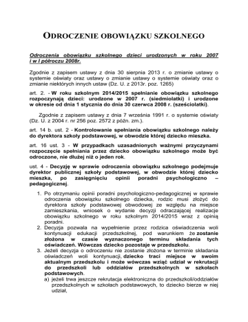 ODROCZENIE OBOWIĄZKU SZKOLNEGO Odroczenia obowiązku szkolnego dzieci urodzonych w roku 2007 i w I półroczu 2008r. Zgodnie z zapisem ustawy z dnia 30 sierpnia 2013 r. o zmianie ustawy o systemie oświaty oraz ustawy o zmianie ustawy o systemie oświaty oraz o zmianie niektórych innych ustaw (Dz. U. z 2013r. poz. 1265) art. 2. - W roku szkolnym 2014/2015 spełnianie obowiązku szkolnego rozpoczynają dzieci: urodzone w 2007 r. (siedmiolatki) i urodzone w okresie od dnia 1 stycznia do dnia 30 czerwca 2008 r. (sześciolatki). Zgodnie z zapisem ustawy z dnia 7 września 1991 r. o systemie oświaty (Dz. U. z 2004 r. nr 256 poz. 2572 z późn. zm.). art. 14 b. ust. 2 - Kontrolowanie spełniania obowiązku szkolnego należy do dyrektora szkoły podstawowej, w obwodzie której dziecko mieszka. art. 16 ust. 3 - W przypadkach uzasadnionych ważnymi przyczynami rozpoczęcie spełniania przez dziecko obowiązku szkolnego może być odroczone, nie dłużej niż o jeden rok. ust. 4 - Decyzję w sprawie odroczenia obowiązku szkolnego podejmuje dyrektor publicznej szkoły podstawowej, w obwodzie której dziecko mieszka, po zasięgnięciu opinii poradni psychologiczno – pedagogicznej. 1. Po otrzymaniu opinii poradni psychologiczno-pedagogicznej w sprawie odroczenia obowiązku szkolnego dziecka, rodzic musi złożyć do dyrektora szkoły podstawowej obwodowej ze względu na miejsce zamieszkania, wniosek o wydanie decyzji odraczającej realizacje obowiązku szkolnego w roku szkolnym 2014/2015 wraz z opinią poradni. 2. Decyzja pozwala na wypełnienie przez rodzica oświadczenia woli kontynuacji edukacji przedszkolnej, pod warunkiem że zostanie złożona w czasie wyznaczonego terminu składania tych oświadczeń. Wówczas dziecko pozostaje w przedszkolu. 3. Jeżeli decyzja o odroczeniu nie zostanie złożona w terminie składania oświadczeń woli kontynuacji, dziecko traci miejsce w swoim aktualnym przedszkolu i może wówczas wziąć udział w rekrutacji do przedszkoli lub oddziałów przedszkolnych w szkołach podstawowych. a) jeżeli trwa jeszcze rekrutacja elektroniczna do przedszkoli/oddziałów przedszkolnych w szkołach podstawowych, to dziecko bierze w niej udział, b) jeżeli rekrutacja elektroniczna już się zakończyła, to bierze udział w rekrutacji uzupełniającej na wolne miejsca. 4. Jeżeli nie zostanie wydana decyzja o odroczeniu obowiązku szkolnego, a dziecko nie brało udziału w rekrutacji elektronicznej, to dziecko ma zapewnione miejsce w klasie I publicznej szkoły podstawowej obwodowej ze względu na miejsce zamieszkania.