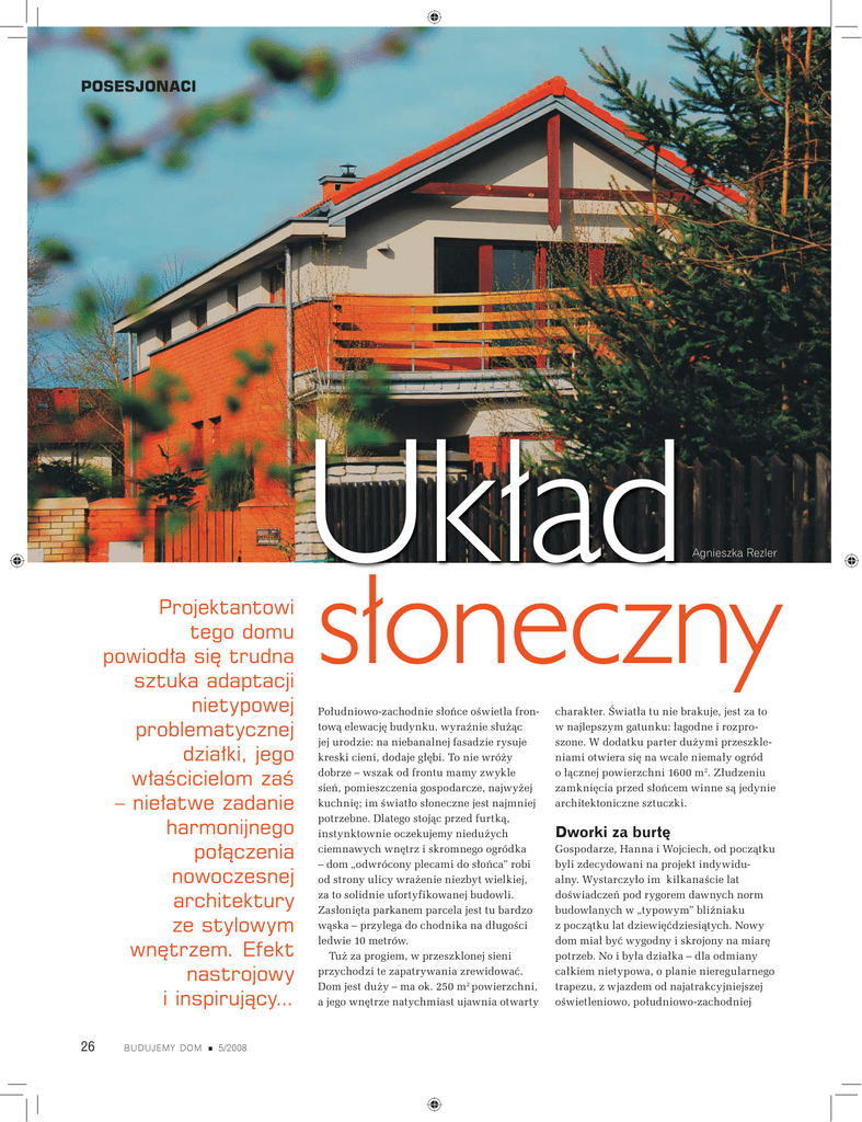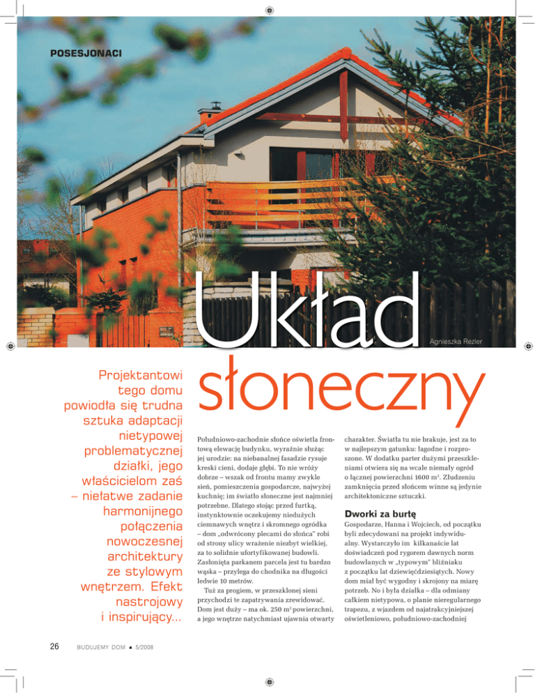 POSESJONACI Projektantowi tego domu powiodła się trudna sztuka adaptacji nietypowej problematycznej działki, jego właścicielom zaś – niełatwe zadanie harmonijnego połączenia nowoczesnej architektury ze stylowym wnętrzem. Efekt nastrojowy i inspirujący... 26 BUDUJEMY DOM 5/2008 Układ Agnieszka Rezler słoneczny Południowo-zachodnie słońce oświetla frontową elewację budynku, wyraźnie służąc jej urodzie: na niebanalnej fasadzie rysuje kreski cieni, dodaje głębi. To nie wróży dobrze – wszak od frontu mamy zwykle sień, pomieszczenia gospodarcze, najwyżej kuchnię; im światło słoneczne jest najmniej potrzebne. Dlatego stojąc przed furtką, instynktownie oczekujemy niedużych ciemnawych wnętrz i skromnego ogródka – dom „odwrócony plecami do słońca” robi od strony ulicy wrażenie niezbyt wielkiej, za to solidnie ufortyfikowanej budowli. Zasłonięta parkanem parcela jest tu bardzo wąska – przylega do chodnika na długości ledwie 10 metrów. Tuż za progiem, w przeszklonej sieni przychodzi te zapatrywania zrewidować. Dom jest duży – ma ok. 250 m2 powierzchni, a jego wnętrze natychmiast ujawnia otwarty charakter. Światła tu nie brakuje, jest za to w najlepszym gatunku: łagodne i rozproszone. W dodatku parter dużymi przeszkleniami otwiera się na wcale niemały ogród o łącznej powierzchni 1600 m2. Złudzeniu zamknięcia przed słońcem winne są jedynie architektoniczne sztuczki. Dworki za burtę Gospodarze, Hanna i Wojciech, od początku byli zdecydowani na projekt indywidualny. Wystarczyło im kilkanaście lat doświadczeń pod rygorem dawnych norm budowlanych w „typowym” bliźniaku z początku lat dziewięćdziesiątych. Nowy dom miał być wygodny i skrojony na miarę potrzeb. No i była działka – dla odmiany całkiem nietypowa, o planie nieregularnego trapezu, z wjazdem od najatrakcyjniejszej oświetleniowo, południowo-zachodniej Ogród od południowego wschodu. Dwa rozwarte skrzydła domu całkowicie osłaniają go przed wzrokiem ciekawskich, a do tego stanowią zaporę dla odgłosów najbliższej ulicy i dla silnych zachodnich wiatrów strony. Pierwszy architekt, z którym nawiązali kontakt kontakt, okazał się jednak zupełnie pozbawiony int intuicji. W odpowiedzi na jasno ż k wyrażone oczekiwania przedstawił sztampową koncepcję dworku, jakich wiele. Trafił kulą w płot – inwestorom nie odpowiadał ani projekt „z matrycy”, nieuwzględniający problematycznych warunków działki, ani – tym bardziej – zaproponowany styl. Banalnych dworków mieliśmy powyżej uszu – śmieje się Wojciech – naoglądaliśmy się ich dosyć, szukając inspiracji w pobliskich miejscowościach. Los podsunął na szczęście lepsze rozwiązanie: w owym czasie niedaleko powstawał dom córki i zięcia, i choć potrzeby obu rodzin były odmienne, architektura autorstwa Jerzego Hryniewickiego przypadła do gustu także rodzicom. Dzięki inwestycji młodszego pokolenia mieli też okazję poznać sposób współpracy projektanta z klientem – i on również nie budził zastrzeżeń. Sesje, podczas których omawiano i korygowano wstępne szkice, ciągnęły się przez kilka miesięcy. Ten okres dziś procentuje: dom w pełni respektuje wymogi otoczenia, a także potrzeby i upodobania mieszkańców. Manewr oskrzydlający Przestrzenne fortele, którymi posłużył się architekt, nie były sztuką dla sztuki. Miały za zadanie ukryć dużą kubaturę części mieszkalnej i obszernego podwójnego garażu w zgrabnej stylowej bryle, a przy tym oszczędzić jak najwięcej powierzchni ogrodu. I wpuścić wystarczającą ilość światła dziennego do wnętrza domu, na pozór skazanego na niedoświetlenie – jak wiadomo, ogród od wschodu srodze takie zadanie utrudnia. Projektant złożył budynek z dwóch brył: głównej (o dwóch kondygnacjach, mieszczącej dzienną przestrzeń wspólną i „minimieszkanko” mamy gospodarza, a na piętrze strefę prywatną z sypialniami i pokojem do pracy) oraz mniejszej, jednokondygnacyjnej, w której znalazły się kuchnia i garaż ze sporą antresolą. Oba prostopadłościany, zestawione pod szerokim rozwartym kątem, opiekuńczo „oskrzydliły” ogród. Pozwoliło to wykreować rozległą, ale przy tym osło- niętą i kameralną ostoję zieleni z dużym wygodnym tarasem. Mogą tu zajrzeć jedynie mieszkańcy sąsiadującego z posesją rzędu szeregowców, a i te widoki są skąpo dozowane przez kurtynę młodych drzew na granicy działki, które uparcie pną się w górę. Kilka lat temu, u progu budowy, działka była pusta – nie rosło tu nic poza jednym wschodzącym dąbkiem. Gdy ruszyły roboty fundamentowe, sąsiadów ogarnął niepokój; to, co wyłaniało się z wykopu, nie kojarzyło im się z niczym znanym i… lubianym. Wydłużony zarys budynku nasuwał raczej obawy, że oto w rejonie prywatnych domów mieszkalnych wyrasta wystawna firmowa siedziba. Wielu frasowała też rosnąca północno-zachodnia ściana domu, wysoka i niemal lita, tuż pod linią dachu przecięta przerywaną kreską wąskich okien. Nawet mnie jej widok trochę niepokoił – przyznaje Wojciech – wydawała się naprawdę potężna, zwłaszcza że ze względu na wody gruntowe budynek wyniesiono o pół metra nad poziom terenu. Jednak architekt wiedział co robi; klinkierowa oblicówka dolnej partii murów wprowadziła poziome podziały, obniżając BUDUJEMY DOM 5/2008 27 Posesjonaci optycznie bryłę budynku, a przy tym dodając elewacjom charakteru. Swoje zrobiły też wyrośnięte i rozłożyste posiadłości sąsiedzkie – ich gabaryty „przygasiły” dom, który na ich tle urzeka prostotą i… skromnością bryły. Tropem światła Główne zadanie projektowe było jasne jak słońce: dom należało wypełnić światłem. Architekt użył tu swojego bogatego doświadczenia i nowoczesnej techniki projektowej: powstały liczne wykresy nasłonecznienia, a model budynku obracał się na monitorze kompu