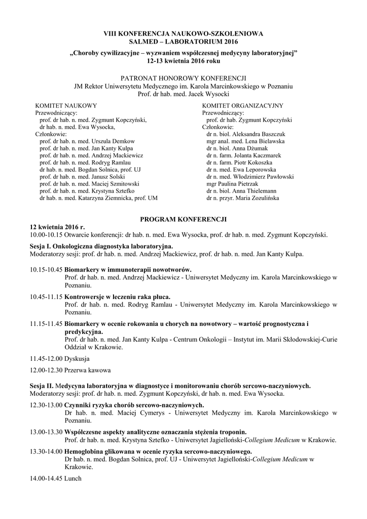 VIII KONFERENCJA NAUKOWO-SZKOLENIOWA SALMED – LABORATORIUM 2016 „Choroby cywilizacyjne – wyzwaniem współczesnej medycyny laboratoryjnej” 12-13 kwietnia 2016 roku PATRONAT HONOROWY KONFERENCJI JM Rektor Uniwersytetu Medycznego im. Karola Marcinkowskiego w Poznaniu Prof. dr hab. med. Jacek Wysocki KOMITET NAUKOWY Przewodniczący: prof. dr hab. n. med. Zygmunt Kopczyński, dr hab. n. med. Ewa Wysocka, Członkowie: prof. dr hab. n. med. Urszula Demkow prof. dr hab. n. med. Jan Kanty Kulpa prof. dr hab. n. med. Andrzej Mackiewicz prof. dr hab. n. med. Rodryg Ramlau dr hab. n. med. Bogdan Solnica, prof. UJ prof. dr hab. n. med. Janusz Solski prof. dr hab. n. med. Maciej Szmitowski prof. dr hab. n. med. Krystyna Sztefko dr hab. n. med. Katarzyna Ziemnicka, prof. UM KOMITET ORGANIZACYJNY Przewodniczący: prof. dr hab. Zygmunt Kopczyński Członkowie: dr n. biol. Aleksandra Baszczuk mgr anal. med. Lena Bielawska dr n. biol. Anna Dżumak dr n. farm. Jolanta Kaczmarek dr n. farm. Piotr Kokoszka dr n. med. Ewa Leporowska dr n. med. Włodzimierz Pawłowski mgr Paulina Pietrzak dr n. biol. Anna Thielemann dr n. przyr. Maria Zozulińska PROGRAM KONFERENCJI 12 kwietnia 2016 r. 10.00-10.15 Otwarcie konferencji: dr hab. n. med. Ewa Wysocka, prof. dr hab. n. med. Zygmunt Kopczyński. Sesja I. Onkologiczna diagnostyka laboratoryjna. Moderatorzy sesji: prof. dr hab. n. med. Andrzej Mackiewicz, prof. dr hab. n. med. Jan Kanty Kulpa. 10.15-10.45 Biomarkery w immunoterapii nowotworów. Prof. dr hab. n. med. Andrzej Mackiewicz - Uniwersytet Medyczny im. Karola Marcinkowskiego w Poznaniu. 10.45-11.15 Kontrowersje w leczeniu raka płuca. Prof. dr hab. n. med. Rodryg Ramlau - Uniwersytet Medyczny im. Karola Marcinkowskiego w Poznaniu. 11.15-11.45 Biomarkery w ocenie rokowania u chorych na nowotwory – wartość prognostyczna i predykcyjna. Prof. dr hab. n. med. Jan Kanty Kulpa - Centrum Onkologii – Instytut im. Marii Skłodowskiej-Curie Oddział w Krakowie. 11.45-12.00 Dyskusja 12.00-12.30 Przerwa kawowa Sesja II. Medycyna laboratoryjna w diagnostyce i monitorowaniu chorób sercowo-naczyniowych. Moderatorzy sesji: prof. dr hab. n. med. Zygmunt Kopczyński, dr hab. n. med. Ewa Wysocka. 12.30-13.00 Czynniki ryzyka chorób sercowo-naczyniowych. Dr hab. n. med. Maciej Cymerys - Uniwersytet Medyczny im. Karola Marcinkowskiego w Poznaniu. 13.00-13.30 Współczesne aspekty analityczne oznaczania stężenia troponin. Prof. dr hab. n. med. Krystyna Sztefko - Uniwersytet Jagielloński-Collegium Medicum w Krakowie. 13.30-14.00 Hemoglobina glikowana w ocenie ryzyka sercowo-naczyniowego. Dr hab. n. med. Bogdan Solnica, prof. UJ - Uniwersytet Jagielloński-Collegium Medicum w Krakowie. 14.00-14.45 Lunch 14.45-15.15 Biomarkery ryzyka sercowo-naczyniowego otyłości – postępy diagnostyczne. Dr hab. n. med. Paweł Bogdański - Uniwersytet Medyczny im. Karola Marcinkowskiego w Poznaniu. 15.15-15.45 Stan przedcukrzycowy – wyzwania diagnostyki laboratoryjnej. Dr hab. n. med. Ewa Wysocka - Uniwersytet Medyczny im. Karola Marcinkowskiego w Poznaniu. 15.45-16.15 Badania laboratoryjne zaburzeń gospodarki lipidowej i lipoproteinowej w chorobach sercowo-naczyniowych. Dr n. biol. Aleksandra Baszczuk, prof. dr hab. Zygmunt Kopczyński - Uniwersytet Medyczny im. Karola Marcinkowskiego w Poznaniu. 16.15-16.30 Dyskusja 13 kwietnia 2016 r. Sesja III. Kliniczno-laboratoryjne aspekty wybranych chorób cywilizacyjnych. Moderatorzy sesji: prof. dr hab. n. med. Janusz Solski, prof. dr hab. n. med. Maciej Szmitkowski 9.30-10.00 Przeciwciała monoklonalne w diagnostyce laboratoryjnej chorób cywilizacyjnych. Prof. dr hab. n. med. Janusz Solski - Uniwersytet Medyczny w Lublinie. 10.00-10.30 Badania laboratoryjne w psychiatrii – nauka a praktyka kliniczna. Prof. dr hab. n. med. Janusz Rybakowski - Uniwersytet Medyczny im. Karola Marcinkowskiego w Poznaniu. 10.30-11.00 Postępy i pułapki w diagnostyce laboratoryjnej chorób tarczycy. Dr hab. n. med. Katarzyna Ziemnicka, prof. UM - Uniwersytet Marcinkowskiego w Poznaniu. Medyczny im. Karola 11.00-11.30 Molekularna diagnostyka w alergologii. Prof. dr hab. n. med. Urszula Demkow - Warszawski Uniwersytet Medyczny. 11.30-12.00 Choroby nerek jako problem diagnostyczny i terapeutyczny w krajach rozwiniętych i rozwijających się. Prof. dr hab. n. med. Alicja Grzegorzewska - Uniwersytet Medyczny im. Karola Marcinkowskiego w Poznaniu. 12.00-12.15 Dyskusja 12.15-12.45 Przerwa kawowa 12.45-15.00 Sesje firmowe (BIOKOM Baka, Olszewski Sp. j.; EKF-DIAGNOSTYKA Sp. z o.o.; LABIN POLSKA Sp. z o.o.; Roche Diagnostics Polska Sp. z o.o.; Siemens Healthcare Sp. z o.o.) 12.45-13.15 Komplementarna rola Freelite i Hevylite w diagnostyce i monitorowaniu pacjentów z gammapatią monoklonalną. Mgr anal. med. Michał Wrzos – BIOKOM Baka, Olszewski Sp. j. 13.15-13.45 Automatyzacja w optymalizacji pracy laboratorium – wydarzenie czy proces? Mgr anal. med. Jolanta Adamiec - Siemens Healthcare Sp. z o.o. 13.45-14.15 POCT – czy szybciej znaczy lepiej. Prof. dr hab. n. med. Krystyna Sztefko - Uniwersytet Jagielloński-Collegium Medicum w Krakowie. 14.15 -14.45 Zarządzanie badaniami w miejscu opieki nad pacjentem w Ginekologiczno-Położniczym Szpitalu Klinicznym Uniwersytetu Medycznego w Poznaniu. Mgr anal. med. Katarzyna Ziółkowska – Ginekologiczno-Położniczy Szpital Kliniczny Uniwersytetu Medycznego im. Karola Marcinkowskiego w Poznaniu. 14.45-15.15 Zarządzanie badaniami laboratoryjnymi z zakresu hemostazy. Dr n. przyr. Maria Zozulińska – Szpital Kliniczny Przemienienia Pańskiego Uniwersytetu Medycznego im. Karola Marcinkowskiego w Poznaniu. 15.15-15.30 Dyskusja. 15.30 – Zakończenie konferencji.