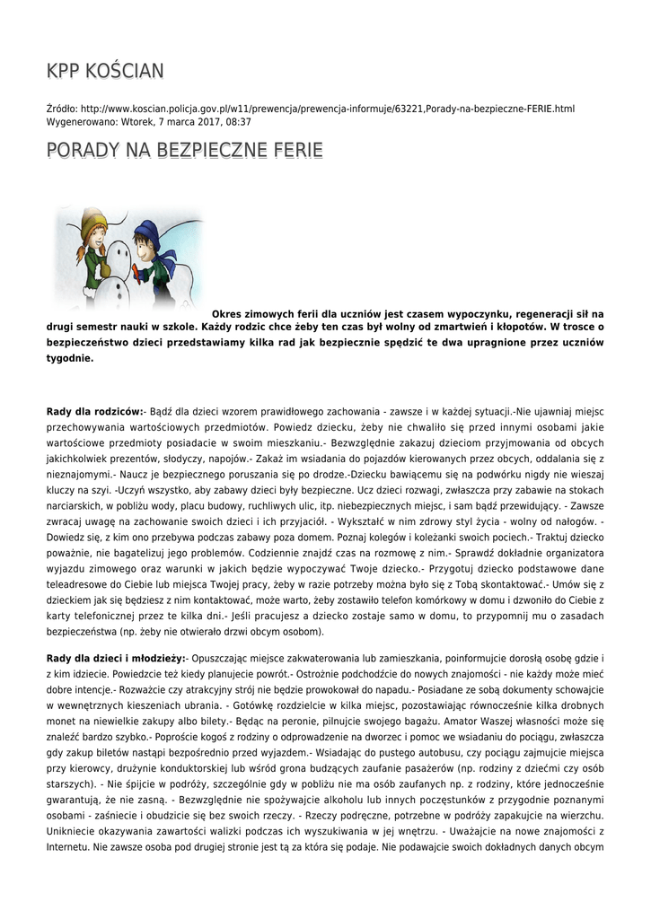 KPP KOŚCIAN Źródło: http://www.koscian.policja.gov.pl/w11/prewencja/prewencja-informuje/63221,Porady-na-bezpieczne-FERIE.html Wygenerowano: Wtorek, 7 marca 2017, 08:37 PORADY NA BEZPIECZNE FERIE Okres zimowych ferii dla uczniów jest czasem wypoczynku, regeneracji sił na drugi semestr nauki w szkole. Każdy rodzic chce żeby ten czas był wolny od zmartwień i kłopotów. W trosce o bezpieczeństwo dzieci przedstawiamy kilka rad jak bezpiecznie spędzić te dwa upragnione przez uczniów tygodnie. Rady dla rodziców:- Bądź dla dzieci wzorem prawidłowego zachowania - zawsze i w każdej sytuacji.-Nie ujawniaj miejsc przechowywania wartościowych przedmiotów. Powiedz dziecku, żeby nie chwaliło się przed innymi osobami jakie wartościowe przedmioty posiadacie w swoim mieszkaniu.- Bezwzględnie zakazuj dzieciom przyjmowania od obcych jakichkolwiek prezentów, słodyczy, napojów.- Zakaż im wsiadania do pojazdów kierowanych przez obcych, oddalania się z nieznajomymi.- Naucz je bezpiecznego poruszania się po drodze.-Dziecku bawiącemu się na podwórku nigdy nie wieszaj kluczy na szyi. -Uczyń wszystko, aby zabawy dzieci były bezpieczne. Ucz dzieci rozwagi, zwłaszcza przy zabawie na stokach narciarskich, w pobliżu wody, placu budowy, ruchliwych ulic, itp. niebezpiecznych miejsc, i sam bądź przewidujący. - Zawsze zwracaj uwagę na zachowanie swoich dzieci i ich przyjaciół. - Wykształć w nim zdrowy styl życia - wolny od nałogów. Dowiedz się, z kim ono przebywa podczas zabawy poza domem. Poznaj kolegów i koleżanki swoich pociech.- Traktuj dziecko poważnie, nie bagatelizuj jego problemów. Codziennie znajdź czas na rozmowę z nim.- Sprawdź dokładnie organizatora wyjazdu zimowego oraz warunki w jakich będzie wypoczywać Twoje dziecko.- Przygotuj dziecko podstawowe dane teleadresowe do Ciebie lub miejsca Twojej pracy, żeby w razie potrzeby można było się z Tobą skontaktować.- Umów się z dzieckiem jak się będziesz z nim kontaktować, może warto, żeby zostawiło telefon komórkowy w domu i dzwoniło do Ciebie z karty telefonicznej przez te kilka dni.- Jeśli pracujesz a dziecko zostaje samo w domu, to przypomnij mu o zasadach bezpieczeństwa (np. żeby nie otwierało drzwi obcym osobom). Rady dla dzieci i młodzieży:- Opuszczając miejsce zakwaterowania lub zamieszkania, poinformujcie dorosłą osobę gdzie i z kim idziecie. Powiedzcie też kiedy planujecie powrót.- Ostrożnie podchodźcie do nowych znajomości - nie każdy może mieć dobre intencje.- Rozważcie czy atrakcyjny strój nie będzie prowokował do napadu.- Posiadane ze sobą dokumenty schowajcie w wewnętrznych kieszeniach ubrania. - Gotówkę rozdzielcie w kilka miejsc, pozostawiając równocześnie kilka drobnych monet na niewielkie zakupy albo bilety.- Będąc na peronie, pilnujcie swojego bagażu. Amator Waszej własności może się znaleźć bardzo szybko.- Poproście kogoś z rodziny o odprowadzenie na dworzec i pomoc we wsiadaniu do pociągu, zwłaszcza gdy zakup biletów nastąpi bezpośrednio przed wyjazdem.- Wsiadając do pustego autobusu, czy pociągu zajmujcie miejsca przy kierowcy, drużynie konduktorskiej lub wśród grona budzących zaufanie pasażerów (np. rodziny z dziećmi czy osób starszych). - Nie śpijcie w podróży, szczególnie gdy w pobliżu nie ma osób zaufanych np. z rodziny, które jednocześnie gwarantują, że nie zasną. - Bezwzględnie nie spożywajcie alkoholu lub innych poczęstunków z przygodnie poznanymi osobami - zaśniecie i obudzicie się bez swoich rzeczy. - Rzeczy podręczne, potrzebne w podróży zapakujcie na wierzchu. Unikniecie okazywania zawartości walizki podczas ich wyszukiwania w jej wnętrzu. - Uważajcie na nowe znajomości z Internetu. Nie zawsze osoba pod drugiej stronie jest tą za która się podaje. Nie podawajcie swoich dokładnych danych obcym osobom, wystarczy imię lub wymyślony Nick.- Jeśli ktoś chce od Was chce zdobyć dużo prywatnych informacji np. miejsca zamieszkania, wyposażenia mieszkania, pracy Waszych rodziców, nich to wzbudzi Waszą czujność i ostrożność. Pamiętajcie, że w Internecie nie jesteście anonimowi. Wszystkim wypoczywającym życzmy miłego i bezpiecznego spędzenia wolnego czasu. Jeśli zorganizowane grupy np. kolonie, szkoły mają jakiekolwiek pytania, lub chcą przeprowadzić spotkanie o tematyce związanej z bezpieczeństwem dzieci i młodzieży, prosimy o kontakt telefoniczny z Wydziałem Prewencji KPP w Kościanie tel. 065 5116221. Ocena: 0/5 (0) Tweetnij
