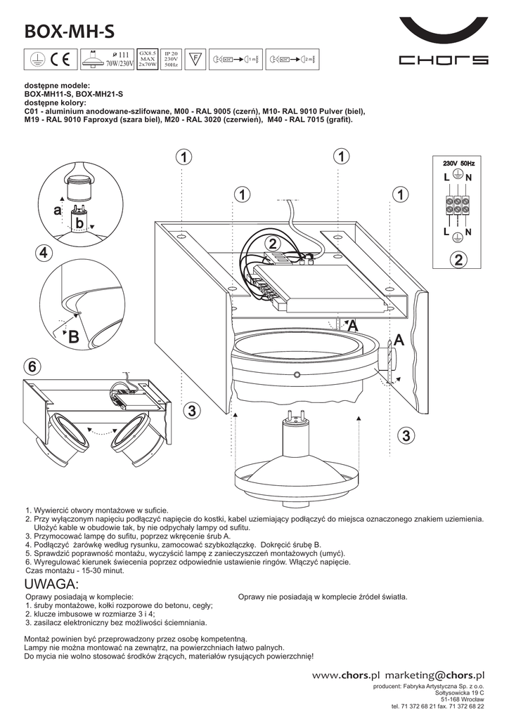 BOX-MH-S o 111 70W/230V GX8.5 MAX 2x70W IP 20 230V 50Hz F 1m 24 24 2m dostępne modele: BOX-MH11-S, BOX-MH21-S dostępne kolory: C01 - aluminium anodowane-szlifowane, M00 - RAL 9005 (czerń), M10- RAL 9010 Pulver (biel), M19 - RAL 9010 Faproxyd (szara biel), M20 - RAL 3020 (czerwień), M40 - RAL 7015 (grafit). 1 1 230V 50Hz 1 a L N L N 1 b 2 4 2 A B A 6 3 3 1. Wywiercić otwory montażowe w suficie. 2. Przy wyłączonym napięciu podłączyć napięcie do kostki, kabel uziemiający podłączyć do miejsca oznaczonego znakiem uziemienia. Ułożyć kable w obudowie tak, by nie odpychały lampy od sufitu. 3. Przymocować lampę do sufitu, poprzez wkręcenie śrub A. 4. Podłączyć żarówkę według rysunku, zamocować szybkozłączkę. Dokręcić śrubę B. 5. Sprawdzić poprawność montażu, wyczyścić lampę z zanieczyszczeń montażowych (umyć). 6. Wyregulować kierunek świecenia poprzez odpowiednie ustawienie ringów. Włączyć napięcie. Czas montażu - 15-30 minut. UWAGA: Oprawy posiadają w komplecie: 1. śruby montażowe, kołki rozporowe do betonu, cegły; 2. klucze imbusowe w rozmiarze 3 i 4; 3. zasilacz elektroniczny bez możliwości ściemniania. Oprawy nie posiadają w komplecie źródeł światła. Montaż powinien być przeprowadzony przez osobę kompetentną. Lampy nie można montować na zewnątrz, na powierzchniach łatwo palnych. Do mycia nie wolno stosować środków żrących, materiałów rysujących powierzchnię! www.chors.pl [email protected] producent: Fabryka Artystyczna Sp. z o.o. Sołtysowicka 19 C 51-168 Wrocław tel. 71 372 68 21 fax. 71 372 68 22