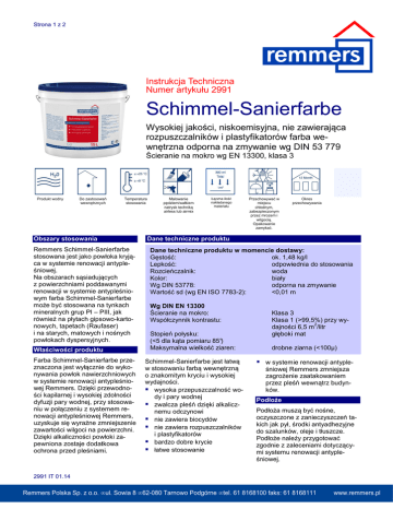 Strona 1 z 2 Instrukcja Techniczna Numer artykułu 2991 Schimmel-Sanierfarbe Wysokiej jakości, niskoemisyjna, nie zawierająca rozpuszczalników i plastyfikatorów farba wewnętrzna odporna na zmywanie wg DIN 53 779 Ścieranie na mokro wg EN 13300, klasa 3 Produkt wodny Do zastosowań wewnętrznych Temperatura stosowania Obszary stosowania Remmers Schimmel-Sanierfarbe stosowana jest jako powłoka kryjąca w systemie renowacji antypleśniowej. Na obszarach sąsiadujących z powierzchniami poddawanymi renowacji w systemie antypleśniowym farba Schimmel-Sanierfarbe może być stosowana na tynkach mineralnych grup PI – PIII, jak również na płytach gipsowo-kartonowych, tapetach (Raufaser) i na starych, matowych i nośnych powłokach dyspersyjnych. Właściwości produktu Farba Schimmel-Sanierfarbe przeznaczona jest wyłącznie do wykonywania powłok nawierzchniowych w systemie renowacji antypleśniowej Remmers. Dzięki przewodności kapilarnej i wysokiej zdolności dyfuzji pary wodnej, przy stosowaniu w połączeniu z systemem renowacji antypleśniowej Remmers, uzyskuje się wyraźne zmniejszenie zawartości wilgoci na powierzchni. Dzięki alkaliczności powłoki zapewniona zostaje dodatkowa ochrona przed pleśniami. Malowanie pędzlem/wałkiem natrysk techniką airless lub airmix Łączna ilość nakładanego materiału Przechowywać w miejscu chłodnym, zabezpieczonym przez mrozem i wilgocią. Opakowanie zamykać. Okres przechowywania Dane techniczne produktu Dane techniczne produktu w momencie dostawy: Gęstość: ok. 1,48 kg/l Lepkość: odpowiednia do stosowania Rozcieńczalnik: woda Kolor: biały Wg DIN 53778: odporna na zmywanie Wartość sd (wg EN ISO 7783-2): <0,01 m Wg DIN EN 13300 Ścieranie na mokro: Współczynnik kontrastu: Stopień połysku: (<5 dla kąta pomiaru 85°) Maksymalna wielkość ziaren: Schimmel-Sanierfarbe jest łatwą w stosowaniu farbą wewnętrzną o znakomitym kryciu i wysokiej wydajności. wysoka przepuszczalność wody i pary wodnej zwalcza pleśń dzięki alkalicznemu odczynowi nie zawiera biocydów nie zawiera rozpuszczalników i plastyfikatorów bardzo dobre krycie łatwe stosowanie Klasa 3 Klasa 1 (>99,5%) przy wy2 dajności 6,5 m /litr głęboki mat drobne ziarna (<100µ) w systemie renowacji antypleśniowej Remmers zmniejsza zagrożenie zaatakowaniem przez pleśń wewnątrz budynków. Podłoże Podłoża muszą być nośne, oczyszczone z zanieczyszczeń takich jak pył, środki antyadhezyjne do szalunków, oleje i tłuszcze. Podłoże należy przygotować zgodnie z zaleceniami dotyczącymi systemu renowacji antypleśniowej. 2991 IT 01.14 Remmers Polska Sp. z o.o. • ul. Sowia 8 • 62-080 Tarnowo Podgórne • tel. 61 8168100 faks: 61 8168111 www.remmers.pl Strona 2 z 2 Obszary sąsiadujące z powierzchniami poddanymi renowacji antypleśniowej: Chłonące podłoża mineralne (np. tynki grup PI – PIII) oraz nasiąkliwe płyty gipsowo-kartonowe należy zagruntować preparatem Sporenbinder (wiążącym zarodniki pleśni). Mocno przylegające tapety, także tapety papierowe typu Raufaser, bez wstępnego przygotowania pokryć farbą Schimmel Sanierfarbe nakładaną w dwóch warstwach. Odspojone tapety w całości usunąć. Zmyć klej i resztki papieru. Stare powłoki klejowe i wapienne dokładnie zmyć i używając szczotki wetrzeć w podłoże do nasycenia preparat Sporenbinder. Sposób stosowania Przy nakładaniu pierwszej warstwy farby Schimmel-Sanierfarbe na prawidłowo przygotowane powierzchnie poddane renowacji antypleśniowej oraz obszary przylegające należy ją rozcieńczyć przez dodanie maks. 10% wody. Drugą warstwę wykonuje się farbą nie rozcieńczoną. W przypadku nakładania 2 warstw zużycie wynosi ok. 0,30 l/m². Narzędzia, czyszczenie Wałek, pędzel, ławkowiec, urządzenie natryskowe typu airless. Czyścić wodą. Rodzaj opakowania, zużycie, składowanie Rodzaj opakowania: Pojemniki z tworzywa sztucznego: 5 l i 15 l Zużycie: Na każdą warstwę ok. 150 ml/m² (w zależności od właściwości podłoża). Składowanie: W oryginalnych, zamkniętych pojemnikach przy składowaniu w miejscu chłodnym ale zabezpieczonym przed mrozem, co najmniej 12 miesięcy. Bezpieczeństwo, usuwanie Bliższe informacje na temat bezpieczeństwa podczas transportu, składowania i stosowania oraz na temat usuwania i ochrony środowiska znajdują się w aktualnej karcie charakterystyki produktu. Kod produktu M-SK 01 Temperatura stosowania: Nie stosować w temperaturach poniżej +8ºC (temperatura podłoża i powietrza). Powyższe wskazówki zostały zestawione w naszym dziale produkcji według najnowszego stanu wiedzy i techniki stosowania. Ponieważ rodzaje zastosowań i sposób użycia są poza naszą kontrolą, z treści tej instrukcji nie wynika żadna odpowiedzialność producenta. Wskazówki wykraczające poza zawartość tej instrukcji lub wskazówki różniące się od treści instrukcji wymagają pisemnego potwierdzenia przez zakład macierzysty. W każdym przypadku obowiązują nasze ogólne warunki handlowe. Z wydaniem niniejszej instrukcji technicznej poprzednie tracą swoją ważność. 2991 IT 01.14 Remmers Polska Sp. z o.o. • ul. Sowia 8 • 62-080 Tarnowo Podgórne • tel. 61 8168100 faks: 61 8168111 www.remmers.pl