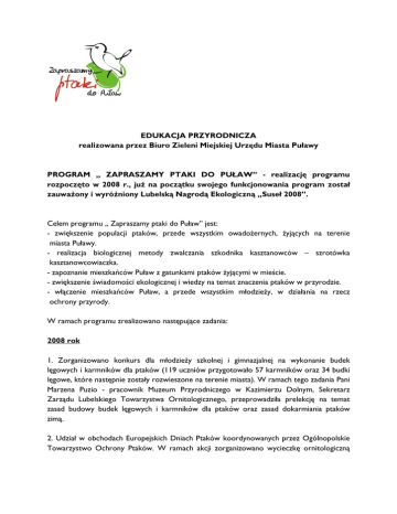 EDUKACJA PRZYRODNICZA realizowana przez Biuro Zieleni Miejskiej Urzędu Miasta Puławy PROGRAM „ ZAPRASZAMY PTAKI DO PUŁAW” - realizację programu rozpoczęto w 2008 r., juŜ na początku swojego funkcjonowania program został zauwaŜony i wyróŜniony Lubelską Nagrodą Ekologiczną „Suseł 2008”. Celem programu „ Zapraszamy ptaki do Puław” jest: - zwiększenie populacji ptaków, przede wszystkim owadoŜernych, Ŝyjących na terenie miasta Puławy. - realizacja biologicznej metody zwalczania szkodnika kasztanowców – szrotówka kasztanowcowiaczka. - zapoznanie mieszkańców Puław z gatunkami ptaków Ŝyjącymi w mieście. - zwiększenie świadomości ekologicznej i wiedzy na temat znaczenia ptaków w przyrodzie. - włączenie mieszkańców Puław, a przede wszystkim młodzieŜy, w działania na rzecz ochrony przyrody. W ramach programu zrealizowano następujące zadania: 2008 rok 1. Zorganizowano konkurs dla młodzieŜy szkolnej i gimnazjalnej na wykonanie budek lęgowych i karmników dla ptaków (119 uczniów przygotowało 57 karmników oraz 34 budki lęgowe, które następnie zostały rozwieszone na terenie miasta). W ramach tego zadania Pani Marzena Puzio - pracownik Muzeum Przyrodniczego w Kazimierzu Dolnym, Sekretarz Zarządu Lubelskiego Towarzystwa Ornitologicznego, przeprowadziła prelekcję na temat zasad budowy budek lęgowych i karmników dla ptaków oraz zasad dokarmiania ptaków zimą. 2. Udział w obchodach Europejskich Dniach Ptaków koordynowanych przez Ogólnopolskie Towarzystwo Ochrony Ptaków. W ramach akcji zorganizowano wycieczkę ornitologiczną połączoną z pogadanką, rozpoznawaniem i liczeniem ptaków. Wycieczkę prowadził Pan Paweł Szewczyk - Przewodniczący Zarządu Lubelskiego Towarzystwa Ornitologicznego. 3. Zorganizowano akcję ochrony Jerzyka /Apus apus/ (ptak pod ścisłą ochroną gatunkową). Przygotowano pisma do zarządców spółdzielni mieszkaniowych z terenu miasta, dotyczące ochrony miejsc gniazdowania ptaków. Przestrzeń miejska (wysoka zabudowa blokowa) stała się miejscem bytowania tego gatunku. 4. Przeprowadzono prelekcje w placówkach oświatowych miasta, na temat biologicznej walki (ptaki owadoŜerne) ze szkodnikiem kasztanowców - szrotówkiem kasztanowcowiaczkiem. Prelekcje poprowadził Pan Robert Stolar – leśnik sprawujący nadzór i utrzymanie w lasach miejskich. 2009 rok 1. Przeprowadzono konkurs fotograficzny „Ptaki Puław w obiektywie”, skierowany do uczniów puławskich placówek oświatowych (zgłoszone zostały łącznie 92 fotografie, nadesłane przez 21 uczniów). 2. W ramach obchodów Europejskich Dni Ptaków, koordynowanych przez Ogólnopolskie Towarzystwo Ochrony Ptaków zorganizowano, po raz kolejny, wycieczkę ornitologiczną po zielonych terenach miasta, połączoną z obserwacją i liczeniem ptaków. Wycieczkę poprowadził Pan Piotr Safader - członek Lubelskiego Towarzystwa Ornitologicznego. 3. Zlecono przygotowanie prelekcji pn. „Ptaki w mieście”, którą w placówkach oświatowych Puław przeprowadziła Pani Marzena Puzio. W sumie odbyło się 30 spotkań z młodzieŜą puławskich szkół podstawowych i gimnazjalnych, w zajęciach wzięło udział 643 uczniów z 30 klas. Poruszane tematy to m.in.: gatunki ptaków mieszkających w mieście, znaczenie i warunki Ŝycia ptaków w mieście, moŜliwości pomocy ptakom w mieście i sposoby zabezpieczania się przed uciąŜliwościami z ich strony. 4. Zlecono opracowanie „Inwentaryzacji ornitologicznej miasta Puławy”. Przygotowany materiał (nośnik CD) wykonany przez puławskiego ornitologa Pana Piotra Safadera, członka Lubelskiego Towarzystwa Ornitologicznego, posłuŜy do wydania w 2010 r. publikacji ksiąŜkowej o ptakach Puław. 5. Organizacja akcji ochrony Jerzyka /Apus apus/ kontynuacja działań rozpoczętych w 2008r. - zlecono wykonanie (współpraca MłodzieŜowy Ośrodek Wychowawczy w Puławach) 20szt. budek lęgowych i przekazano je bezpłatnie do zamontowana na terenie puławskich spółdzielni mieszkaniowych (potwierdzono zasiedlenie części budek juŜ w 2009 r.) - wykonano folder informacyjny „Jerzyk – podniebny akrobata” w ilości 1000 szt. Folder zawierający m.in. zasady pomocy jerzykom, jest bezpłatnie rozprowadzany na terenie miasta. Do realizacji w roku 2010 przewidziano: 1. Kontynuację akcji czynnej ochrony Jerzyka /Apus apus/ w odniesieniu do stwarzania mu nowych miejsc lęgowych. Zaplanowano wykonanie 40 szt. budek lęgowych i przekazanie ich bezpłatnie do zamontowania przez spółdzielnie mieszkaniowe na terenie miasta. 2. Wydrukowanie publikacji ksiąŜkowej (250 szt.) - „Inwentaryzacja ornitologiczna miasta Puławy”, na podstawie wyników obserwacji przeprowadzonych w 2009 r. KsiąŜka będzie materiałem edukacyjnym, nieodpłatnie przekazywanym do placówek oświatowych, jak równieŜ wykorzystywana jako nagroda w konkursach ekologicznych i jako materiał promujący nasze miasto. 3. Udział w kolejnych obchodach Europejskich Dniach Ptaków we współpracy z Ogólnopolskim Towarzystwem Ochrony Ptaków. Poza programem „ Zapraszamy ptaki do Puław” - w ramach utrzymania i ochrony lasów komunalnych zaplanowano w latach 2009-2011 montaŜ ponad 100 szt. budek lęgowych dla ptaków. Ponadto w zakresie wydawanych przez Biuro Zieleni Miejskiej zezwoleń na wycinkę drzew i krzewów z terenu miasta, promowane są nasadzenia rekompensujące drzew i krzewów o jadalnych owocach, jako baza pokarmowa dla ptaków. Dodatkowo w roku 2010, poza kontynuacją programu „ Zapraszamy ptaki do Puław”, Biuro Zieleni Miejskiej wprowadza dwa nowe programy, z zakresu edukacji przyrodniczej: 1. Organizacja akcji: „Leśna szkoła” /współpraca: Mentor - Połczyn Zdrój, Komenda Hufca Puławy ZHP, Nadleśnictwo Puławy/ w ramach akcji przewiduje się: - wykonanie ścieŜki dydaktycznej „Leśna szkoła” (m.in. 11 szt. tablic edukacyjnych pn. „Lekcja dendrologii”, 4 szt. tablic edukacyjnych o ekosystemie