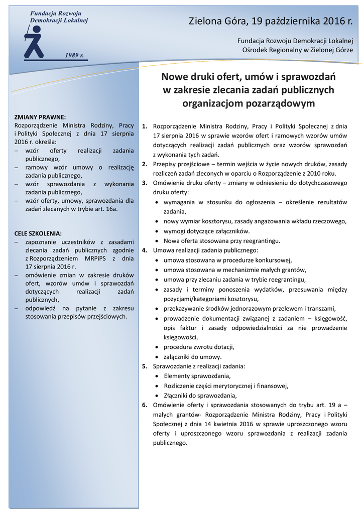 1. Zielona Góra, 19 października 2016 r. Rozwiązania informatyczne Fundacja Rozwoju Demokracji Lokalnej Ośrodek Regionalny w Zielonej Górze Nowe druki ofert, umów i sprawozdań w zakresie zlecania zadań publicznych organizacjom pozarządowym ZMIANY PRAWNE: Rozporządzenie Ministra Rodziny, Pracy i Polityki Społecznej z dnia 17 sierpnia 2016 r. określa: wzór oferty realizacji zadania publicznego, ramowy wzór umowy o realizację zadania publicznego, wzór sprawozdania z wykonania zadania publicznego, wzór oferty, umowy, sprawozdania dla zadań zlecanych w trybie art. 16a. CELE SZKOLENIA: zapoznanie uczestników z zasadami zlecania zadań publicznych zgodnie z Rozporządzeniem MRPiPS z dnia 17 sierpnia 2016 r. omówienie zmian w zakresie druków ofert, wzorów umów i sprawozdań dotyczących realizacji zadań publicznych, odpowiedź na pytanie z zakresu stosowania przepisów przejściowych. 1. Rozporządzenie Ministra Rodziny, Pracy i Polityki Społecznej z dnia 17 sierpnia 2016 w sprawie wzorów ofert i ramowych wzorów umów dotyczących realizacji zadań publicznych oraz wzorów sprawozdań z wykonania tych zadań. 2. Przepisy przejściowe – termin wejścia w życie nowych druków, zasady rozliczeń zadań zleconych w oparciu o Rozporządzenie z 2010 roku. 3. Omówienie druku oferty – zmiany w odniesieniu do dotychczasowego druku oferty: wymagania w stosunku do ogłoszenia – określenie rezultatów zadania, nowy wymiar kosztorysu, zasady angażowania wkładu rzeczowego, wymogi dotyczące załączników. Nowa oferta stosowana przy reegrantingu. 4. Umowa realizacji zadania publicznego: umowa stosowana w procedurze konkursowej, umowa stosowana w mechanizmie małych grantów, umowa przy zlecaniu zadania w trybie reegrantingu, zasady i terminy ponoszenia wydatków, przesuwania między pozycjami/kategoriami kosztorysu, przekazywanie środków jednorazowym przelewem i transzami, prowadzenie dokumentacji związanej z zadaniem – księgowość, opis faktur i zasady odpowiedzialności za nie prowadzenie księgowości, procedura zwrotu dotacji, załączniki do umowy. 5. Sprawozdanie z realizacji zadania: Elementy sprawozdania, Rozliczenie części merytorycznej i finansowej, Złączniki do sprawozdania, 6. Omówienie oferty i sprawozdania stosowanych do trybu art. 19 a – małych grantów- Rozporządzenie Ministra Rodziny, Pracy i Polityki Społecznej z dnia 14 kwietnia 2016 w sprawie uproszczonego wzoru oferty i uproszczonego wzoru sprawozdania z realizacji zadania publicznego. Prowadzący: Zajmuje się zagadnieniami współpracy administracji publicznej z organizacjami pozarządowymi. Pracował w Ministerstwie Pracy i Polityki Społecznej. Wykładowca akademicki, doświadczony szkoleniowiec. Autor książki „Ustawa o działalności SZ KO L EN I E S K I ERO W ANE D O : pożytku publicznego i o wolontariacie”. Powołany przez Ministra Rozwoju pracowników samorządowych zajmujących Regionalnego na eksperta do oceny projektów realizowanych w ramach programów się współpracą z organizacjami operacyjnych na lata 2007-2013 w dziedzinie „Umacnianie społeczeństwa pozarządowymi w zakresie zlecania im zadań obywatelskiego, pozarządowych oraz partnerów społecznych i gospodarczych”. publicznych oraz przedstawicieli organizacji pozarządowych DA N E DO K O NT A KT U: Fundacja Rozwoju Demokracji Lokalnej Ośrodek Regionalny w Zielonej Górze 65-048 Zielona Góra Al. Niepodległości 16/9, III piętro Tel. 68 45 32 209 fax. 68 41 99 097 e-mail: [email protected] s tro n a: www.f r d l. or g O SO B A DO KO NT A KT U: Rafał Kordas, tel. 68 45 32 207 e-mail: [email protected] Miejsce: Fundacja Rozwoju Demokracji Lokalnej Ośrodek Regionalny w Zielonej Górze Al. Niepodległości 16/9, 65-048 Zielona Góra, III piętro Termin i godzina: 19 października 2016 r. godz.10.00-15.00 Cena: 339 zł netto/os. - Zwolnione z VAT w przypadku finansowania szkolenia ze środków publicznych. - Cena zawiera: materiały szkoleniowe, długopis, notes, zaświadczenie o ukończeniu szkolenia, lunch oraz przerwy kawowe. RABAT 10% za każdą następną osobę zgłoszoną z tej samej instytucji Zgłoszenia: Prosimy przesyłać drogą elektroniczną wypełniając formularz zgłoszenia, który znajduje się na www.frdl.org/szkolenia,pl.html lub faksem na nr 68 419 90 97 lub 68 419 90 98 do dnia 14października 2016r. Uwaga: Brak pisemnej rezygnacji na 3 dni robocze przed szkoleniem będzie równoznaczne z obciążeniem Państwa pełnym kosztem szkolenia. Płatność przelewem, na podstawie faktury wystawionej w dniu szkolenia. Zgłoszenie (3W) – Nowe druki ofert, umów i sprawozdań w zakresie zlecania zadań publicznych organizacjom pozarządowym – 19.10.2016 r. Nazwa Nabywcy do faktury:..........................................................................................……………………………………………………………………………………. Ulica, nr: ........................................................... Miejscowość ………………………………….………………kod pocztowy…………….…………………………………. NIP: .............................................................................................Tel: .................................................................................................................... 1. ............................................................................................................................................................................................................................ imię i nazwisko, (wypełnić drukowanymi) wydział/ stanowisko 2.............................................................................................................................................................................................................................. imię i nazwisko, (wypełnić drukowanymi) wydział/ stanowisko RABAT 10% Oświadczam, że szko