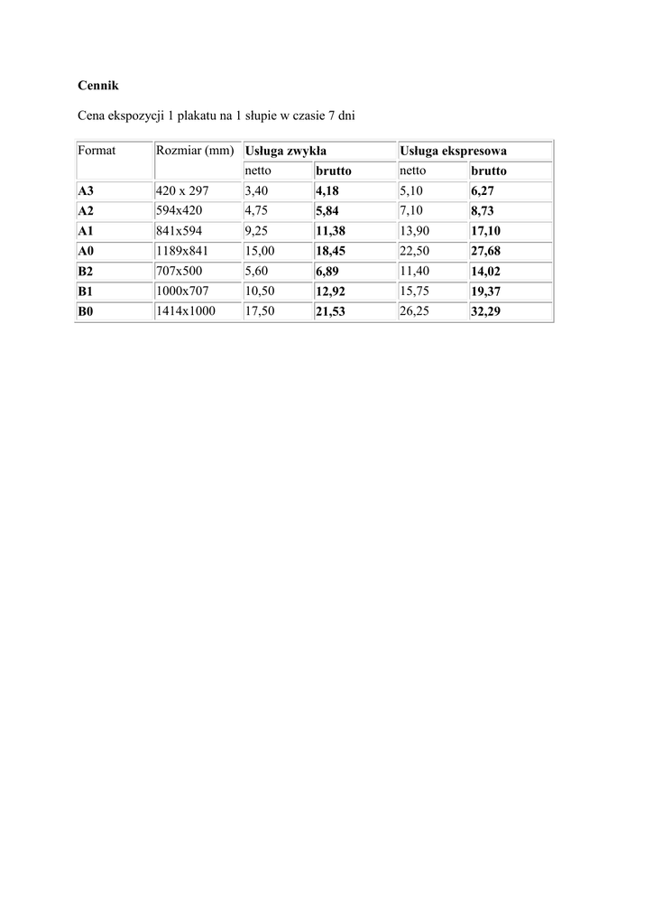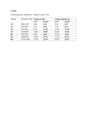 Cennik Cena ekspozycji 1 plakatu na 1 słupie w czasie 7 dni Format Rozmiar (mm) Usługa zwykła netto brutto Usługa ekspresowa netto brutto A3 420 x 297 3,40 4,18 5,10 6,27 A2 594x420 4,75 5,84 7,10 8,73 A1 841x594 9,25 11,38 13,90 17,10 A0 1189x841 15,00 18,45 22,50 27,68 B2 707x500 5,60 6,89 11,40 14,02 B1 1000x707 10,50 12,92 15,75 19,37 B0 1414x1000 17,50 21,53 26,25 32,29