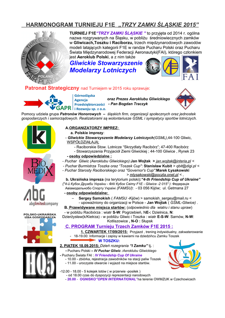 HARMONOGRAM TURNIEJU F1E „TRZY ZAMKI ŚLĄSKIE 2015” TURNIEJ F1E“TRZY ZAMKI ŚLĄSKIE ” to przyjęta od 2014 r. ogólna nazwa rozgrywanych na Śląsku, w pobliżu średniowiecznych zamków w Gliwicach,Toszku i Raciborzu, trzech międzynarodowych zawodów modeli latających kategorii F1E w randze Pucharu Polski oraz Pucharu Świata Międzynarodowej Federacji Aeronautyki(FAI), którego członkiem jest Aeroklub Polski, a z nim także Gliwickie Stowarzyszenie Modelarzy Lotniczych Patronat Strategiczny nad Turniejem w 2015 roku sprawuje: oraz Prezes Aeroklubu Gliwickiego - Pan Bogdan Traczyk Pomocy udziela grupa Patronów Honorowych – śląskich firm, organizacji społecznych oraz jednostek gospodarczych i samorządowych. Realizatorami są wolontariusze GSML i sympatycy sportów lotniczych. ul.Kolberga 42/4 ,ul.Opawska 49/4 A.ORGANIZATORZY IMPREZ: a. Polskie imprezy: - Gliwickie Stowarzyszenie Modelarzy Lotniczych(GSML),44-100 Gliwic, WSPÓŁDZIAŁAJĄ: - Raciborskie Stow. Lotnicze “Skrzydlaty Racibórz”; 47-400 Racibórz - Stowarzyszenia Przyjaciół Ziemi Gliwickiej ; 44-100 Gliwice , Rynek 23 - osoby odpowiedzialne : - Puchar Gliwic (Aeroklubu Gliwickiego):Jan Wojtak > [email protected] < - Puchar Burmistrza Toszka oraz “Toszek Cup": Stanisław Kubit > [email protected] < - Puchar Starosty Raciborskiego oraz "Governor's Cup":Marek Łysakowski > [email protected] < , b. Ukraińska impreza (na terytorium polski):“4-th Friendship Cup of Ukraine” ("4-й Кубок Дружби України - ФАІ Кубок Cвіту F1E - Gliwice -2 015" ): Федерація Авіамодельнобо Спорту Україні (FAMSU): - 03 056 Kijów; ul. Getmana 27 - osoby odpowiedzialne: – Sergey Samokish ( FAMSU -Kijów) > [email protected] < - upoważniony do organizacji w Polsce - Jan Wojtak ( GSML-Gliwice) . B. Przewidywane miejsca startów: (odpowiednio dla wiatru i stanu upraw) - w pobliżu Racibórza : wiatr S-W: Pogrzebień, NE-: Dzielnica, N: Dzierżysław(k/Kietrza) - w pobliżu Gliwic i Toszka : wiatr E-S-W: Sarnów, N-W: Kotliszowice , N-O : Słupsk C. PROGRAM Turnieju Trzech Zamków F1E 2015 : 1. CZWARTEK 17/09/2015: Przyjazd , trening indywidualny, zakwaterowanie - 18-19.00: Informacje i zapisy w kawiarni na dziedzińcu Zamku Toszek W TOSZKU: 2. PIĄTEK 18.09.2015: Dzień rozegrania “I Zamku” tj. : - Pucharu Polski – IV Puchar Gliwic :Aeroklubu Gliwickiego - Pucharu Świata FAI : IV Friendship Cup Of Ukraine - 10.00 - zbiórka, rejestracja zawodników na stacji paliw Toszek - 11.00 - uroczyste otwarcie i wyjazd na miejsce startów. -12.00 - 18.00 - 5 kolejek lotów ( w przerwie -posiłek ) - od 18.00 czas do dyspozycji reprezentacji narodowych - 20.00 - OGNISKO“OPEN INTERNATIONAL”na terenie OWMZUK w Czechowicach W TOSZKU 3.SOBOTA 19.09.2015 : dzień rozegrania “II Zamku” tj. - Pucharu Polski – X Puchar Burmistrza Toszka oraz - Pucharu Świata FAI - X Toszek Cup - 8.00-9.00- zbiórka i rejestracja zawodników na stacji paliw Toszek ul. Gliwicka 1 - 9.00 - uroczyste otwarcie i wyjazd na miejsce startów. -10.00 -15.00 - 5 kolejek lotów ( w przerwie -posiłek ) - 16.30 –uroczyste zakończenie zawodów “I i II Zamku” - na Zamku Toszek – w programie pokaz walki powietrznej modeli na uwięzi (F2D) - Chornyy Team -UKR - wręczenie trofeów zwycięzcom indywidualnym i zespołowym: Friendship Cup of Ukraine i Toszek Cup oraz Pucharów Polski F1E – Puchar Gliwic i Puchar Toszka 18.00 Wspólna Kolacja – sala bankietowa na Zamku Toszek – w trakcie - wręczenie podziękowań Patronom Regionu Gliwickiego z okazji 15 rocznicy I Pucharu Świata “Governor's Cup”(2000) -informacja Prezesa GSML o efektach patronatu, czyli o dokonaniach GSML od 2000 r 4.NIEDZIELA 20.09.2015 W RACIBORZU - Pucharu Polski : XVI Puchar Polski Starosty Powiatu Raciborskiego oraz - Pucharu Świata FAI: XVI Governor's Cup. -8.00 - Zbiórka zawodników na parkingu Le Clarc ul. Opawska -8.30 - Otwarcie i wyjazd do miejsca startów ( zależnie owiatru) . -9.30 -15.30 - 5 kolejek lotów i dogrywki (w przerwie posiłek ) - 16.00 -17.30 - zamknięcie imprez na Zamku Racibórz: wręczenie trofeów zwycięzcom indywidualnym i zespołowym: 1.Pucharu Polski oraz Pucharu Świata: Starosty Raciborskiego i Governor's Cup 2.Podsumowanie Turnieju Trzech Zamków 2015 wręczenie nagród: a. Najmłodszemu Zawodnikowi Turnieju Trzech Zamków b. Najlepszym 3 zawodnikom zagranicznym; c. Najlepszym 3 zawodnikom polskim; d. Pucharu “Fair Play” Turnieju dla zawodnika wyróżniającego się sportową elegancją ; e. Pucharu “Gracji” - najlepszej zawodniczce Turnieju f. Statuetki “Victorii F1E”- trofeum przechodnie- za najlepszy wynik Turnieju Trzech Zamków: Gliwice-Toszek-Racibórz -18.00 -Spotkanie rocznicowe z Patronami 15-lecia ( w sali restauracji “Zamek”) w trakcie : Uhonorowanie Patronów 15-lecia regionu Raciborskiego z okazji 15 rocznicy I Pucharu Starosty Raciborskiego - z udziałem Mistrzów Polski ,Mistrzów Świata , Mistrzów Europy i zwycięzców Pucharów Świata - jako prezentacja efektów wspierania Stowarzyszeń Modelarskich – Gliwickiego Stowarzyszenia Modelarzy Lotniczych (GSML) oraz Raciborskiego Stowarzyszenia Lotniczego -”Skrzydlaty Racibórz” w animacji działalności sportowej klubów modelarstwa lotniczego na Śląsku. ZAPRASZAMY ZA ROK NA II EDYCJĘ WALKI O STATUETKĘ VICTORII F1E Uwaga : bieżące informacje o imprezach można znaleźć także : https://www.facebook.com/f1ethreecastlescup http://www.facebook.com/groups/swobodni/ http://gsml.gliwice.pl/