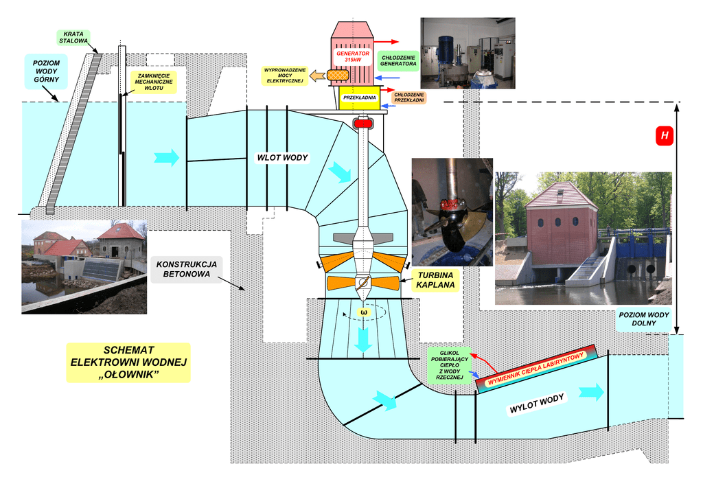 KRATA STALOWA POZIOM WODY GÓRNY GENERATOR 315kW ZAMKNIĘCIE MECHANICZNE WLOTU CHŁODZENIE GENERATORA WYPROWADZENIE MOCY ELEKTRYCZNEJ PRZEKŁADNIA CHŁODZENIE PRZEKŁADNI H WLOT WODY KONSTRUKCJA BETONOWA TURBINA KAPLANA ω SCHEMAT ELEKTROWNI WODNEJ „OŁOWNIK” POZIOM WODY DOLNY GLIKOL POBIERAJĄCY CIEPŁO Z WODY RZECZNEJ IK IENN M Y W CIEP YN ABIR L A Ł ODY W T O WYL Y TOW KRATA STALOWA POZIOM WODY GÓRNY GENERATOR 315kW ZAMKNIĘCIE MECHANICZNE WLOTU CHŁODZENIE GENERATORA WYPROWADZENIE MOCY ELEKTRYCZNEJ PRZEKŁADNIA CHŁODZENIE PRZEKŁADNI WLOT WODY H POZIOM WODY DOLNY KONSTRUKCJA BETONOWA TURBINA KAPLANA ω SCHEMAT ELEKTROWNI WODNEJ „OŁOWNIK” GLIKOL POBIERAJĄCY CIEPŁO Z WODY RZECZNEJ IE WYM N BIRY A L ŁA CIEP K I N N Y WOD T O WYL Y TOW KRATA STALOWA ZAMKNIĘCIE MECHANICZNE WLOTU WIDOK Z GÓRY GLIKOL POBIERAJĄCY CIEPŁO Z WODY RZECZNEJ WYMIENNIK CIEPŁA LABIRYNTOWY SCHEMAT ELEKTROWNI WODNEJ „OŁOWNIK”