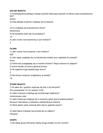 DOLNE MIASTO 1) Przedstawienia jakiego rodzaju budowli dekorują budynek na którym jest przedstawiony lew? Zamki 2) Koło jakiego budynku znajduje się ta latarnia ... 3) Co znajduje się powyżej tych drzwi? Dzwonnica 4) Ile bobasów bawi się na poddaszu? 12 5) Jaki numer nosi kamienica z tym herbem? 4 OLIWA 1) Jaki numer nosi budynek o tym imieniu? 529 2) Jaki napis znajduje się na kamiennej rzeźbie przy wjeździe do posesji? Anno 3) Gdzie tak przeglądają się w wodzie drzewa? Skąd zrobiono to zdjęcie? Z końca kanału od strony głównej bramy 4) Ile zegarów kryje fasada tego domu? 2 5) Na którym budynku znajdziemy te kwiaty? 18 STARE MIASTO 1) W jakie dni i godziny wyjmuje się listy z tej skrzynki? Dni powszednie 15-19, sobota 13:00 2) Jakie maszyny znajdują się poniżej tego żaglowca? Lokomotywa, piec 3) Jaka instytucja znajduje się w budynku gdzie jest ta płaskorzeźba? Muzeum Narodowe w Gdańsku oddział Brama Zielona 4) Obok jakich osób odcisnął dłoń słynny gdański pisarz? ... 5) Jaka figura znajduje się poniżej tej na zdjęciu? Chłopiec ZASPA 1) Do jakiej grupy etnicznej należy druga postać na tym muralu? ... 2) Co znajduje się poniżej tego spojrzenia? Kula ziemska 3) Ile postaci ludzkich przedstawia ten mural? 9 4) W którym rogu obrazu znajduje się to logo? ... 5) Jaki ma numer blok, na którym lata ten samolot? 3 WRZESZCZ 1) Która część pomnika złoci się? Buty 2) Jaka data znajduje się na ścianie z budowli? Dwór kurniczki 1763 3) Jaki numer ma ten dom? ... 4) Jak wygląda herb właścicieli tego domu? Herb przecina pod kątem wstęga 5) Kto trzyma tę księgę? Jan Gutenberg BRZEŹNO 1) Jaka litera znajduje się na drugim skrzydle drzwi? O 2) Jaka data widnieje na pierwszym domu na tej ulicy? 1891, Miła1 3) Z której strony tego domu zamurowano wejście? 4) Z prawej (patrząc od frontu) 5) Jaki numer ma dom z tym „kwiatkiem”? 6 CMENTARZE 1. Jak w całości brzmi napis znajdujący się powyżej? Tym, co imion nie mają na grobie, a tylko Bóg wie, jak kto się zowie 2. Co znajduje się za żołnierzami uwiecznionymi na obelisku obok tego napisu? Czołg 3. Co znajduje się obok głównego wejścia na ten cmentarz? Kościół parafialny św. Teresy od Dzieciątka Jezus (Parafia rzymskokatolicka pw. Św. Teresy od Dzieciątka Jezus) 4. Kogo upamiętnia ten pomnik? Grupę żołnierzy Austryjackich, a także Polaków, Ukraińców pochowanych także w Suchostrzygach Tczewskich. Zmarli oni na tyfus w pruskim obozie A. D. 1866 5. Jakie imię nosi osoba z najstarszej macewy (1841 r.) znajdującej się na cmentarzu? Abraham NOWY PORT 1) Ile kosztuje przewóz roweru do tej twierdzy? 1 zł 2) Co jest napisane na tablicy z tyłu karczmy? Zakaz wstępu. Budynek w złym stanie technicznym. 3) Kto „śpi” w tym budynku? Tramwaje 4) Co to za ryba, która na nas spoziera znad tego gzymsu? Dorsz 5) W jakich kolorach jest znajdujący się nieopodal kapitanat portu? Żółty/pomarańczowy i czerwony/ceglany ORUNIA 1) Ile kolumn podtrzymuje ten podcień? 9 2) Co kupisz za tymi drzwiami? Mięso, ryby 3) Co jest napisane poniżej tego słowa? Ok.1800 r., Zabytek Kultury, podlega ochronie prawnej 4) Co obecnie mieści się w tym budynku? Przedszkole 5) Ile figur zdobi fasada tego domu? Dwie WYSPA SOBIESZEWSKA 1. Co znajuduje się za tablicę o tym numerze? Jezioro Karaś, wieża obserwacyjna, ławka 2. Jaki numer ma budynek, na którym znajduje się ta tabliczka? 108 3. Co jest umieszczone powyżej tego napisu? Podobizna anioła 4. Ile imprez odbędzie się w grudniu w „Wyspie Skarbów” GAK? 3 5. W którym roku została wydana ta książka? 1840 r. STARÓWKA 1) Książka 2) Długa 45 3) W kierunku Złotej Bramy 4) Złote 6. 16 SIEDLCE, SUCHANINO 1) 2003 2) 38 3) Paweł Adamowicz, Gdańska Stocznia Remontowa, Kosciół Gdański, Mostostal... PBO, Polifarb Oliva, Polnord 4) Koń i smok Miasto Gdańsk GŁÓWNE MIASTO 1) 6 2) Waga, pastorał 3) Kajdany 4) Sąd Ostateczny 5) 1956, 1970, 1980 i 1981 STOGI: 1) Port Gdańsk, Nabrzeże Oliwskie, falowiec 2) 15, 25, 26 3) „Ego sum via et veritas et vita„ 4) Gdański Klub Morsów, Miejski Ośrodek Sportu i Rekreacji, stanowisko ratowników 5) Dachy