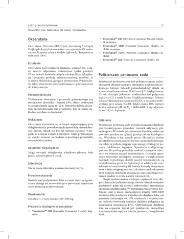 Leki przeciwżylakowe 12 Helwig/Otto: Leki. Wademekum dla lekarzy i farmaceutów Okserutyna Okserutyna. Oxerutins (BAN) jest mieszaniną 5 różnych O-(β-hydroksyetylo)rutozydów z co najmniej 45% trokserutyną. Rozpuszczalna w wodzie i glicerolu. Temperatura topnienia 156oC. Działanie Okserutyna pod względem działania, wskazań itp. w dużej mierze odpowiada trokserutynie (patrz poniżej). W warunkach doświadczalnych redukuje filtrację kapilarną i poprawia perfuzję mikronaczyniową, możliwe, że w skutek blokowania agregacji erytrocytów. Potwierdzono także właściwości przeciwutleniające i powinowactwo do ściany naczyń. Farmakokinetyka Wchłanianie okserutyny z przewodu pokarmowego jest stosunkowo niewielkie i wynosi 10%. Okres półtrwania w osoczu określa się na 10–25 h. Prawdopodobnie okserutyna metabolizowana jest w wątrobie. Nie są znane dokładniejsze dane na ten temat. ® ® ® ® Venoruton 500 (Novartis Consumer Heath), tabletki musujące Venoruton 1000 (Novartis Consumer Heath), tabletki musujące Venoruton Forte (Novartis Consumer Heath), tabletki Venoruton Gel (Novartis Consumer Heath), żel Polisiarczan pentozanu sodu Polisiarczan pentozanu sodu jest półsyntetycznym polisacharydem otrzymywanym z substratów pochodzenia roślinnego, którego łańcuch polisacharydowy składa się z połączonych wiązaniami (1→4) reszt β-D-ksylopiranozy. Co ok. dziesiąta jednostka strukturalna jest połączona w pozycji C2 z resztą kwasu D-glukuronowego. Polimer jest estryfikowany przy pomocy H2SO4, a następnie zobojętniany przy użyciu NaOH, dzięki czemu 10% roztwór wodny wykazuje pH ~6. Mr = 4000–6000. 1 mg odpowiada ok. 10 j.m. heparyny. Wskazania Działanie Okserutyna stosowana jest w terapii wspomagającej przy dolegliwościach powodowanych przewlekłą niewydolnością naczyń, takich jak ból lub uczucie ciężkości w nogach, w leczeniu świądu i obrzęków. Mało przekonujące są wyniki leczenia owrzodzeń w przebiegu przewlekłej niewydolności żylnej. Polisiarczan pentozanu sodu posiada nieznaczne działanie przeciwzakrzepowe, powoduje również aktywację plazminogenu. W trakcie przyjmowania leku fibrynoliza nie powinna przekraczać górnej granicy normy fizjologicznej. Wywołany w ten sposób proces fibrynolizy można zneutralizować przy pomocy kwasu ε-aminokapronowego, nie udaje się jednak osiągnąć tego samego efektu przy pomocy inhibitorów trypsyny. Stymulacja endogennego procesu fibrynolizy powoduje rozkład zakrzepów obecnych we wnętrzu naczyń krwionośnych. Czynniki sprzyjające tworzeniu zakrzepów, uwalniane w zwiększonych ilościach w przebiegu chorób naczyń krwionośnych, są neutralizowane przez lek. Substancja ta selektywnie i niezależnie od antytrombiny III hamuje kaskadę krzepnięcia krwi w fazie wstępnej procesu. Lek ułatwia mikrokrążenie krwi wskutek obniżania jej lepkości oraz zapobiega tworzeniu osadów w strefie naczyń włosowatych. Dzięki zróżnicowaniu wielkości cząsteczek oraz długości łańcucha polimerycznego dwóch różnych rodzajów preparatów udaje się uzyskać odpowiednie przesunięcie spektrum działania leku. W przypadku polisiarczanu pentozanu sodu o masie cząsteczkowej między 4000–6000 dominuje fibrynolityczne i lipolityczne działanie leku, zaś preparaty zawierające ok. 10% cząsteczek o większej masie molowej wywierają silniejsze działanie polegające na hamowaniu krzepnięcia krwi. Optymalizacja działania leku na organizm ludzki jest praktycznie niemożliwa z powodu braku wpływu leku na parametry krzepliwości krwi. Działania niepożądane Mogą wystąpić dolegliwości żołądkowo-jelitowe, bóle głowy, zawroty głowy i świąd. Interakcje Nie są znane interakcje o znaczeniu medycznym. Przeciwwskazania Badania nad podawaniem leku w czasie ciąży są ograniczone, dlatego też stosowanie go w pierwszym trymestrze ciąży uważa się za niewskazane. Dawkowanie Doustnie 1–2 razy dzienne 300–500 mg. Preparaty dostępne w sprzedaży Venoruton sułki ® 300 (Novartis Consumer Heath), kap-