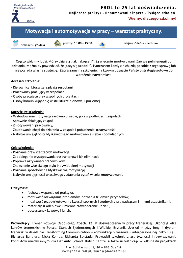 FRDL to 25 lat doświadczenia . Najlepsze praktyki. Renomowani eksperci. Tysiące szkoleń . Wiemy, dlaczego szkolimy! Motywacja i automotywacja w pracy – warsztat praktyczny. termin: 13 grudnia godziny: 10:00 – 15:00 miejsce: Gdańsk – centrum. Często widzimy ludzi, którzy działają „jak nakręceni”. Są wiecznie zmotywowani. Zawsze pełni energii do działania. Można by powiedzieć, że „tacy się urodzili”. Tymczasem każdy z nich, zdając sobie z tego sprawę lub nie posiada własną strategię. Zapraszamy na szkolenie, na którym poznacie Państwo strategie gotowe do wdrożenia natychmiast. Adresaci szkolenia: - Kierownicy, którzy zarządzają zespołami - Pracownicy pracujący w zespołach - Osoby pracujące przy wspólnych projektach - Osoby komunikujące się w strukturze pionowej i poziomej Korzyści ze szkolenia: - Wybudowanie motywacji zarówno u siebie, jak i w podległych zespołach - Sprawnie działający zespół - Zmotywowani pracownicy, - Zbudowanie chęci do działania w zespole i pobudzenie kreatywności - Nabycie umiejętności błyskawicznego motywowania siebie i podwładnych Cele szkolenia: - Poznanie praw rządzących motywacją - Zapobieganie występowania dystraktorów i ich eliminacja - Poprawa aktywności pracowników - Znalezienie właściwego stylu indywidualnej motywacji - Poznanie sposobów na błyskawiczną motywację - Nabycie umiejętności właściwego zadawania pytań w celu zmotywowania Otrzymasz: fachowe wsparcie od praktyka, możliwość rozwiązania problemów, poznania trudnych przypadków, możliwość przedyskutowania kwestii spornych i trudnych z prowadzącym i innymi uczestnikami, materiały szkoleniowe i imienne zaświadczenie udziału, poczęstunek kawowy i lunch. Prowadzący: Trener Rozwoju Osobistego, Coach. 12 lat doświadczenia w pracy trenerskiej. Ukończył kilka kursów trenerskich w Polsce, Stanach Zjednoczonych i Wielkiej Brytanii. Uzyskał między innymi dyplom trenerski w dziedzinie Transforming Communication – komunikacji biznesowej i interpersonalnej. Szkolił się u Richarda Bandlera, Nicka Kempa, Richarda Bolstada. Prowadził szkolenia z asertywności i rozwiązywania konfliktów między innymi dla Fiat Auto Poland, British Centre, a także uczestnicząc w kilkunastu projektach Pla c S ol id ar n o śc i 1, 8 0 – 86 3 Gd ań s k w w w. gd an sk .f rd l .p l , b iu ro @gd a n sk. frd l.p l szkoleń otwartych. Aktualnie kształci się u Johna Maxwella, szefa największej organizacji na świecie uczących kształcenia liderów i budowania zespołów uczestnicząc w programie JMT University. Całość wieńczy egzamin trenerski, jaki Andrzej złoży w marcu 2017 w Orlando na Florydzie. Szkolenia z metod win-win prowadzi jako szkolenia otwarte, a także pracując na zlecenie firm, bazując na zastanym konflikcie i wskazując drogę i metody możliwych rozwiązań. Przeprowadził kilka tysięcy godzin szkoleniowych w ciągu ostatnich 12 lat. Prowadził szkolenia dla Polkomtel, My Center, Volvo, Honda, Great Open House. W pracy indywidualnej pracował z osobami z pierwszych stron gazet. Bardzo dobry, komunikatywny wykładowca. Zapytaj o szkolenie Natalia Walas 58 77 24 213, [email protected] Program: 1. Czym jest motywacja. Czynniki motywujące i demotywujące. 2. Motywacja zewnętrzna i wewnętrzna. 3. Nastawienie na pozytywną energię. Sposoby na osiągnięcie właściwego poziomu energii. 4. Prawo reaktancji. 5. Rodzaje motywacji i motywacja indywidualna. 6. Sposoby udzielania feedbacku. 7. Motywacja błyskawiczna – jak z niej korzystać i jak ją stosować. Warsztat prowadzony przez Pana Andrzeja jest zawsze pełen praktycznych zajęć. Uczestnicy dostają wiedzę, która natychmiast sprawdzana jest w praktyce. Dlaczego warto? Motywacja, w szczególności pozafinansowa jest trudnym zadaniem. Trzeba znać techniki motywacji, wywierania właściwego wpływu i umieć je stosować w praktyce. Podczas tego warsztatu uczestnicy dowiedzą się jak motywować przede wszystkim siebie, a następnie swoich pracowników. Umiejętność ta jest niezbędna w prawidłowym działaniu zespołu. Dzięki wzajemnemu zachęcaniu siebie do działania wypełnianie zadań staje się możliwe, a to oznacza, że zespół rozwija się nieprzerwanie. Uczymy poprzez praktykę, pod bacznym okiem doświadczonego trenera. Po tym warsztacie, pełnego praktycznych ćwiczeń i omawiania teorii do niezbędnego minimum, uczestnicy zauważą natychmiastowy postęp i zmianę w kierowaniu zespołem. Swoje nowe umiejętności zastosują w codziennej pracy, jak i życiu prywatnym, co spowoduje, zgodnie z ideą work-life balance, większe zaangażowanie i zadowolenie z wykonywanej pracy. WYŚLIJ ZGŁOSZENIE DO: 07.12.2016r, 15:00 [email protected] 58 550 32 39 FORMULARZ ZGŁOSZENIOWY: Motywacja i automotywacja – 13 GRUDNIA 2016 r. Nazwa Instytucji/Firmy (dane do FV): Adres: NIP: Telefon: Faks: 1. Imię, nazwisko , stanowisko e-mail Imię, nazwisko , stanowisko e-mail 2. Cena netto: 280 zł TAK / NIE 238 zł TAK / NIE Zgłoszenie w terminie do 1 grudnia 2016r. Dla kolejnej osoby zgłoszonej z tej samej instytucji 10% rabatu Udział w szkoleniu jest finansowane przynajmniej w 70 % ze środków publicznych TAK / NIE TAK / NIE Należność należy zapłacić przelewem po szkoleniu po otrzymaniu faktury VAT Zgodnie z Ust. o Ochronie Danych Osobowych z dnia 29.08.1997 r. wyrażam zgodę na przetwarzanie moich danych osobowych dla potrzeb działalności szkoleniowej FRDL Brak pisemnej rezygnacji ze szkolenia na 5 dni przed terminem będzie równoznaczny z obciążeniem Państwa 50 % kosztów ogólnych. Data: Podpis: Uwaga! W braku kontaktu ze strony FRDL minimum 2 dni przed terminem szkolenia może oznaczać, że karta zgłoszeniowa nie dotarła. W takim przypadku prosimy o kontakt telefoniczny lub mailowy: 58 772 42 13, [email protected] Pla c S ol id ar n o śc i 1, 8 0 – 86 3 Gd ań s k w w w. gd an sk .f rd l .p l , b iu ro @gd a n sk. frd l.p l