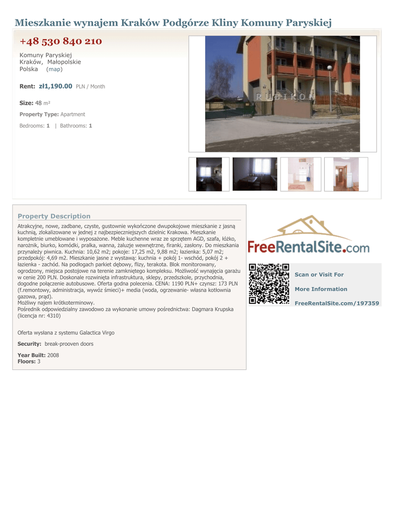 Mieszkanie wynajem Kraków Podgórze Kliny Komuny Paryskiej +48 530 840 210 Komuny Paryskiej Kraków, Małopolskie Polska (map) Rent: zł1,190.00 PLN / Month Size: 48 m² Property Type: Apartment Bedrooms: 1 | Bathrooms: 1 Property Description Atrakcyjne, nowe, zadbane, czyste, gustownie wykończone dwupokojowe mieszkanie z jasną kuchnią, zlokalizowane w jednej z najbezpieczniejszych dzielnic Krakowa. Mieszkanie kompletnie umeblowane i wyposażone. Meble kuchenne wraz ze sprzętem AGD, szafa, łóżko, narożnik, biurko, komódki, pralka, wanna, żaluzje wewnętrzne, firanki, zasłony. Do mieszkania przynależy piwnica. Kuchnia: 10,62 m2; pokoje: 17,25 m2, 9,88 m2; łazienka: 5,07 m2; przedpokój: 4,69 m2. Mieszkanie jasne z wystawą: kuchnia + pokój 1- wschód, pokój 2 + łazienka - zachód. Na podłogach parkiet dębowy, flizy, terakota. Blok monitorowany, ogrodzony, miejsca postojowe na terenie zamkniętego kompleksu. Możliwość wynajęcia garażu w cenie 200 PLN. Doskonale rozwinięta infrastruktura, sklepy, przedszkole, przychodnia, dogodne połączenie autobusowe. Oferta godna polecenia. CENA: 1190 PLN+ czynsz: 173 PLN (f.remontowy, administracja, wywóz śmieci)+ media (woda, ogrzewanie- własna kotłownia gazowa, prąd). Możliwy najem krótkoterminowy. Pośrednik odpowiedzialny zawodowo za wykonanie umowy pośrednictwa: Dagmara Krupska (licencja nr: 4310) Oferta wysłana z systemu Galactica Virgo Security: break-prooven doors Year Built: 2008 Floors: 3 Scan or Visit For More Information FreeRentalSite.com/197359