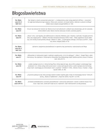NOWY TESTAMENT. PODRĘCZNIK DLA NAUCZYCIELA SEMINARIUM — LEKCJA 9. Błogosławieństwa Ew. Mateusza 5:3; 3 Nefi 12:3 Być ubogim w duchu oznacza być pokornym i „z wdzięcznością uznać swoją zależność od Pana — zrozumieć, że ciągle [potrzebujemy] Jego wsparcia. Pokora jest uznaniem, że [nasze] talenty i zdolności są darami od Boga” (Oddani wierze: Leksykon ewangelii [2004], str. 103). Ew. Mateusza 5:4 Smucić się oznacza też martwić się. Można smucić się trudnościami i próbami życia doczesnego, jak też z powodu śmierci bliskich osób. Można również odczuwać smutek z powodu grzechu. Ew. Mateusza 5:5 „Słowo ‘cichy’, czyli łagodny, jest zdefiniowane w słowniku Webstera, jako ‘cierpliwy i wytrwały: nieugięty pomimo bólu, bez rozgoryczenia’ ” [Webster’s Third New International Dictionary (1976) ‘meek’, 1403]. Łagodność nie jest słabością. Jest oznaką chrześcijańskiej odwagi” (Robert D. Hales, „Chrześcijańska odwaga: Cena bycia uczniem”, Ensign lub Liahona, listopad 2008, str.73). Ew. Mateusza 5:6; 3 Nefi 12:6 Łaknienie i pragnienie sprawiedliwości to ogromna chęć poznawania i wykonywania woli Boga. Ew. Mateusza 5:7 „Miłosierdzie to traktowanie kogoś z większym współczuciem, niż na to zasługuje” („Mercy”, Gospel Topics, adres internetowy: lds.org/topics). Otrzymujemy miłosierdzie Ojca Niebieskiego dzięki Zadośćuczynieniu Jezusa Chrystusa (zob. Alma 33:11). Ew. Mateusza 5:8 „Ludzie czystego serca to ci, którzy kochają Pana, którzy dążą do tego, aby za Nim podążać i przestrzegać Jego przykazań; to ci, którzy usiłują wieść prawe życie i z wiarą wytrwają do końca. Ludzie czystego serca kontrolują swoje myśli i wystrzegają się niemoralnych ułud i uczynków” (Sheldon F. Child, „Words of Jesus: Chastity”, Ensign, styczeń 2003, str. 44). Ew. Mateusza 5:9 „[Czynienie pokoju] to dar, który pomaga ludziom znaleźć wspólny język, kiedy inni dostrzegają różnice” (Henry B. Eyring, „Nauka w kapłaństwie”, Ensign lub Liahona, maj 2011, str. 63). Ew. Mateusza 5:10–12 „[Cierpieć] prześladowanie z powodu sprawiedliwości” oznacza być posłusznym i stawać w obronie Jezusa Chrystusa i Jego nauk, nawet jeśli wiąże się to z szykanami i złym traktowaniem za taką postawę. © 2015 INTELLECTUAL RESERVE, INC. WSZELKIE PRAWA ZASTRZEŻONE.
