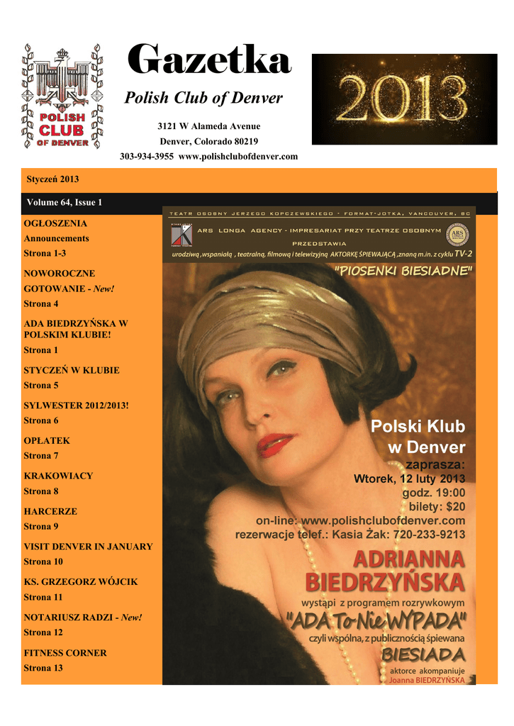 Gazetka Polish Club of Denver 3121 W Alameda Avenue Denver, Colorado 80219 303-934-3955 www.polishclubofdenver.com Styczeń 2013 Volume 64, Issue 1 OGŁOSZENIA Announcements Strona 1-3 NOWOROCZNE GOTOWANIE - New! Strona 4 ADA BIEDRZYŃSKA W POLSKIM KLUBIE! Strona 1 STYCZEŃ W KLUBIE Strona 5 SYLWESTER 2012/2013! Strona 6 OPŁATEK Strona 7 KRAKOWIACY Strona 8 HARCERZE Strona 9 VISIT DENVER IN JANUARY Strona 10 KS. GRZEGORZ WÓJCIK Strona 11 NOTARIUSZ RADZI - New! Strona 12 FITNESS CORNER Strona 13 ~ REZERWUJ ONLINE ~ Stenia Ashton ~ Jolanta Dobenin ~ Maria Bierat Wanda Bogacz ~ Grzegorz Cioch ~ Witold Citko Regina Citko ~ Josephine Daniel ~ Urszula Gurka Henry Habina ~ Ewelina Kite ~ Elzbieta Kubala Krystyna Kulenty ~ Magdalena Lantz ~ Jerzy Lewandowski ~ Christine Lewis ~ Krystyna Orłowska ~ Waldemar Pilarski ~ Marzena Pilarska ~ Małgorzata Ptasznik ~ John Pyziak Kazimierz Pyziak ~ Bozenna Rykowski Krzysztof Stoch ~ Mariola Stoch ~ Henryka Stokłuska ~ Agnes Thompson ~ Urszula Tylicki Alicja Wanasz ~ Adam Wazny ~ Artur Zagol If you prefer that your birthday is not disclosed, please contact Anna Spencer, Membership Director at 970-509-0011 or [email protected] BRIGHTON - ZIĘBICE SISTER CITIES 9TH ANNUAL DINNER & AUCTION Saturday February 16th at 6:30PM Brighton Recreation Center 555 N 11th Ave $12.50/Person Zachęcamy Państwa do korzystania z naszego internetowego systemu rezerwacji. Jest to możliwe już przywiększości imprez klubowych. Wystarczy wejść na stronę Klubu: www.polishclubofdenver.com i kliknąć na KUP BILETY przy imprezie, którą jesteście Państwo zainteresowani. Z Państwa karty kredytowej zostanie ściągniety $1 jako autoryzacja, a reszta sumy na 48 godzin przed rozpoczęciem imprezy. Jest to bezpieczny i szybki serwis. W przypadku usprawiedliwionej nieobecności, istnieje możliwość zwrotu pieniędzy na kartę kredytową, z której zrobiona została rezerwacja. Zachęcamy do zakupu biletów przez internet na nadchodzący występ pani Adrianny Biedrzyńskiej pod tytulem „Piosenki Biesiadne”, który odbędzie się 12 lutego b.r o godzinie 19:00 w Klubie Polskim w Denver. ~ Online booking and reservations are now available for most Club events. To make a reservation, please go to our DZIEŃ BABCI website at www.polishclubofdenver.com and click on I DZIADKA BUY TICKETS by the event of your choice. Your credit card will be charged $1 to authorize the transa 20 stycznia, godz. tion. The remaining amount will be charged within 48 15:00 zapraszamy hours from the event. It is safe, fast and convenient. We Państwa do Klubu na coroczna Akade- encourage you to make an online reservation for the February show of Polish actress Ada Biedrzynska. mię z okazji Dnia QUESTIONS: Anna Spencer 720-583-3806 Babci i Dziadka. W programie występy Rodzinie zmałego Eddiego Cierpial, Harcerzy oraz najszczersze wyrazy współczucia poczęstunek. składa Zarząd oraz członkowie ~ ~ NEW FLOOR! The floor upgrade/replacement project has been completed. The Club has a brand new hardwood dance floor. The remainder of the floor throughout the Club was also replaced. Wiecej na stronie 3 / More on page 3 2 Klubu Polskiego w Denver. Pani Renacie Jeleń, życzenia szybkiego powrotu do zdrowia składa Zarząd oraz członkowie Klubu Polskiego w Denver. GAZETKA Happy New Year 2013!!! Drodzy Członkowie i Przyjaciele Polskiego Klubu w Denver, Z okazji Nowego Roku chcielibyśmy Wam życzyć aby rok 2013 przyniósł Wam dużo zdrowia i radości oraz aby w Waszych domach nigdy nie zabrakło miłości i zrozumienia. Chcielibyśmy rownież bardzo serdecznie podziękować za Wasze wsparcie i pomoc w działalności Polskiego Klubu w 2012 roku. Zarząd Klubu Polskiego w Denver Z Trzeciej Półki... PANI MECENAS UCIEKA Sophie Kinsella Podsumowanie roku 2012 oraz plany Klubu na rok 2013 przedstawimy Państwu już w lutowym numerze Gazetki. 3 MAMY NOWĄ PODŁOGĘ! Z końcem grudnia zakończył się projekt wymiany podłogi w Klubie. Wymieniony został parkiet jak również reszta klubowej podłogi na sali oraz dookoła baru. Podłoga zdała już pierwszy egzamin w czasie tegorocznej zabawy sylwestrowej, na której bawiło się prawie 200 gości! Samantha ma 29 lat i jest bardzo utalentowaną prawniczką. Okazuje się, że zrobiła błąd który kosztował jej klienta 50 milionów funtów. Dziewczyna pod wpływem emocji ucieka z miasta i przez przypadek zostaje gosposią. Wtedy zaczyna odkrywac co tak naprawdę liczy się w życiu co jest naprawde ważne a co można odłożyć na później. Akcja książki jest wartka, nie ma w niej nudzących momentów. Warto po nią sięgnąć, zwłaszcza teraz w dlugie zimowe wieczory. Serdecznie polecam! Joanna Rocwa, Dyrektor Biblioteki NOWOROCZNE GOTOWANIE Z EGGCRECIBLE CAFE Z racji Nowego Roku, wiele osób próbuje wszelkiego rodzaju diet. Zamiast diet, proponuję Państwu zdrowe odżywianie. Oto przepis na doskonałą lekką, poświąteczną potrawę: Łosoś w Imbirze i Cytrynie Składniki: - 4 filety swieżego łososia - sok z cytryny - 1 lyżka świeżego imbiru - 2 lyżki oleju - 3 lyżki posiekanego koperku - 3 lyżki posiekanej natki pietruszki - pieprz cytrynowy Przygotowanie: Łososia oprószyć pieprzem cytrynowym. Na patelni rozgrzać olej i smażyc rybę na średnim ogniu przez ok 3 minuty. Imbir obrać i pokroim w cienkie plasterki. Lososia odwrocic, posypac imbirem z jednej strony, polac troche cytryną, smażyc przez chwile, posypać natka i koperkiem, dodac reszte cytryny i dusić pod przykryciem ok 2 minuty. Życzę smacznego! Maciej Wardak Eggcredible Cafe Czas to pieniądz więc go nie trać! Odpowiednie przygotowanie domu do sprzedaży może oznaczać ponad 50% szybszą sprzedaż oraz od 2 do 10 % wyższą cenę. Pomogę w znalezieniu wymarzonego domu, lub w szybkiej i łatwej sprzedaży. Jako Twój agent nieruchomości oraz licencjonowany dekorator wnętrz pomogę Ci zaprezentować twój dom w jak najlepszym świetle albo go udekorować po pom
