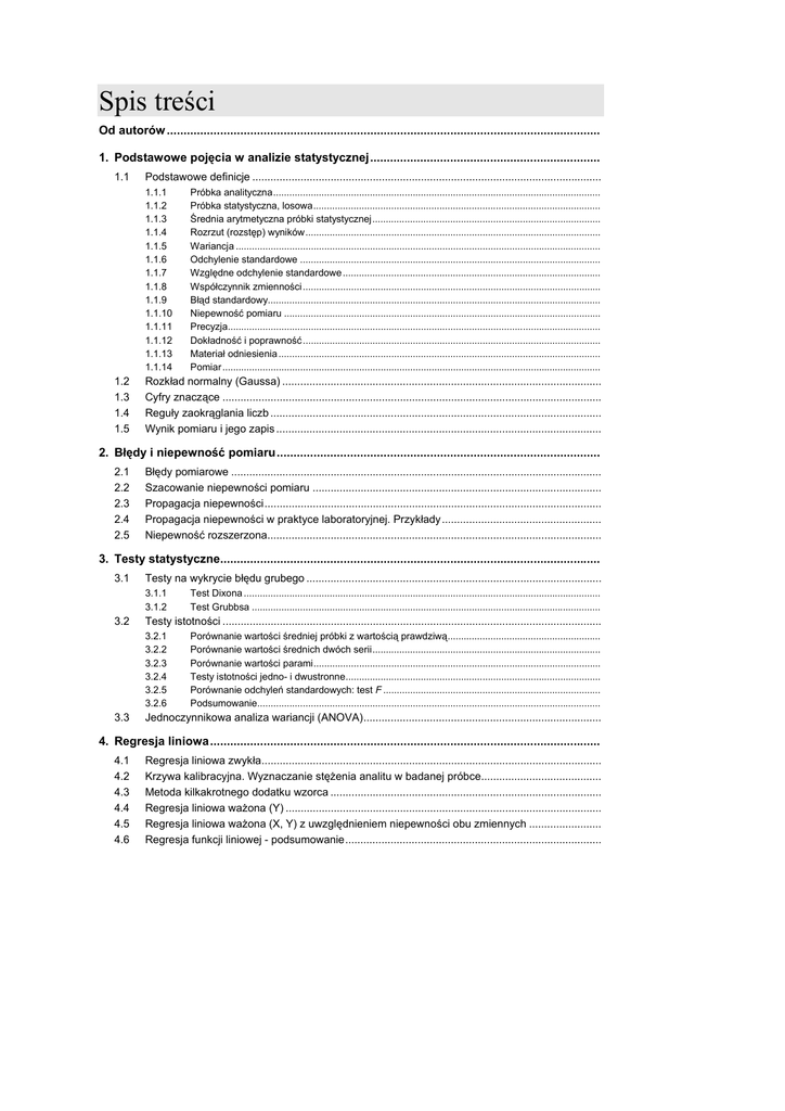 Spis treści Od autorów .................................................................................................................................. 1. Podstawowe pojęcia w analizie statystycznej..................................................................... 1.1 Podstawowe definicje .................................................................................................................... 1.1.1 1.1.2 1.1.3 1.1.4 1.1.5 1.1.6 1.1.7 1.1.8 1.1.9 1.1.10 1.1.11 1.1.12 1.1.13 1.1.14 1.2 1.3 1.4 1.5 Próbka analityczna.......................................................................................................................... Próbka statystyczna, losowa........................................................................................................... Średnia arytmetyczna próbki statystycznej..................................................................................... Rozrzut (rozstęp) wyników.............................................................................................................. Wariancja ........................................................................................................................................ Odchylenie standardowe ................................................................................................................ Względne odchylenie standardowe ................................................................................................ Współczynnik zmienności ............................................................................................................... Błąd standardowy............................................................................................................................ Niepewność pomiaru ...................................................................................................................... Precyzja........................................................................................................................................... Dokładność i poprawność ............................................................................................................... Materiał odniesienia ........................................................................................................................ Pomiar ............................................................................................................................................. Rozkład normalny (Gaussa) .......................................................................................................... Cyfry znaczące .............................................................................................................................. Reguły zaokrąglania liczb .............................................................................................................. Wynik pomiaru i jego zapis ............................................................................................................ 2. Błędy i niepewność pomiaru................................................................................................. 2.1 2.2 2.3 2.4 2.5 Błędy pomiarowe ........................................................................................................................... Szacowanie niepewności pomiaru ................................................................................................ Propagacja niepewności................................................................................................................ Propagacja niepewności w praktyce laboratoryjnej. Przykłady ..................................................... Niepewność rozszerzona............................................................................................................... 3. Testy statystyczne.................................................................................................................. 3.1 Testy na wykrycie błędu grubego .................................................................................................. 3.1.1 3.1.2 3.2 Testy istotności .............................................................................................................................. 3.2.1 3.2.2 3.2.3 3.2.4 3.2.5 3.2.6 3.3 Test Dixona ..................................................................................................................................... Test Grubbsa .................................................................................................................................. Porównanie wartości średniej próbki z wartością prawdziwą......................................................... Porównanie wartości średnich dwóch serii..................................................................................... Porównanie wartości parami........................................................................................................... Testy istotności jedno- i dwustronne............................................................................................... Porównanie odchyleń standardowych: test F ................................................................................. Podsumowanie................................................................................................................................ Jednoczynnikowa analiza wariancji (ANOVA)............................................................................... 4. Regresja liniowa..................................................................................................................... 4.1 4.2 4.3 4.4 4.5 4.6 Regresja liniowa zwykła................................................................................................................. Krzywa kalibracyjna. Wyznaczanie stężenia analitu w badanej próbce........................................ Metoda kilkakrotnego dodatku wzorca .......................................