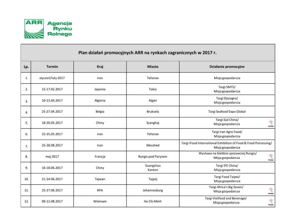 Plan działań promocyjnych ARR na rynkach zagranicznych w 2017 r. Lp. Termin Kraj Miasto Działanie promocyjne 1. styczeń/luty 2017 Iran Teheran Misja gospodarcza 2. 15-17.02.2017 Japonia Tokio Targi SMTS/ Misja gospodarcza 3. 10-13.04.2017 Algieria Algier Targi Djazagro/ Misja gospodarcza 4. 25-27.04.2017 Belgia Bruksela Targi Seafood Expo Global 5. 18-20.05.2017 Chiny Szanghaj Targi Sial China/ Misja gospodarcza 6. 22-25.05.2017 Iran Teheran Targi Iran Agro Food/ Misja gospodarcza 7. 25-28.08.2017 Iran Meszhed Targi iFood International Exhibition of Food & Food Porcessing/ Misja gospodarcza 8. maj 2017 Francja Rungis pod Paryżem Wystawa na Giełdzie spożywczej Rungis/ Misja gospodarcza 9. 16-18.06.2017 Chiny Guangzhou Kanton Targi IFE China/ Misja gospodarcza 10. 21-24.06.2017 Tajwan Tajpej Targi Food Taipei/ Misja gospodarcza 11. 25-27.06.2017 RPA Johannesburg Targi Africa's Big Seven/ Misja gospodarcza 12. 09-12.08.2017 Wietnam Ho Chi Minh Targi Vietfood and Beverage/ Misja gospodarcza Targi HKTDC Food Expo/ Misja gospodarcza 13. 17-19.08.2017 Hongkong Hongkong 14. 31.08.-01.09.2017 Chiny Pekin Targi Anufood China/ Misja gospodarcza 15. 07.09.2017 Kazachstan Astana Wystawa ASTANA EXPO 16. 14-16.09.2017 USA Baltimore Targi Biofach America/ Misja gospodarcza 17. 14-16.09.2017 Indie Mumbaj 18. 18-19.09.2017 ZEA Dubaj Targi The Food Speciality Festival/ Misja gospodarcza 19. 02-05.10.2017 Królestwo Arabii Saudyjskiej Riyadh Targi Saudi Agriculture/ Misja gospodarcza 20. 07-11.10.2017 Niemcy Kolonia 21. listopad 2017 Białoruś Mińsk Targi Annapoorna World of Food India/ Misja gospodarcza Targi ANUGA Targi Prodexpo/ Misja gospodarcza - Działania oznaczone logo Marki Polskiej Gospodarki są realizowane w ramach branżowego programu promocji polskich specjalności żywnościowych (POIR) Aktualne oferty udziału: http://www.arr.gov.pl/oferty-dzialan-promocyjnych-arr
