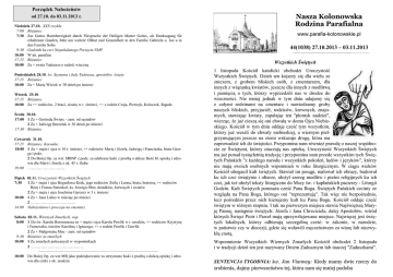 Porządek Nabożeństw od 27.10. do 03.11.2013 r. Niedziela 27.10. XXX zwykła 7:00 Różaniec 7:30 Zur Gottes Barmherzigkeit durch Fürsprache der Heiligen Mutter Gottes, als Danksagung für erhaltenen Gnaden, bitte um weitere Obhut und Gesundheit in den Familie Gabriela u. Jan u in den Familie Sohn 9:30 Godzinki ku czci Niepokalanego Poczęcia NMP 10:00 W int. parafian 17:15 Różaniec 18:00 Za + swata Tadeusza o radość wieczną Poniedziałek 28.10. św. Szymona i Judy Tadeusza, apostołów, święto 17:15 Różaniec 18:00 Za + Marię Wiciok w 30 dzień po śmierci Wtorek 29.10. 17:15 Różaniec 18:00 Za ++ rodziców, 2 braci, siostrę w r. śmierci, ++ z rodzin Czaja, Pietrzyk, Koloczek, Rąpała Środa 30.10. 17:00 1 Za + Gertrudę Świerc - zam. od sąsiadów 2 Za + Jadwigę Bereziuk w 30 dzień po śmierci 17:30 Różaniec Czwartek 31.10. 17:15 Różaniec, Koronka 18:00 1 Za + męża i ojca w 10 r. śmierci, ++ rodziców Marię i Józefa, Jadwigę i Franciszka, brata Georga i pokr. 2 Do Bożej Op. za wst. MBNP z podz. za odebrane łaski z prośbą o dalsze Boże bł. opiekę i zdrowie dla Marii i Józefa z ok. 45 r. ślubu 19:00 ……………………….. Piątek 01.11. Uroczystość Wszystkich Świętych 7:30 1 Za + męża i ojca Bogusława Kruk, jego rodziców Zofię i Leona, brata, bratową, ++ rodziców Różę i Franza Smieskol, ks. Jerzego Obst, dziadków, krewnych i swatów 2 Za + męża i ojca Joachima Garcorz w 3 r. śmierci 10:00 1 Za + Jana Labus w miesiąc po śmierci 2 …………………………….. 14:00 Nabożeństwo i procesja na cmentarz Sobota 02.11. Wiernych Zmarłych, wsp. 8:00 1 Do św. Karola Boromeusza za + męża i ojca Karola Pawlik w r. urodzin, ++ rodziców Krystynę i Franciszka, teściów Karolinę i Ignacego, ++ z rodzin Pawlik i Gawlik 2 Za + Małgorzatę Muc - zam. od sąsiadów 9:30 Różaniec za zmarłych 10:00 1 Za zmarłych polecanych w wypominkach 2 ………………………………….. —–————–——————–—————–—————————–––—— 18:00 Do Bożej Op. za wst MB jako podziękowanie za otrzymane łaski z prośbą o dalszą opiekę i zdrowie dla córki z ok. urodzin Nasza Kolonowska Rodzina Parafialna www.parafia-kolonowskie.pl 44(1038) 27.10.2013 – 03.11.2013 Wszystkich Świętych 1 listopada Kościół katolicki obchodzi Uroczystość Wszystkich Świętych. Dzień ten kojarzy się dla wielu ze zniczem, z grobem bliskich osób, z cmentarzem, dla innych z wiązanką kwiatów, jeszcze dla innych z modlitwą i pamięcią o tych, którzy wyprzedzili nas w drodze do wieczności. Nie mniej jednak w tym dniu udajemy się z całymi rodzinami na cmentarz i nawiedzamy groby naszych bliskich, przyjaciół, rodziców, krewnych, znajomych, stawiając kwiaty, zapalając ten "płomyk nadziei", wierząc, że już cieszą się oni chwałą w domu Ojca Niebieskiego. Kościół w tym dniu oddaje cześć tym wszystkim, którzy już weszli do chwały niebieskiej, a wiernym pielgrzymującym jeszcze na ziemi wskazuje drogę, która ma zaprowadzić ich do świętości. Przypomina nam również prawdę o naszej wspólnocie ze Świętymi, którzy otaczają nas opieką. Uroczystość Wszystkich Świętych ma już ponad tysiącletnią tradycję i przypomina nam przede wszystkim tych Świętych Pańskich "z każdego narodu i wszystkich pokoleń, ludów i języków", którzy nie mają swoich osobnych wspomnień w roku liturgicznym. W ciągu wieków Kościół ubogacił kult świętych. Stawiał im posągi, malował ich obrazy, budował ku ich czci świątynie i ołtarze, ułożył szereg modlitw i pieśni religijnych ku ich czci, jak też ułożył teksty liturgiczne do Mszy św. i kapłańskich pacierzy - Liturgii Godzin. Kult Świętych pomnaża cześć Pana Boga. Świętych Pańskich czcimy ze względu na Pana Boga, którego oni "reprezentują". Tak więc nie bezpośrednio, lecz pośrednio przez nich kierujemy kult ku Panu Bogu. Kościół oddaje cześć świętym w różnym stopniu. I tak na pierwszym miejscu stawia Najświętszą Maryję Pannę, następnie świętych: Józefa i Jana Chrzciciela, dalej Apostołów, wśród których Święci Piotr i Paweł mają uprzywilejowane miejsce. Najwięcej jest świętych lokalnych, którzy odbierają szczególną cześć: w zakonie, w narodzie, w państwie czy w diecezji, gdzie się wsławili męczeństwem za wiarę lub niezwykłą cnotą. Wspomnienie Wszystkich Wiernych Zmarłych Kościół obchodzi 2 listopada i w tradycji dzień ten jest nazywany Dniem Zadusznym lub inaczej "Zaduszkami". SENTENCJA TYGODNIA: św. Jan Vianney: Kiedy mamy dwie rzeczy do zrobienia, dajmy pierwszeństwo tej, która nam się mniej podoba 44/2013 PAPIESKA INTENCJA OGÓLNA Aby kapłani, którzy przeżywają trudności, doznali pociechy, wsparcia i utwierdzenia wierze. PAPIESKA INTENCJA MISYJNA Aby Kościoły w Ameryce Łacińskiej wysyłały misjonarzy do innych Kościołów, jako owoc misji kontynentalnej. ——————————–——————–——————————————–——— W listopadzie następujące Róże Różańcowe przewodniczą modlitwie różańcowej: 01.11. Róża 2 p. Anna Bock 03.11. Róża 3 p. Inga Muc 10.11. Róża 4 p. Hildegarda Czupała 17.11. Róża 5 p. Elfryda Fleger 24.11 Róża 6 p. Maria Baron ——————————–——————–——————————————–——— Nasz parafialny cmentarz Cmentarz jest miejscem świętym. Przez poświęcenie oraz przez szacunek dla Tych którzy tam spoczywają. Cmentarz jest miejscem szczególnym w każdej miejscowości. Świadczy o żyjących, w danym pokoleniu. Każdy jest odpowiedzialny za porządek i czystość. Na cmentarzu zachowajmy powagę. O czystość i porządek między grobami i przy grobach dbają opiekujący się danym grobem. Śmieci wyrzucajmy tylko do pojemników. Przy postawieniu nowego pomnika, opiekujący się grobem, są odpowie
