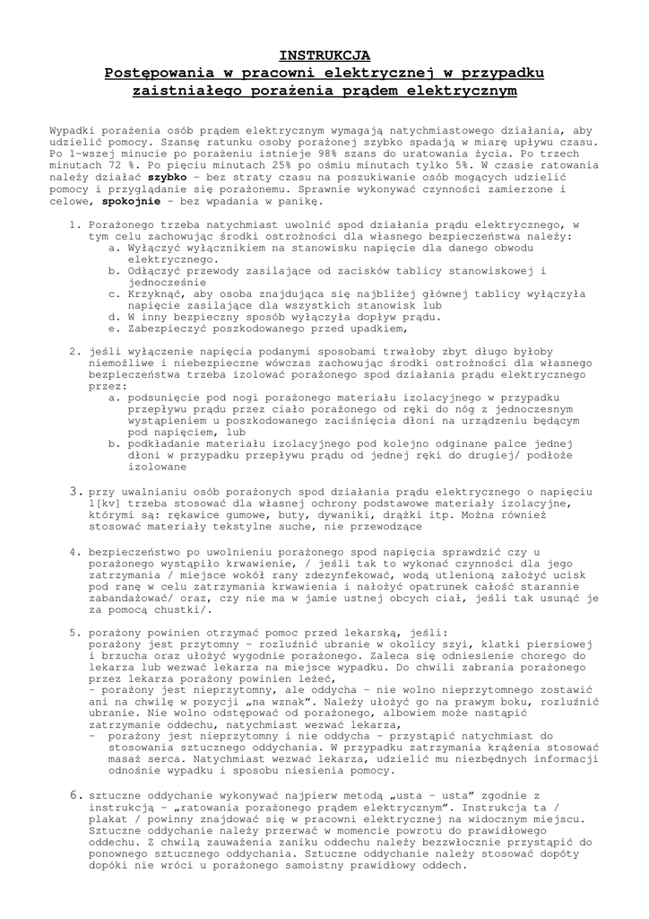 INSTRUKCJA Postępowania w pracowni elektrycznej w przypadku zaistniałego porażenia prądem elektrycznym Wypadki porażenia osób prądem elektrycznym wymagają natychmiastowego działania, aby udzielić pomocy. Szansę ratunku osoby porażonej szybko spadają w miarę upływu czasu. Po 1wszej minucie po porażeniu istnieje 98% szans do uratowania życia. Po trzech minutach 72 %. Po pięciu minutach 25% po ośmiu minutach tylko 5%. W czasie ratowania należy działać szybko – bez straty czasu na poszukiwanie osób mogących udzielić pomocy i przyglądanie się porażonemu. Sprawnie wykonywać czynności zamierzone i celowe, spokojnie – bez wpadania w panikę. 1. Porażonego trzeba natychmiast uwolnić spod działania prądu elektrycznego, w tym celu zachowując środki ostrożności dla własnego bezpieczeństwa należy: a. Wyłączyć wyłącznikiem na stanowisku napięcie dla danego obwodu elektrycznego. b. Odłączyć przewody zasilające od zacisków tablicy stanowiskowej i jednocześnie c. Krzyknąć, aby osoba znajdująca się najbliżej głównej tablicy wyłączyła napięcie zasilające dla wszystkich stanowisk lub d. W inny bezpieczny sposób wyłączyła dopływ prądu. e. Zabezpieczyć poszkodowanego przed upadkiem, 2. jeśli wyłączenie napięcia podanymi sposobami trwałoby zbyt długo byłoby niemożliwe i niebezpieczne wówczas zachowując środki ostrożności dla własnego bezpieczeństwa trzeba izolować porażonego spod działania prądu elektrycznego przez: a. podsunięcie pod nogi porażonego materiału izolacyjnego w przypadku przepływu prądu przez ciało porażonego od ręki do nóg z jednoczesnym wystąpieniem u poszkodowanego zaciśnięcia dłoni na urządzeniu będącym pod napięciem, lub b. podkładanie materiału izolacyjnego pod kolejno odginane palce jednej dłoni w przypadku przepływu prądu od jednej ręki do drugiej/ podłoże izolowane 3. przy uwalnianiu osób porażonych spod działania prądu elektrycznego o napięciu 1[kv] trzeba stosować dla własnej ochrony podstawowe materiały izolacyjne, którymi są: rękawice gumowe, buty, dywaniki, drążki itp. Można również stosować materiały tekstylne suche, nie przewodzące 4. bezpieczeństwo po uwolnieniu porażonego spod napięcia sprawdzić czy u porażonego wystąpiło krwawienie, / jeśli tak to wykonać czynności dla jego zatrzymania / miejsce wokół rany zdezynfekować, wodą utlenioną założyć ucisk pod ranę w celu zatrzymania krwawienia i nałożyć opatrunek całość starannie zabandażować/ oraz, czy nie ma w jamie ustnej obcych ciał, jeśli tak usunąć je za pomocą chustki/. 5. porażony powinien otrzymać pomoc przed lekarską, jeśli: porażony jest przytomny – rozluźnić ubranie w okolicy szyi, klatki piersiowej i brzucha oraz ułożyć wygodnie porażonego. Zaleca się odniesienie chorego do lekarza lub wezwać lekarza na miejsce wypadku. Do chwili zabrania porażonego przez lekarza porażony powinien leżeć, porażony jest nieprzytomny, ale oddycha – nie wolno nieprzytomnego zostawić ani na chwilę w pozycji „na wznak”. Należy ułożyć go na prawym boku, rozluźnić ubranie. Nie wolno odstępować od porażonego, albowiem może nastąpić zatrzymanie oddechu, natychmiast wezwać lekarza, porażony jest nieprzytomny i nie oddycha – przystąpić natychmiast do stosowania sztucznego oddychania. W przypadku zatrzymania krążenia stosować masaż serca. Natychmiast wezwać lekarza, udzielić mu niezbędnych informacji odnośnie wypadku i sposobu niesienia pomocy. 6. sztuczne oddychanie wykonywać najpierw metodą „usta – usta” zgodnie z instrukcją – „ratowania porażonego prądem elektrycznym”. Instrukcja ta / plakat / powinny znajdować się w pracowni elektrycznej na widocznym miejscu. Sztuczne oddychanie należy przerwać w momencie powrotu do prawidłowego oddechu. Z chwilą zauważenia zaniku oddechu należy bezzwłocznie przystąpić do ponownego sztucznego oddychania. Sztuczne oddychanie należy stosować dopóty dopóki nie wróci u porażonego samoistny prawidłowy oddech. Tylko lekarz może polecić przerwanie sztucznego oddychania. Po odzyskaniu przytomności należy podawać łyżeczkami mocną kawę lub herbatę.