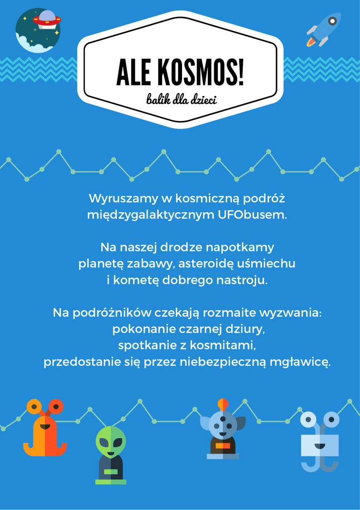 LE KOSMOS! A balik dla dzieci Wyruszamy w kosmiczną podróż międzygalaktycznym UFObusem. Na naszej drodze napotkamy planetę zabawy, asteroidę uśmiechu i kometę dobrego nastroju. Na podróżników czekają rozmaite wyzwania: pokonanie czarnej dziury, spotkanie z kosmitami, przedostanie się przez niebezpieczną mgławicę. NA POKŁADZIE UFOBUSA 2 ANIMATORÓW OŚWIETLENIE NAGŁOŚNIENIE DYM 90 min KOSMICZNEJ ZABAWY Dedykujemy przedszkolom i SP - klasy 0-3 KONTAKT Agencja Artystyczna WILK ART ul. Policka 60A/2 71-837 Szczecin www.wilkart.pl [email protected] tel.: 691 473 150 883 876 346