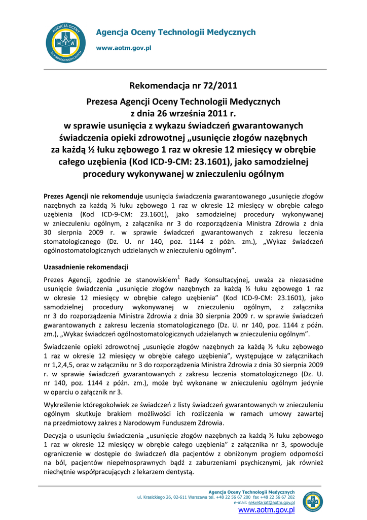 Rekomendacja nr 72/2011 Prezesa Agencji Oceny Technologii