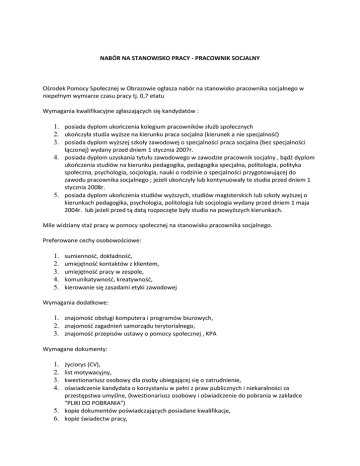 NABÓR NA STANOWISKO PRACY - PRACOWNIK SOCJALNY Ośrodek Pomocy Społecznej w Obrazowie ogłasza nabór na stanowisko pracownika socjalnego w niepełnym wymiarze czasu pracy tj. 0,7 etatu Wymagania kwalifikacyjne zgłaszających się kandydatów : 1. posiada dyplom ukooczenia kolegium pracowników służb społecznych 2. ukooczyła studia wyższe na kierunku praca socjalna (kierunek a nie specjalnośd) 3. posiada dyplom wyższej szkoły zawodowej o specjalności praca socjalna (bez specjalności łączonej) wydany przed dniem 1 stycznia 2007r. 4. posiada dyplom uzyskania tytułu zawodowego w zawodzie pracownik socjalny , bądź dyplom ukooczenia studiów na kierunku pedagogika, pedagogika specjalna, politologia, polityka społeczna, psychologia, socjologia, nauki o rodzinie o specjalności przygotowującej do zawodu pracownika socjalnego ; jeżeli ukooczyły lub kontynuowały te studia przed dniem 1 stycznia 2008r. 5. posiada dyplom ukooczenia studiów wyższych, studiów magisterskich lub szkoły wyższej o kierunkach pedagogika, psychologia, politologia lub socjologia wydany przed dniem 1 maja 2004r. lub jeżeli przed tą datą rozpoczęte były studia na powyższych kierunkach. Mile widziany staż pracy w pomocy społecznej na stanowisku pracownika socjalnego. Preferowane cechy osobowościowe: 1. 2. 3. 4. 5. sumiennośd, dokładnośd, umiejętnośd kontaktów z klientem, umiejętnośd pracy w zespole, komunikatywnośd, kreatywnośd, kierowanie się zasadami etyki zawodowej Wymagania dodatkowe: 1. znajomośd obsługi komputera i programów biurowych, 2. znajomośd zagadnieo samorządu terytorialnego, 3. znajomośd przepisów ustawy o pomocy społecznej , KPA Wymagane dokumenty: 1. 2. 3. 4. życiorys (CV), list motywacyjny, kwestionariusz osobowy dla osoby ubiegającej się o zatrudnienie, oświadczenie kandydata o korzystaniu w pełni z praw publicznych i niekaralności za przestępstwa umyślne, (kwestionariusz osobowy i oświadczenie do pobrania w zakładce "PLIKI DO POBRANIA") 5. kopie dokumentów poświadczających posiadane kwalifikacje, 6. kopie świadectw pracy, 7. inne dodatkowe dokumenty o posiadanych kwalifikacjach i umiejętnościach, ewentualne opinie, referencje Osoby spełniające powyższe wymagania zainteresowane podjęciem pracy na stanowisku pracownika socjalnego proszeni są o składanie dokumentów aplikacyjnych w Ośrodku Pomocy Społecznej w Obrazowie w terminie do dnia 5 sierpnia 2011r. Wymagane dokumenty powinny byd opatrzone klauzulą: "Wyrażam zgodę na przetwarzanie moich danych osobowych zawartych w ofercie pracy dla potrzeb niezbędnych do realizacji procesu rekrutacji zgodnie z Ustawą z dnia 29.08.1997r. o ochronie danych osobowych( Dz.U. z 202r. r 101, poz. 926) oraz ustawą z dnia 21.11.2008r. o pracownikach samorządowych (Dz.U. z 2008r. Nr 223, poz. 1458 z późniejszymi zmianami)" Aplikacje kandydatów nie spełniających wymagao kwalifikacyjnych pozostaną bez rozpatrzenia. Bliższych informacji można uzyskad pod nr tel. 15 8365199