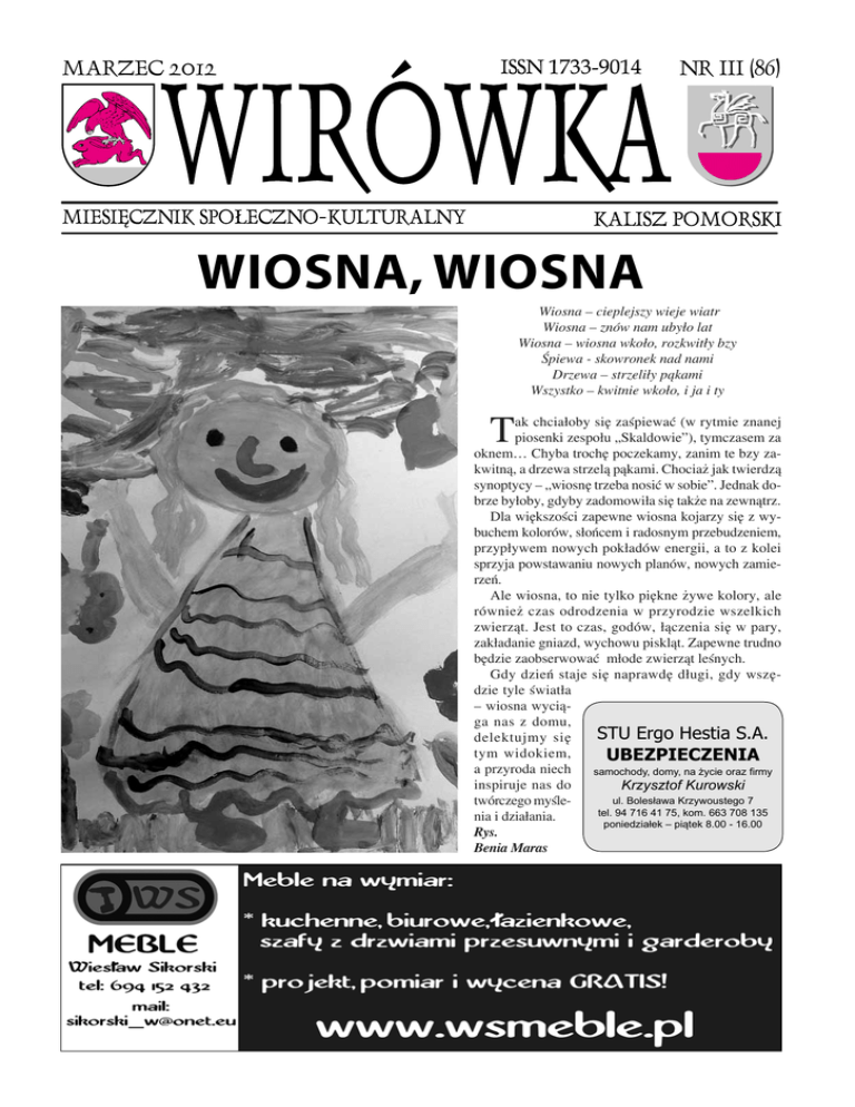MARZEC 2012 NR III (86) WIOSNA, WIOSNA Wiosna – cieplejszy wieje wiatr Wiosna – znów nam ubyło lat Wiosna – wiosna wkoło, rozkwitły bzy Śpiewa - skowronek nad nami Drzewa – strzeliły pąkami Wszystko – kwitnie wkoło, i ja i ty T ak chciałoby się zaśpiewać (w rytmie znanej piosenki zespołu „Skaldowie”), tymczasem za oknem… Chyba trochę poczekamy, zanim te bzy zakwitną, a drzewa strzelą pąkami. Chociaż jak twierdzą synoptycy – „wiosnę trzeba nosić w sobie”. Jednak dobrze byłoby, gdyby zadomowiła się także na zewnątrz. Dla większości zapewne wiosna kojarzy się z wybuchem kolorów, słońcem i radosnym przebudzeniem, przypływem nowych pokładów energii, a to z kolei sprzyja powstawaniu nowych planów, nowych zamierzeń. Ale wiosna, to nie tylko piękne żywe kolory, ale również czas odrodzenia w przyrodzie wszelkich zwierząt. Jest to czas, godów, łączenia się w pary, zakładanie gniazd, wychowu piskląt. Zapewne trudno będzie zaobserwować młode zwierząt leśnych. Gdy dzień staje się naprawdę długi, gdy wszędzie tyle światła – wiosna wyciąga nas z domu, STU Ergo Hestia S.A. delektujmy się tym widokiem, UBEZPIECZENIA a przyroda niech samochody, domy, na życie oraz firmy inspiruje nas do Krzysztof Kurowski ul. Bolesława Krzywoustego 7 twórczego myśletel. 94 716 41 75, kom. 663 708 135 nia i działania. poniedziałek – piątek 8.00 - 16.00 Rys. Benia Maras KULTURA I OŚWIATA STR. 2 NIE BYŁAM BOHATERKĄ, Henryka Krzywonos w Bibliotece Publicznej w Kaliszu Pomorskim N awet wysokie mrozy nie przeszkodziły temu, by dnia 3 lutego 2012 r. w Bibliotece Publicznej w Kaliszu Pomorskim odbyło się spotkanie z Henryką Krzywonos – Strycharską, bohaterką publikacji Agnieszki Wiśniewskiej pt. „Duża Solidarność, mała solidarność”. Spotkanie rozpoczęto pokazem filmu pt. „Nie byliśmy bohaterami: strajk oczami kobiet”, powstałym pod kierownictwem Andrzeja Wajdy, z muzyką Michała Lorenca. Dokument powstał na bazie wspomnień kobiet: Henryki Krzywonos – Strycharskiej, Ireny Oleszek, Bożeny Ptak oraz Bożeny Rybickiej–Grzywaczewskiej i prezentował kobiece spojrzenie na strajk z różnych stron bramy Stoczni Gdańskiej. W filmie wykorzystano, poza współcześnie zarejestrowanymi wspomnieniami, materiały archiwalne, które podkreślają powagę tamtych czasów, siłę strajkujących i solidarność uczestników. Podczas spotkania Pani Henryka opowiadała o przyczynach strajku nie ukrywając emocji. Wspominała o tym dlaczego zatrzymała tramwaj, w jaki sposób dołączyła do Międzyzakładowego Komitetu Strajkowego wraz z którym sprecyzowała 21 postulatów, które miały poprawić warunki pracy, płacy i codziennej egzystencji. Nie obyłoby się bez dyskusji nt. współczesnych problemów ludzi i preferencji politycznych. Uwieńczeniem wszystkich rozmów było omówienie działalności Rodzinnego Domu Dziecka, który wraz z małżonkiem prowadziła bohaterka naszego spotkania. Pragniemy nadmienić, że Pani Henryka Krzywonos-Strycharska jest także doradcą Rzecznika Praw Dziecka, oraz prowadzi patronat medialny nad akcją „Cyrkuluj książeczko”, polegającej nad rozmieszczaniem w aptekach w Żukowie książeczek dziecięcych, by w ten sposób poprawić stan czytelnictwa na Pomorzu i zachęcić dzieci do książek. Akcja ta jest tożsama z bibliotecznym programem pn.”Uwolnij książkę”, który od wielu lat wspieramy. Po części oficjalnej spotkania uczestnicy spotkali się w kuluarach, gdzie przy kawie prowadzili dalsze dyskusje. WALCZYŁA O LEPSZĄ POLSKĘ Znana i przez wielu Polaków szanowana, walczyła o lepszą Polskę dla siebie i przyszłych pokoleń. Wielu mówi o niej, że jest bohaterką, ona sama jednak temu zaprzecza. Pani Henryka Krzywonos-Strycharska w wywiadzie dla „Kontrastu”. Henryka Krzywonos Strycharska od 1973 do 1978 pracowała jako motornicza w Wojewódzkim Przedsiębiorstwie Komunikacyjnym Oddział Komunikacji Miejskiej Tramwajowej w Gdańsku. Później była zatrudniona w Stoczni Gdańskiej, na stanowisku operatora urządzeń dźwigowych, jednak już w 1979 powróciła do poprzedniego miejsca pracy. 15 sierpnia 1980 w pobliżu Opery Bałtyckiej zatrzymała prowadzony przez siebie tramwaj. Zdarzenie to bywa określane jako początek strajku gdańskiej komunikacji publicznej w okresie wydarzeń sierpniowych. W stanie wojennym zajmowała się pomocą internowanym, była też kolporterką wydawnictw podziemnych. Była represjonowana, objęta nakazem opuszczenia Gdańska i pozbawiona możliwości zatrudnienia. Korzystała wówczas ze wsparcia różnych osób, w tym księdza Henryka Jankowskiego. Podczas jednej z rewizji została dotkliwie pobita, na skutek czego straciła ciążę. Od 1994 do czasu przejścia na emeryturę (w 2009 r.) prowadziła rodzinny dom dziecka w Gdańsku, wychowując wraz z mężem łącznie dwanaścioro dzieci. Mieszkają wraz z mężem w Glinczu, w województwie pomorskim. Pani Henryka została zaproszona do Kalisza Pomorskiego przez dyrekcję Miejsko- Gminnego Ośrodka Kultury. Organizatorem i gospodarzem spotkania była Miejska Biblioteka Publiczna . Jaka była pani jako uczennica w szkole średniej? W szkole średniej byłam dorosłą osobą. Zrobiłam maturę tylko i wyłącznie dla moich dzieci, żeby miały przykład, że matka nie tylko jeździ tramwajem. Czy pani strajk był zaplanowany czy to było spontaniczne? Nie, nie ma zaplanowanych strajków, bo strajków się nie planuje. Jest to pełen spontan i koniec. Jaką rolę odegrał w pani życiu ksiądz Henryk Jankowski? Ksiądz Henryk Jankowski był nie tylko pasterzem, ale również człowiekiem, który pomagał wielu ludziom. Dzisiaj się o tym mówi, kiedyś się o tym nie mówiło, on pomagał młodym . Udostępniał im swoją szkołę, którą założył. Pomagał również mnie. A jak wyglądała pani działalność w „Solidarności”? Moja praca w „Solidarności” zako