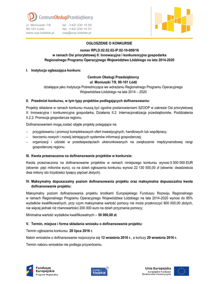ul. Moniuszki 7/9 90-101 Łódź www.cop.lodzkie.pl tel. /+42/ 230 15 50 fax /+42/ 230 15 51 [email protected] OGŁOSZENIE O KONKURSIE numer RPLD.02.02.02-IP.02-10-008/16 w ramach Osi priorytetowej II: Innowacyjna i konkurencyjna gospodarka Regionalnego Programu Operacyjnego Województwa Łódzkiego na lata 2014-2020 I. Instytucja ogłaszająca konkurs: Centrum Obsługi Przedsiębiorcy ul. Moniuszki 7/9, 90-101 Łódź działające jako Instytucja Pośrednicząca we wdrażaniu Regionalnego Programu Operacyjnego Województwa Łódzkiego na lata 2014 – 2020 II. Przedmiot konkursu, w tym typy projektów podlegających dofinansowaniu: Projekty składane w ramach konkursu muszą być zgodne postanowieniami SZOOP w zakresie Osi priorytetowej II: Innowacyjna i konkurencyjna gospodarka, Działania II.2: Internacjonalizacja przedsiębiorstw, Poddziałania II.2.2: Promocja gospodarcza regionu. Dofinansowaniem mogą zostać objęte projekty polegające na: przygotowaniu i promocji kompleksowych ofert inwestycyjnych, handlowych lub współpracy; tworzeniu nowych i rozwój istniejących systemów informacji gospodarczej; organizacji i udziale w przedsięwzięciach ukierunkowanych na zwiększenie międzynarodowej rangi gospodarczej regionu. III. Kwota przeznaczona na dofinansowanie projektów w konkursie: Kwota przeznaczona na dofinansowanie projektów w ramach niniejszego konkursu wynosi 5 000 000 EUR (słownie: pięć milionów euro), co na dzień ogłoszenia konkursu wynosi 22 130 500,00 zł (słownie: dwadzieścia dwa miliony sto trzydzieści tysięcy pięćset złotych). IV. Maksymalny dopuszczalny poziom dofinansowania projektu oraz maksymalna dopuszczalna kwota dofinansowanie projektu: Maksymalny poziom dofinansowania projektu środkami Europejskiego Funduszu Rozwoju Regionalnego w ramach Regionalnego Programu Operacyjnego Województwa Łódzkiego na lata 2014-2020 wynosi do 85% wydatków kwalifikowalnych, przy czym maksymalna wartość pomocy nie może przekroczyć 800 000,00 złotych, nie więcej jednak niż równowartości 200 000 euro na dzień przyznania pomocy; Minimalna wartość wydatków kwalifikowalnych – 50 000,00 zł. V. Termin, miejsce i forma składania wniosku o dofinansowanie projektu: Termin ogłoszenia konkursu: 28 lipca 2016 r. Nabór wniosków o dofinansowanie rozpoczyna się 12 września 2016 r., a kończy 29 września 2016 r. Termin naboru wniosków nie podlega przywróceniu. Wnioski o dofinansowanie należy składać osobiście w dni robocze w godzinach pracy Centrum Obsługi przedsiębiorcy lub przesłać na adres: Centrum Obsługi Przedsiębiorcy Zespół Konsultantów ul. Moniuszki 7/9, 90-101 Łódź Wniosek o dofinansowanie należy przygotować zgodnie z Instrukcją wypełniania wniosku o dofinansowanie i złożyć w wersji papierowej w formacie A4, w jednym egzemplarzu oraz w formie elektronicznej na nośniku elektronicznym (np. płycie CD-R/DVD) w wersji tożsamej z wersją papierową. Formularz wniosku o dofinansowanie wraz z instrukcją jego wypełniania został udostępniony na stronie internetowej: www.cop.lodzkie.pl; www.rpo.lodzkie.pl; www.funduszeeuropejskie.gov.pl. VI. Sposób i miejsce udostępnienia regulaminu konkursu: Szczegółowe informacje o konkursie zawarte zostały w Regulaminie konkursu numer RPLD.02.02.02-IP.02-10008/16 w ramach Regionalnego Programu Operacyjnego Województwa Łódzkiego na lata 2014-2020 Osi priorytetowej II: Innowacyjna i konkurencyjna gospodarka, Działania II.2: Internacjonalizacja przedsiębiorstw, Poddziałania II.2.2: Promocja gospodarcza regionu, który wraz z załącznikami został zamieszczony na stronie internetowej Centrum Obsługi Przedsiębiorcy pod adresem www.cop.lodzkie.pl oraz Portalu Funduszy Europejskich www.funduszeeuropejskie.gov.pl oraz na stronie internetowej www.rpo.lodzkie.pl.