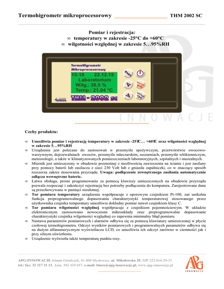 Termohigrometr mikroprocesorowy ____________________ THM 2002 SC ______________________________________________________________ Pomiar i rejestracja: • temperatury w zakresie -25°C do +60°C • wilgotności względnej w zakresie 5…95%RH ____________________________ Cechy produktu: • • • • • • • • Umożliwia pomiar i rejestrację temperatury w zakresie -25°°C… +60°°C oraz wilgotności względnej w zakresie 5…95%RH Urządzenie jest polecane do zastosowań w przemyśle spożywczym, przetwórstwie owocowowarzywnym, dojrzewalniach owoców, przemyśle mleczarskim, suszarniach, przemyśle włókienniczym, meteorologii, a także w klimatyzowanych pomieszczeniach laboratoryjnych, szpitalnych i muzealnych. Miernik jest umieszczony w obudowie przenośnej z możliwością zawieszenia na ścianie i jest zasilany przy pomocy baterii lub zasilacza z sieci 230 Volt lub z gniazda zapalniczki, co w znaczący sposób rozszerza zakres stosowania przyrządu. Uwaga: podłączenie zewnętrznego zasilania automatycznie odłącza wewnętrzne baterie. Łatwa obsługa, proste programowanie za pomocą klawiszy umieszczonych na obudowie przyrządu pozwala rozpocząć i zakończyć rejestrację bez potrzeby podłączenia do komputera. Zarejestrowane dane są przechowywane w pamięci nieulotnej. Tor pomiaru temperatury urządzenia współpracuje z oporowym czujnikiem Pt-100, zaś unikalna funkcja preprogramowalnego dopasowania charakterystyki temperaturowej stosowanego przez użytkownika czujnika temperatury umożliwia dokładny pomiar nawet czujnikiem klasy C. Tor pomiaru wilgotności względnej współpracuje z czujnikiem pojemnościowym. W układzie elektronicznym zastosowano nowoczesne mikroukłady oraz preprogramowalne dopasowanie charakterystyki czujnika wilgotności względnej co zapewnia minimalny błąd pomiaru. Nastawa parametrów pomiarowych i alarmów odbywa się za pomocą klawiatury umieszczonej w płycie czołowej termohigrometru. Odczyt wyników pomiarowych i programowalnych parametrów odbywa się na dużym alfanumerycznym wyświetlaczu LCD, co umożliwia ich odczyt zarówno w ciemności jak i przy silnym oświetleniu. Urządzenie wyświetla także temperaturę punktu rosy. ___________________________________________________________________________________ APG-INNOWACJE Jolanta Góralczyk, 41-400 Mysłowice, ul. Mikołowska 29, NIP 222-016-29-35 tel./ fax: 32 317 31 13, kom. 502 430 657, e-mail: [email protected], www.apg-innowacje.pl ___________________ Termohigrometr mikroprocesorowy ____________________ THM 2002 SC ______________________________________________________________ Dane techniczne: Wejście toru pomiaru temperatury: .................................................................. Czujnik Pt - 100 klasa B Wejście toru pomiaru wilgotności względnej:.................................................. Czujnik pojemnościowy Zakres pomiaru temperatury:.................................................................................... -25°°C do +60°°C Zakres pomiaru wilgotności względnej: ................................................................................ 5 do 95% Rozdzielczość pomiaru temperatury/wilgotności:................................................................. 0,1°C/0,5% Dokładność pomiaru temperatury:............................................................ +0,4 % zakresu pomiarowego Dokładność pomiaru wilgotności względnej:........................................ + 5% w temperaturze kalibracji Kalibracja przyrządu: .................................... wykonywana przez Producenta w komorze klimatycznej Interwał czasowy rejestracji wyników pomiarowych: ....... od 1 minuty do 99 godzin (programowalny) Ilość zapisów do pamięci wewnętrznej: ...................................................................................... 50 000 Odczyt na wyświetlaczu: …………………..wartości chwilowych oraz maksymalnych i minimalnych Sposób rejestracji wyników pomiarowych (programowalny): ……………………pamięć wewnętrzna Komunikacja z komputerem: ……......................... RS - 232 (komunikacja na odległość do 3 metrów) USB (komunikacja na odległość do 2 metrów) WiFi (poprzez router i zewnętrzny modem 3G) Komunikacja z drukarką kieszonkową PORTI S30/40……………………………………….RS - 232 Sposób wydruku na drukarce podłączonej do komputera:............ tabelarycznie lub w formie wykresu Obudowa: .............................................................................................. plastikowa w kolorze czarnym Zasilanie przyrządu: ......................................................................... 6 Volt dc (dwie baterie 3 Volt) Wymiary: ...................................................................................................... D 165 x W 80 x G 22 mm Dodatkowe informacje: • gwarancja 12 miesięczna • serwis gwarancyjny i pogwarancyjny • Świadectwo Wzorcowania Urzędu Miar RP dostarczane razem z przyrządem I. Zestaw podstawowy 1. TermoHigrometr Mikroprocesorowy THM-2002 SC wraz z głowicą pomiarową ( zestaw obejmuje: miernik, głowicę pomiarową, kabel do głowicy ok. 1 metr z wtykami, komplet baterii ) OPCJA: wzorcowanie w Głównym Urzędzie Miar RP 2. Opcje zasilania ( do wyboru ): Uwaga: podłączenie zewnętrznego zasilania automatycznie odłącza wewnętrzne baterie. - zasilacz sieciowy 230 Volt - kabel zasilania z gniazda zapalniczki samochodu - listwa ochronna z filtrem EMC i ochroną przeciwprzepięciową ( przy 230 V) ___________________________________________________________________________________ APG-INNOWACJE Jolanta Góralczyk, 41-400 Mysłowice, ul. Mikołowska 29, NIP 222-016-29-35 tel./ fax: 32 317 31 13, kom. 502 430 657, e-mail: [email protected], www.apg-innowacje.pl ___________________ Termohigrometr mikroprocesorowy ____________________ THM 2002 SC _____________________________________________________