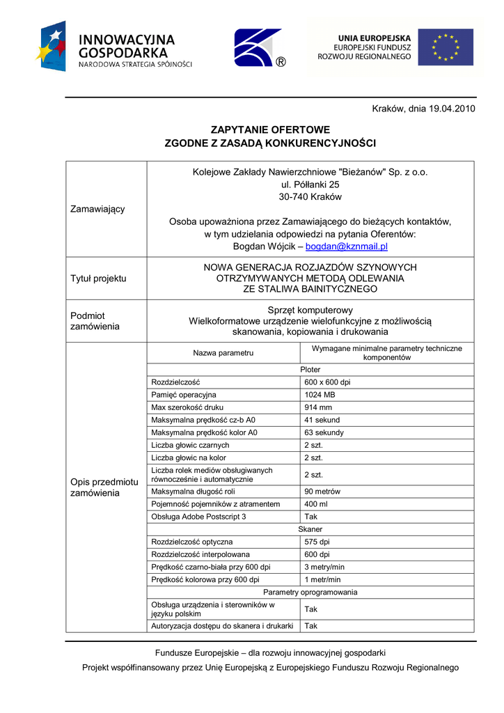 Kraków, dnia 19.04.2010 ZAPYTANIE OFERTOWE ZGODNE Z ZASADĄ KONKURENCYJNOŚCI Kolejowe Zakłady Nawierzchniowe "Bieżanów" Sp. z o.o. ul. Półłanki 25 30-740 Kraków Zamawiający Osoba upoważniona przez Zamawiającego do bieżących kontaktów, w tym udzielania odpowiedzi na pytania Oferentów: Bogdan Wójcik – [email protected] NOWA GENERACJA ROZJAZDÓW SZYNOWYCH OTRZYMYWANYCH METODĄ ODLEWANIA ZE STALIWA BAINITYCZNEGO Tytuł projektu Podmiot zamówienia Sprzęt komputerowy Wielkoformatowe urządzenie wielofunkcyjne z możliwością skanowania, kopiowania i drukowania Wymagane minimalne parametry techniczne komponentów Nazwa parametru Ploter Opis przedmiotu zamówienia Rozdzielczość 600 x 600 dpi Pamięć operacyjna 1024 MB Max szerokość druku 914 mm Maksymalna prędkość cz-b A0 41 sekund Maksymalna prędkość kolor A0 63 sekundy Liczba głowic czarnych 2 szt. Liczba głowic na kolor 2 szt. Liczba rolek mediów obsługiwanych równocześnie i automatycznie 2 szt. Maksymalna długość roli 90 metrów Pojemność pojemników z atramentem 400 ml Obsługa Adobe Postscript 3 Tak Skaner Rozdzielczość optyczna 575 dpi Rozdzielczość interpolowana 600 dpi Prędkość czarno-biała przy 600 dpi 3 metry/min Prędkość kolorowa przy 600 dpi 1 metr/min Parametry oprogramowania Obsługa urządzenia i sterowników w języku polskim Tak Autoryzacja dostępu do skanera i drukarki Tak Fundusze Europejskie – dla rozwoju innowacyjnej gospodarki Projekt współfinansowany przez Unię Europejską z Europejskiego Funduszu Rozwoju Regionalnego Możliwość konfiguracji pozwalającej na określenie kosztów na użytkownika, dział lub projekt. Tak Materiały eksploatacyjne jakie powinny być dostarczone z urządzeniem Opis przedmiotu zamówienia Zestaw głowica + atrament czarny 400 ml 3 zestawy Zestaw głowica + atrament kolor 400 ml 6 zestawów po 2 zestawy na każdy kolor Zestaw gniazd czyszczących głowice 2 zestawy Gwarancja 12-miesięczna na części i robociznę w miejscu eksploatacji. Czas reakcji serwisu - do końca następnego dnia roboczego. Firma serwisująca musi posiadać ISO 9001:2000 na świadczenie usług serwisowych. Termin realizacji Do 30.04.2010 do 12:00 Forma płatności Przelew 7 dni, na podstawie wystawionej faktury Koszty dostawy (jeżeli dotyczy) Kryteria oceny oferty W cenie Cena 100% Sposób realizacji Jednorazowo Termin składania oferty 22.04.2010 do godziny 15:00 Sposób składania oferty Osobiście lub pocztą elektroniczną na adres: [email protected] Sposób przygotowania oferty W języku polskim, formie pisemnej lub dokumentu elektronicznego DOC lub PDF. Oferta powinna być złożona w walucie PLN w wartościach netto. Oferta powinna być sporządzona zgodnie ze wzorem formularza ofertowego (w załączniku). Fundusze Europejskie – dla rozwoju innowacyjnej gospodarki Projekt współfinansowany przez Unię Europejską z Europejskiego Funduszu Rozwoju Regionalnego