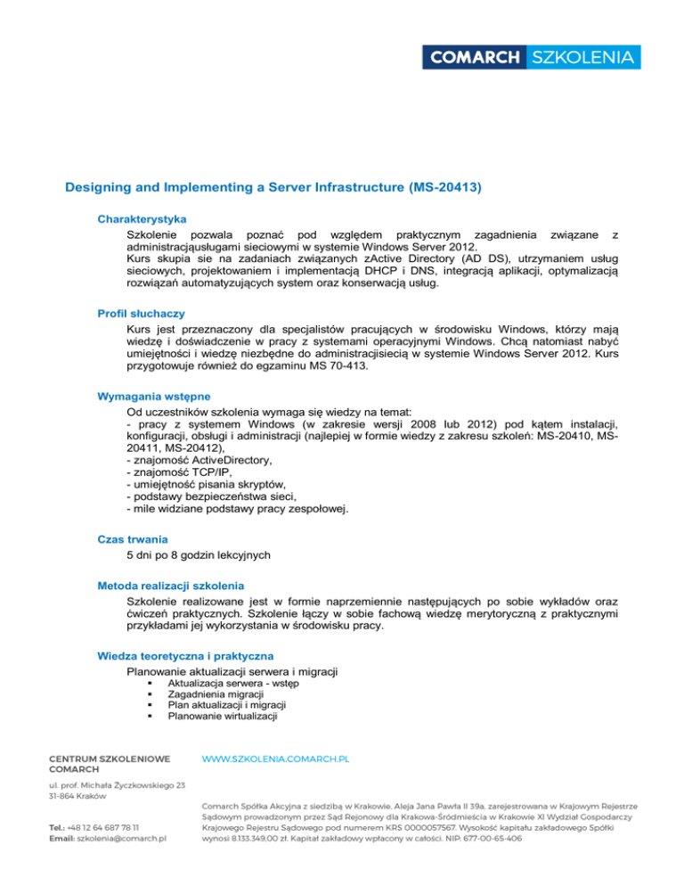 Designing and Implementing a Server Infrastructure (MS-20413) Charakterystyka Szkolenie pozwala poznać pod względem praktycznym zagadnienia związane z administracjąusługami sieciowymi w systemie Windows Server 2012. Kurs skupia sie na zadaniach związanych zActive Directory (AD DS), utrzymaniem usług sieciowych, projektowaniem i implementacją DHCP i DNS, integracją aplikacji, optymalizacją rozwiązań automatyzujących system oraz konserwacją usług. Profil słuchaczy Kurs jest przeznaczony dla specjalistów pracujących w środowisku Windows, którzy mają wiedzę i doświadczenie w pracy z systemami operacyjnymi Windows. Chcą natomiast nabyć umiejętności i wiedzę niezbędne do administracjisiecią w systemie Windows Server 2012. Kurs przygotowuje również do egzaminu MS 70-413. Wymagania wstępne Od uczestników szkolenia wymaga się wiedzy na temat: - pracy z systemem Windows (w zakresie wersji 2008 lub 2012) pod kątem instalacji, konfiguracji, obsługi i administracji (najlepiej w formie wiedzy z zakresu szkoleń: MS-20410, MS20411, MS-20412), - znajomość ActiveDirectory, - znajomość TCP/IP, - umiejętność pisania skryptów, - podstawy bezpieczeństwa sieci, - mile widziane podstawy pracy zespołowej. Czas trwania 5 dni po 8 godzin lekcyjnych Metoda realizacji szkolenia Szkolenie realizowane jest w formie naprzemiennie następujących po sobie wykładów oraz ćwiczeń praktycznych. Szkolenie łączy w sobie fachową wiedzę merytoryczną z praktycznymi przykładami jej wykorzystania w środowisku pracy. Wiedza teoretyczna i praktyczna Planowanie aktualizacji serwera i migracji Aktualizacja serwera - wstęp Zagadnienia migracji Plan aktualizacji i migracji Planowanie wirtualizacji Planowanie i wdrażanie infrastruktury serwera Wybór odpowiedniej strategii wykonania obrazu serwera Wybór strategii automatyzacji wdrażania Wdrażanie strategii Zarządzanie adresami IP oraz ich konfiguracja Projektowanie i wdrażanie DHCP Planowanie i konfiguracja zakresów DHCP Planowanie i wdrażanie IPAM Projektowanie wdrażania rozwiązań DNS Projektowanie strategii wdrażania usług DNS Projektowanie systemu rozwiązywania nazw Projektowanie i wdrażanie stref DNS Projektowanie i konfigurowanie replikacji stref DNS Optymalizacja serwerów DNS Projektowanie zabezpieczeń dla DNS Projektowanie i wdrażanie lasu usługi Active Directory i infrastruktury domeny Projektowanie lasu usługi AD DS Projektowanie i wdrażanie relacji zaufania Projektowanie i wdrażanie domen AD DS Projektowanie przestrzeni nazw DNS w AD DS Projektowanie relacji zaufania w domenach AD DS Projektowanie i wdrażanie infrastruktury jednostek organizacyjnych usługi Active Directory Planowanie modelu delegowania zadań administracyjnych Projektowanie struktury organizacyjnej Projektowanie i wdrażanie strategii grup Active Directory Projektowanie i wdrażanie strategii obiektów zasad grupy Konfiguracja obiektów zasad grupy (Group Policy) Projektowanie i wdrażanie zasad Projektowanie przetwarzania zasad grupy Planowanie zarządzania zasadami grupy Projektowanie i wdrażanie topologii usługi Active Directory Projektowanie i wdrażanie lokacji AD DS Projektowanie replikacji Projektowanie rozmieszczenia kontrolerów domeny Uwagi dotyczące wirtualizacji kontrolerów domeny Planowanie i wdrażanie magazynu Zagadnienia przechowywania Planowanie i wdrażanie iSCSI SAN Planowanie i wdrażanie usług plików Planowania i implementacja systemu DFS Planowanie i wdrażanie BranchCache Planowanie i wdrażanie Dynamic Access Control Projektowanie i wdrażanie usług dostępu do sieci Projektowanie i wdrażanie usług zdalnego dostępu Projektowanie uwierzytelniania RADIUS przy użyciu serwera NPS Projektowanie sieci brzegowej Planowanie i realizacja DirectAccess Projektowanie i wdrażanie ochrony dostępu do sieci Przegląd konstrukcji zabezpieczeń sieci Identyfikacja i zapobieganie zagrożeniom bezpieczeństwa sieci Projektowanie i wdrażanie strategii zapory systemu Windows Projektowanie i wdrażanie infrastruktury ochrony dostępu do sieci Umiejętności Po ukończeniu kursu uczestnicy będą potrafili: Planować uaktualnienia serwera i migracji. Planować i wdrażać infrastrukturę serwera. Projektować, konfigurować i utrzymywać adresację IP. Projektować i wdrażać infrastrukturę lasu w AD DS. Projektować i wdrażać infrastrukturę jednostek organizacyjnych w Active Directory. Tworzyć strategię obiektów zasad grupy (GPO). Projektować i wdrażać topologię AD DS. Zarządzać usługami plików. Projektować i realizować usługę dostępu do sieci. Projektować i wdrażać zabezpieczenia sieci. Ścieżka rozwoju Udział w szkoleniu pozwala zapoznać się z systemem Windows Server 2012 w stopniu umożliwiającym dalszą samodzielną pracę z systemem. Szkolenie nie wyczerpuje jednak wszystkich jego możliwości. W celu dalszego kształcenia umiejętności Windows Server 2012 rekomendujemy udział w następującym szkoleniu: Implementingan Advanced Server Infrastructure