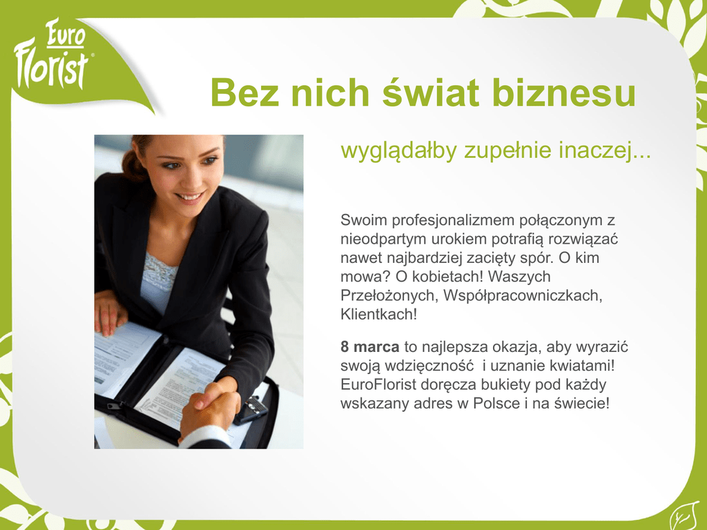 Bez nich świat biznesu wyglądałby zupełnie inaczej... Swoim profesjonalizmem połączonym z nieodpartym urokiem potrafią rozwiązać nawet najbardziej zacięty spór. O kim mowa? O kobietach! Waszych Przełożonych, Współpracowniczkach, Klientkach! 8 marca to najlepsza okazja, aby wyrazić swoją wdzięczność i uznanie kwiatami! EuroFlorist doręcza bukiety pod każdy wskazany adres w Polsce i na świecie! 10 różowych tulipanów 4 kolorowe gerbery Kompozycja fantazyjna Bukiet Motylek Storczyk w naczyniu Bukiet dla Niej Złota Rybka spełnia trzy życzenia. My robimy dla Ciebie znacznie więcej… 100% personalizacji - dołączamy do kwiatów Twoje produkty, sample, foldery, wizytówki… Chyba, że wymyślisz coś innego! Miej pewność! Zapewnimy Ci wsparcie dedykowanego opiekuna. Taniej nie znajdziesz! Ceny niższe od tych, których się spodziewałeś. Szybko, łatwo i przyjemnie. Tak złożysz zamówienie tylko u nas! Choćby samolotem – doręczymy Twój bukiet tego samego dnia! Złóż zapytanie Mieliśmy przyjemność pracować dla: